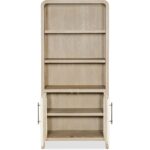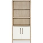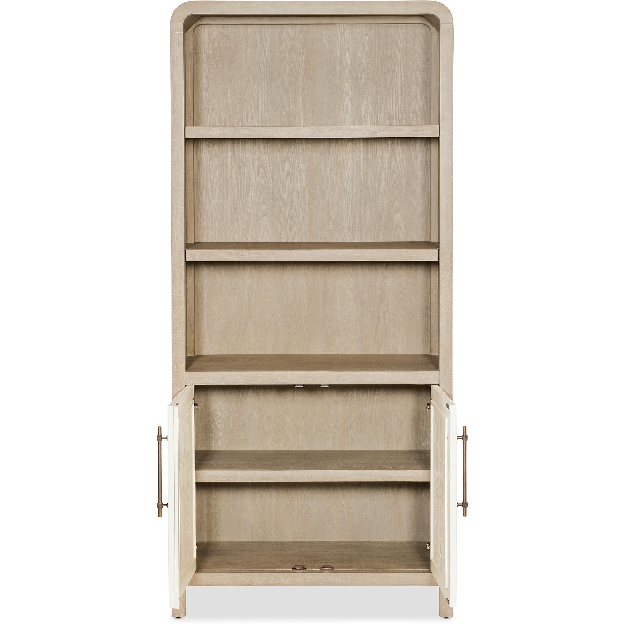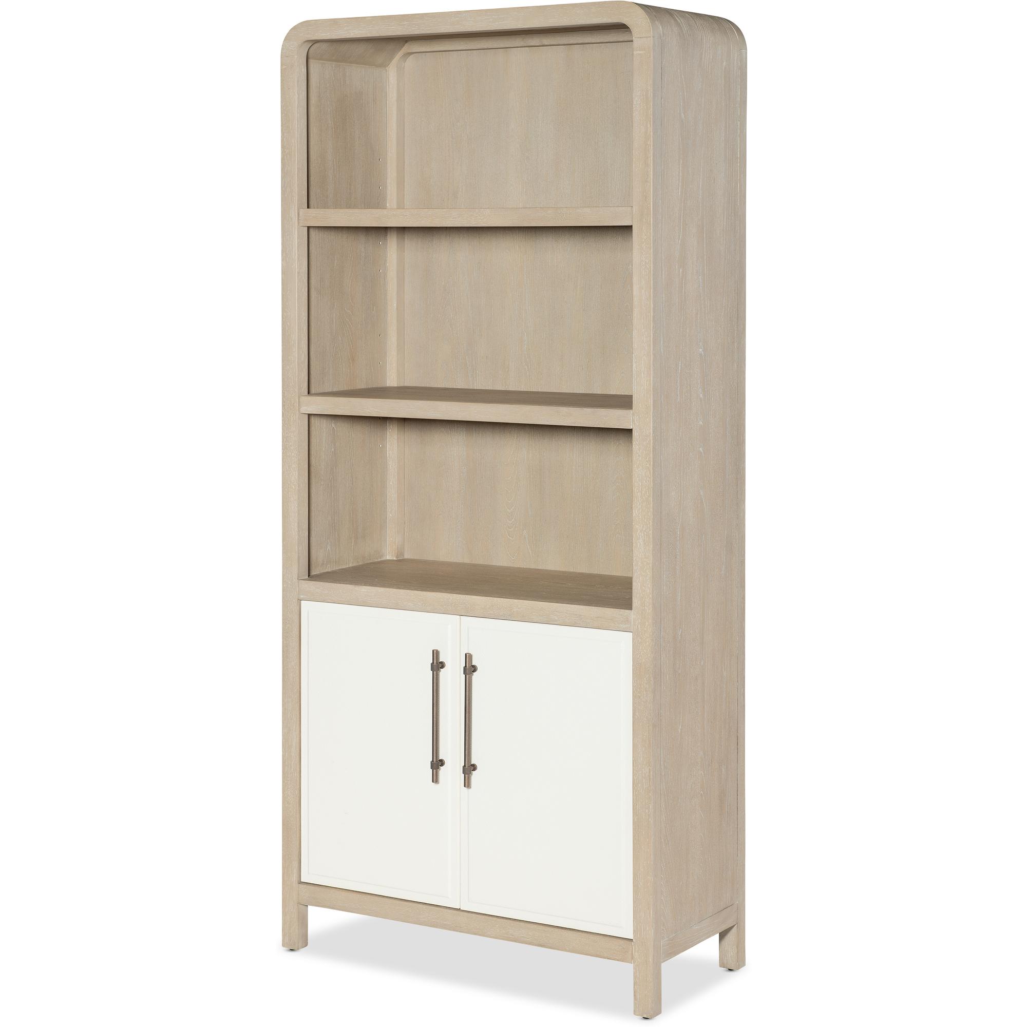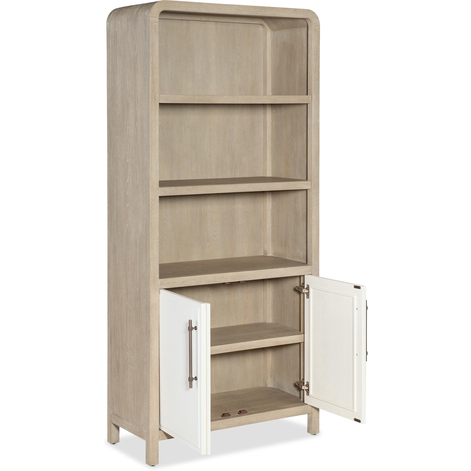 Features: Two-tone finish features elm veneers in a pebble hue with door fronts in a contrasting ivory with leathered texture Two adjustable shelves in the top Two doors in bottom with one adjustable shelf behind doors Rounded top corners