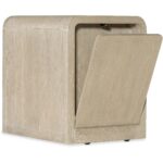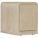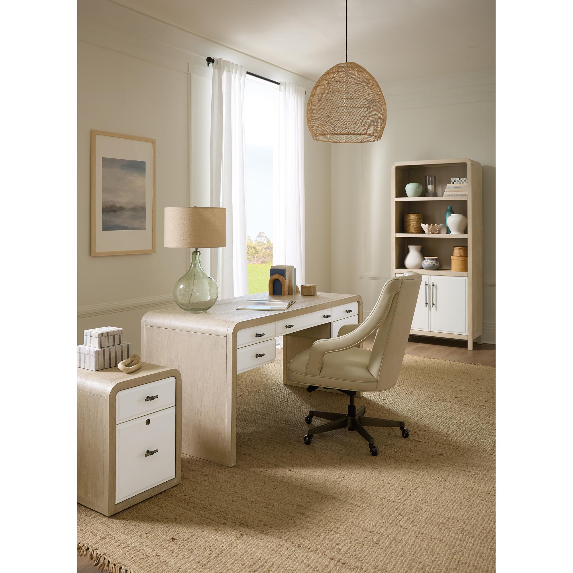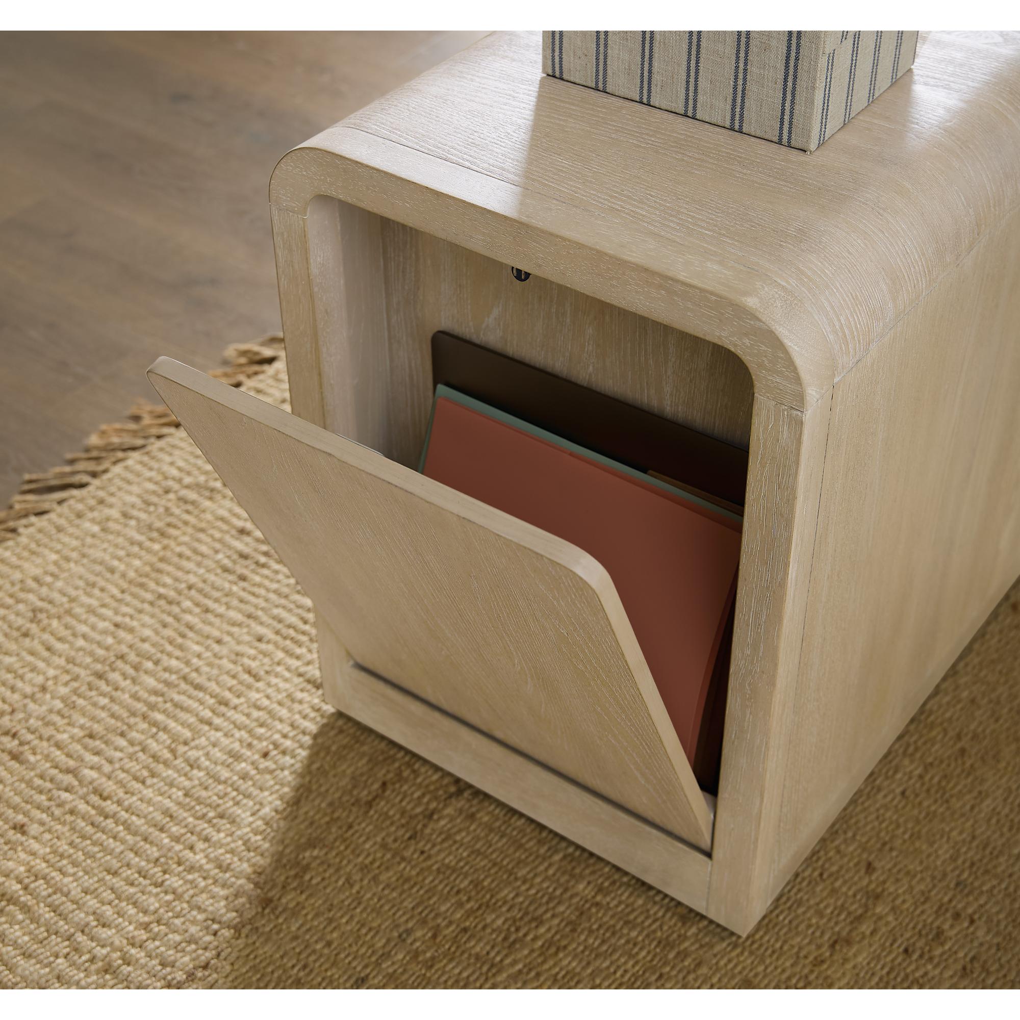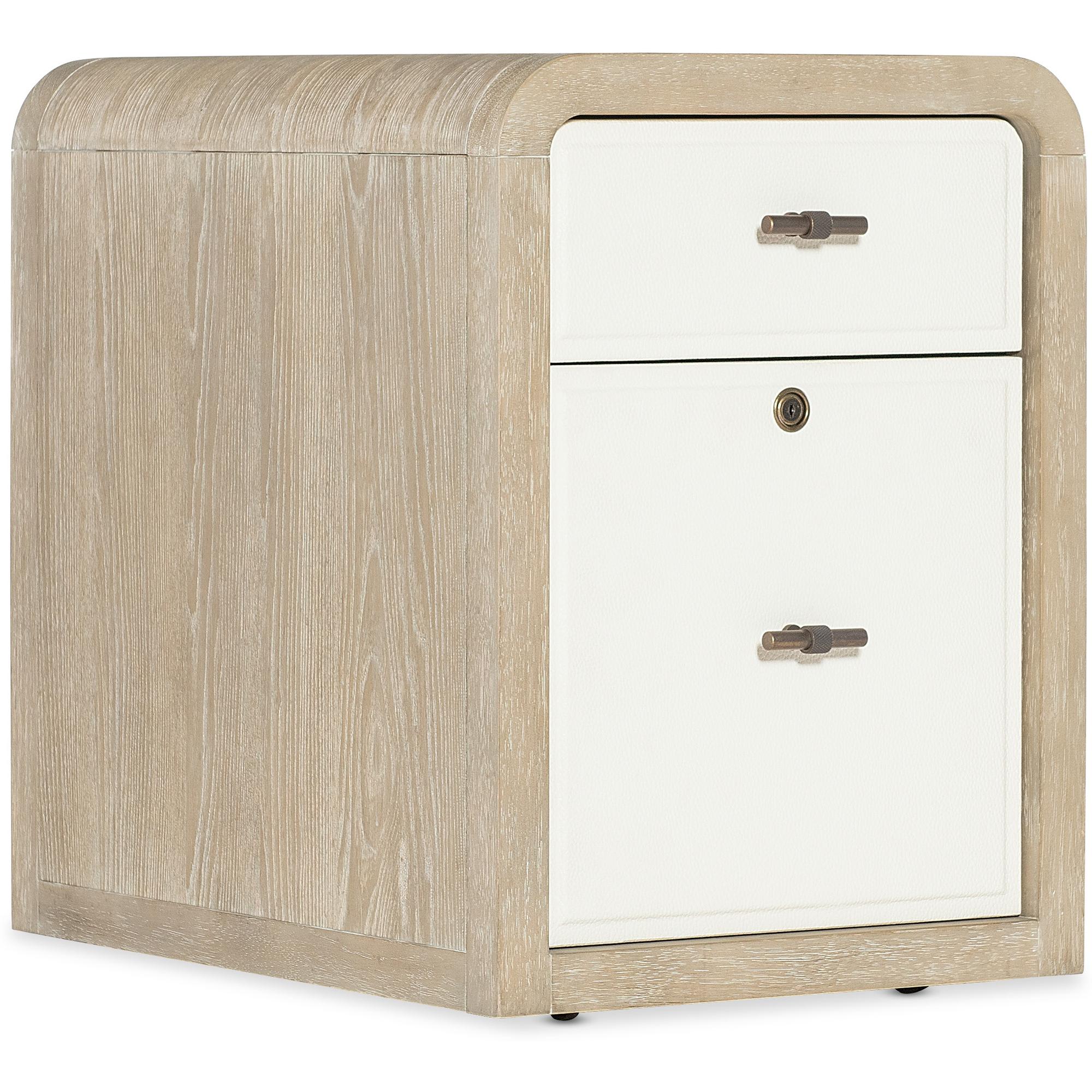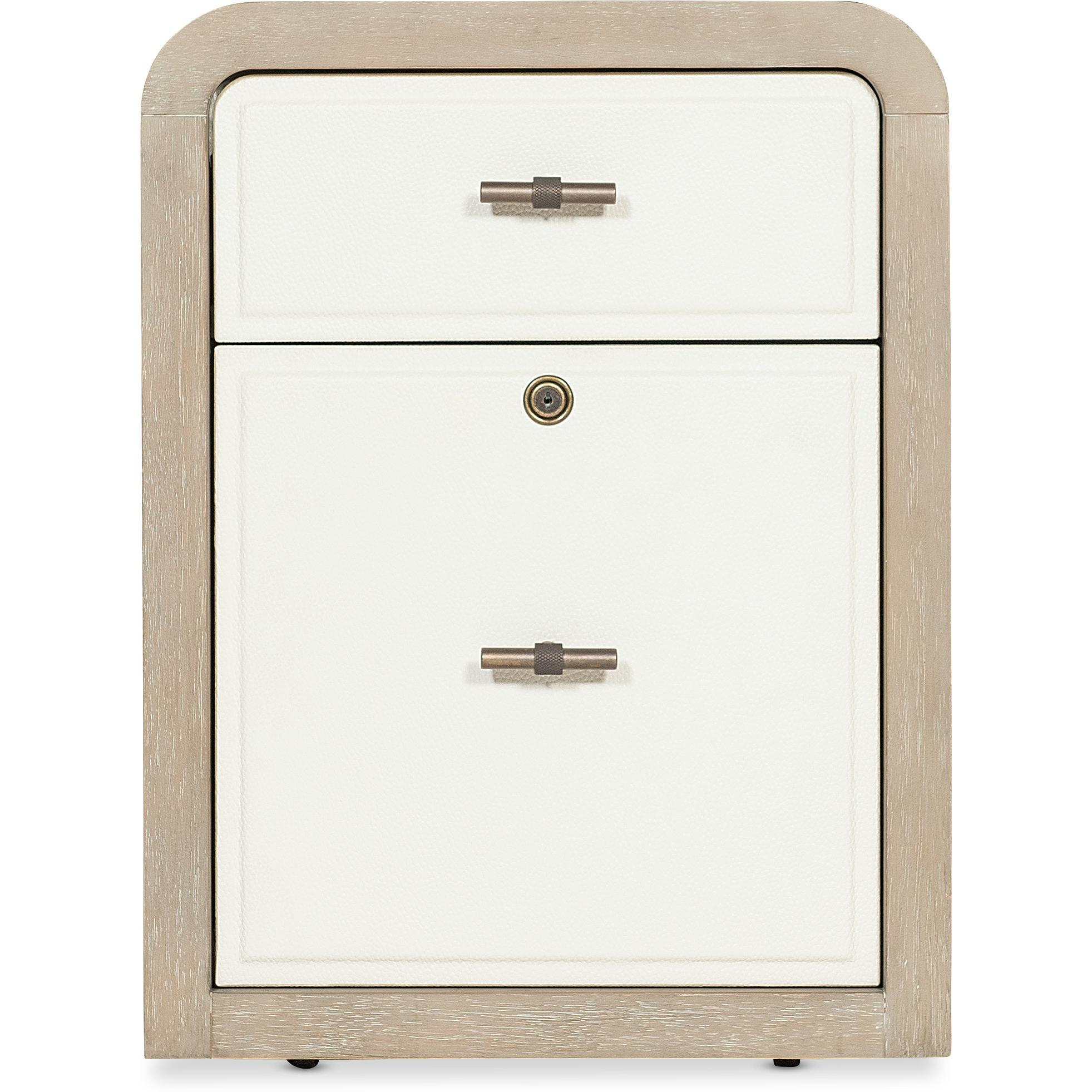 Features: Two-tone finish features elm veneers in a pebble hue with drawer fronts in a contrasting ivory with leathered texture One locking file drawer One utility drawer Hidden storage in back with a drop-down touch latch Rounded top corners Casters