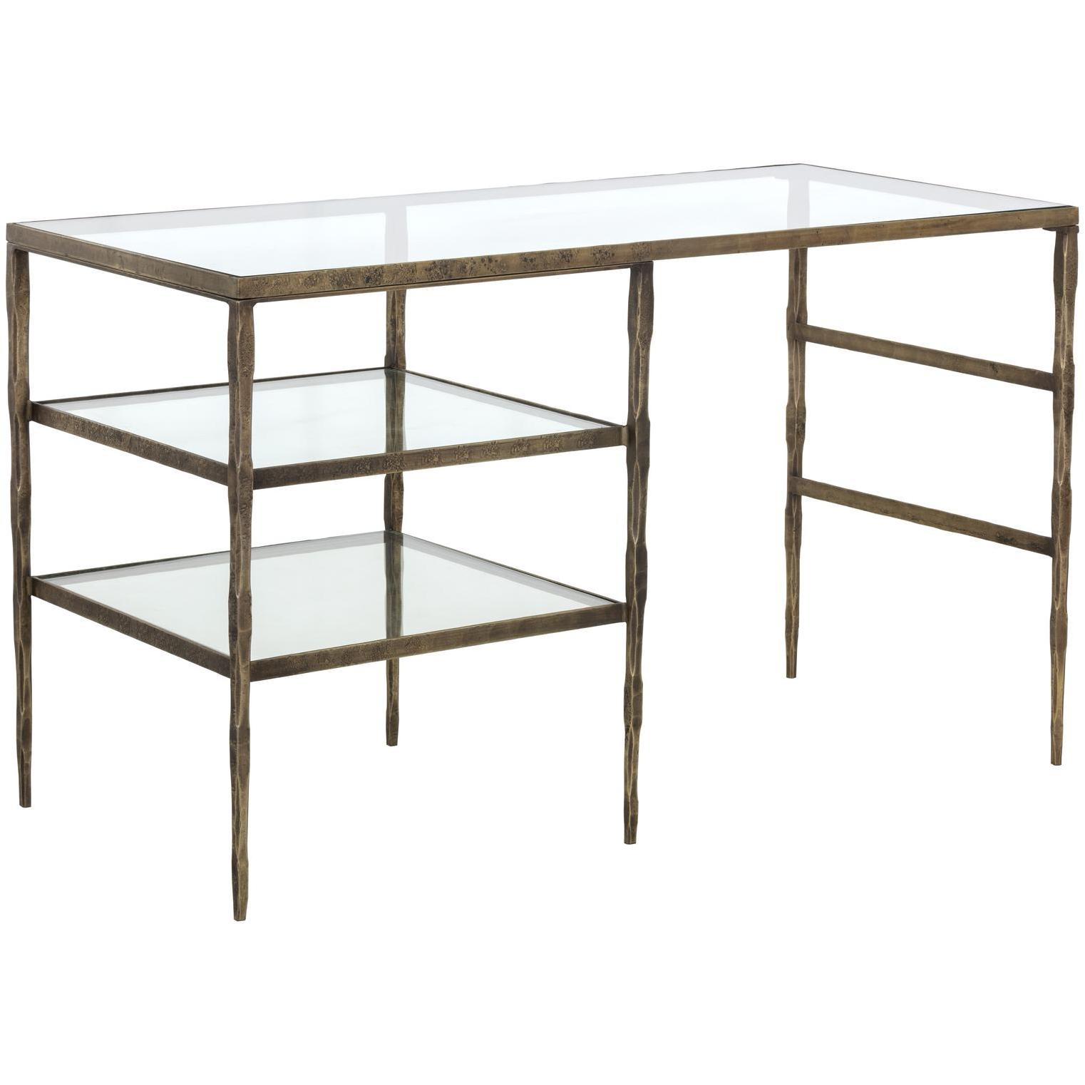 This incredible piece from our Muze collection will bring excitement to any workspace. Inspired by global travels, this desk features a unique hand-hammered steel frame with an antique brass finish. A clear glass top and two shelves provide ample storage. Made in India: With refined craftsmanship, this design was brought to life by skilled local artisans. By nature, these materials develop unique imperfections such as fissures, markings and colour variations for a truly one-of-a-kind piece.
