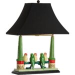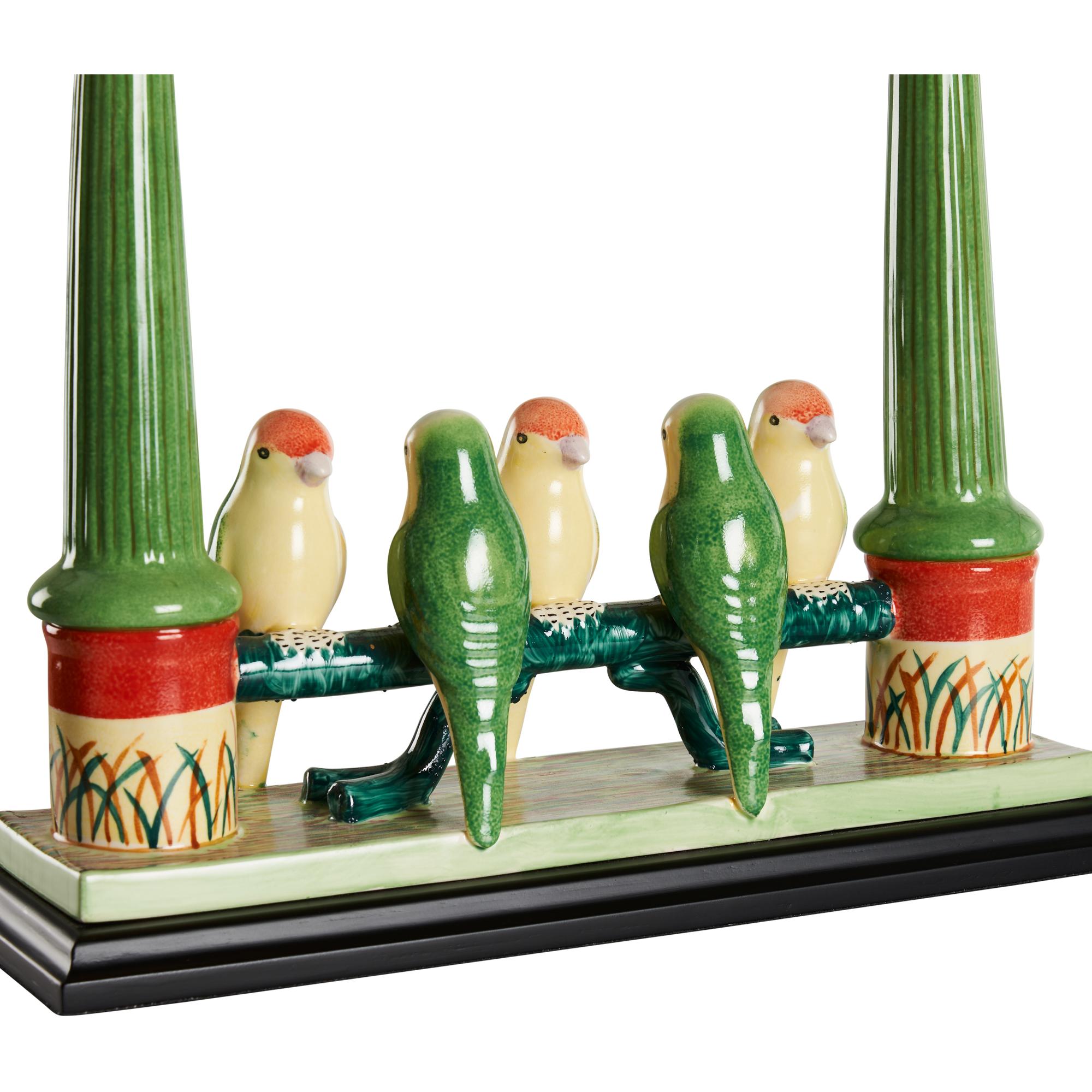 Add a touch of nature to your home with this delightful Budgies Lamp. Crafted of hand painted and glazed fired ceramic, five colorful parakeets are perched upon a fence. A black shade and ball finial top the design and direct light throughout your space. The Newport Mansion collection (green, yellow, orange)