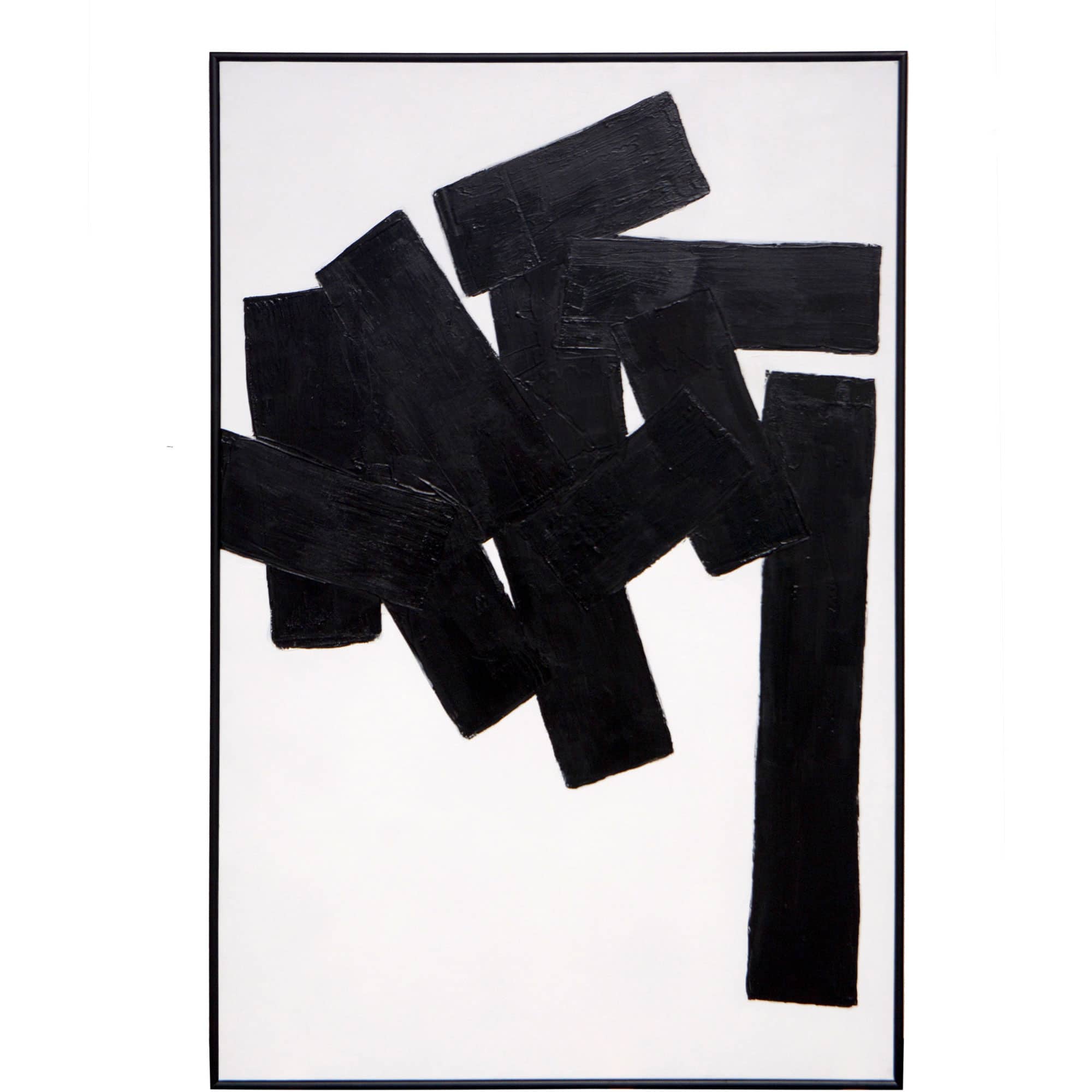 This contrasting painting features black rectangular blocks stacked in varying configurations, offering visual movement and intrigue. Features a black finished wood floater frame. Each artwork is hand-painted and will feature slight variations that make every piece unique.