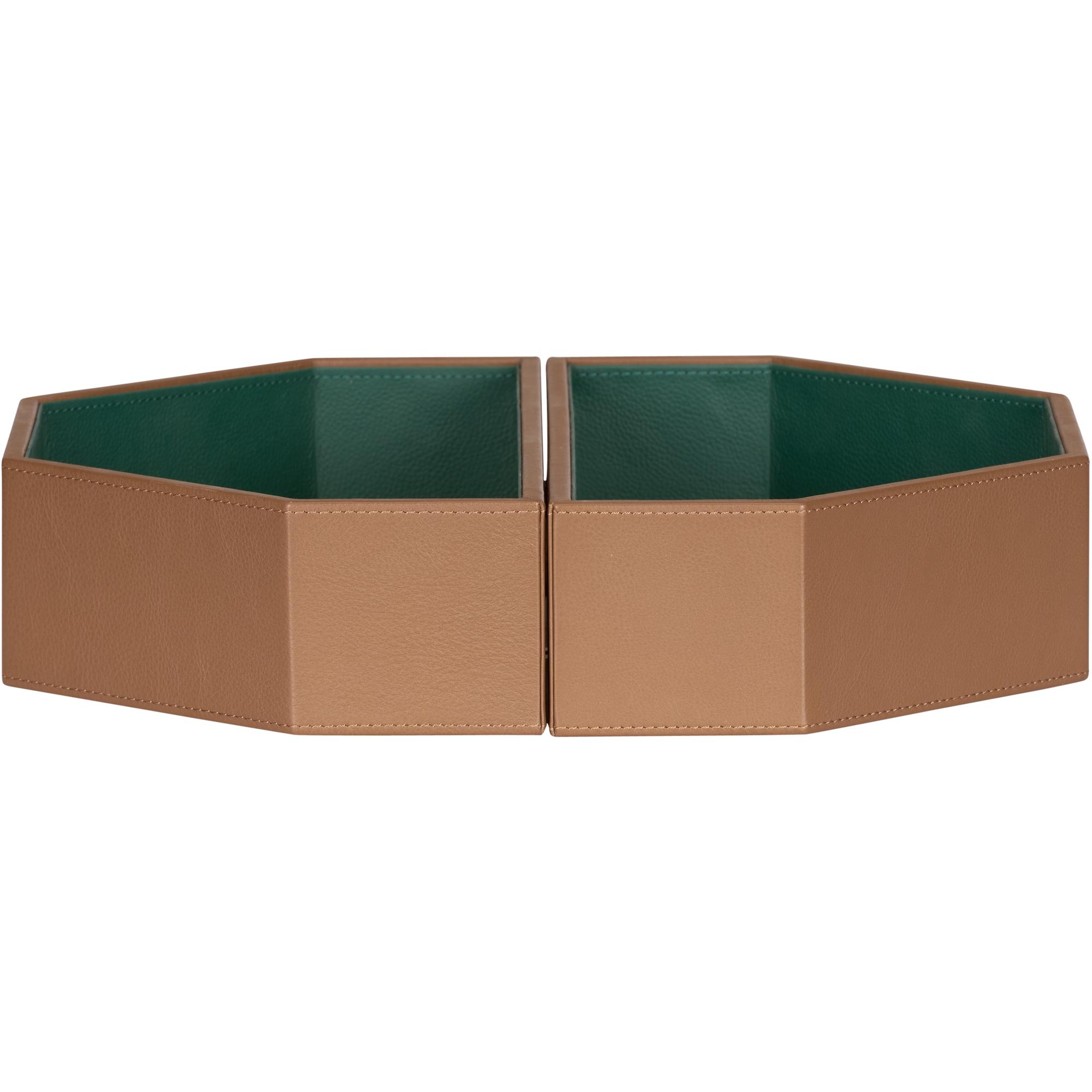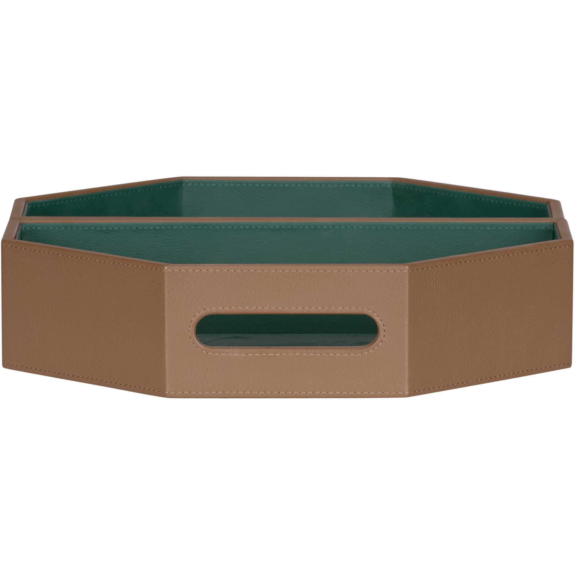 The Burke Tray is a sophisticated and versatile two-piece tray, featuring a brown leather exterior and a rich green leather interior for a refined contrast. Its geometric design and functional handles make it a stylish and practical addition to any space, perfect for organizing or serving.