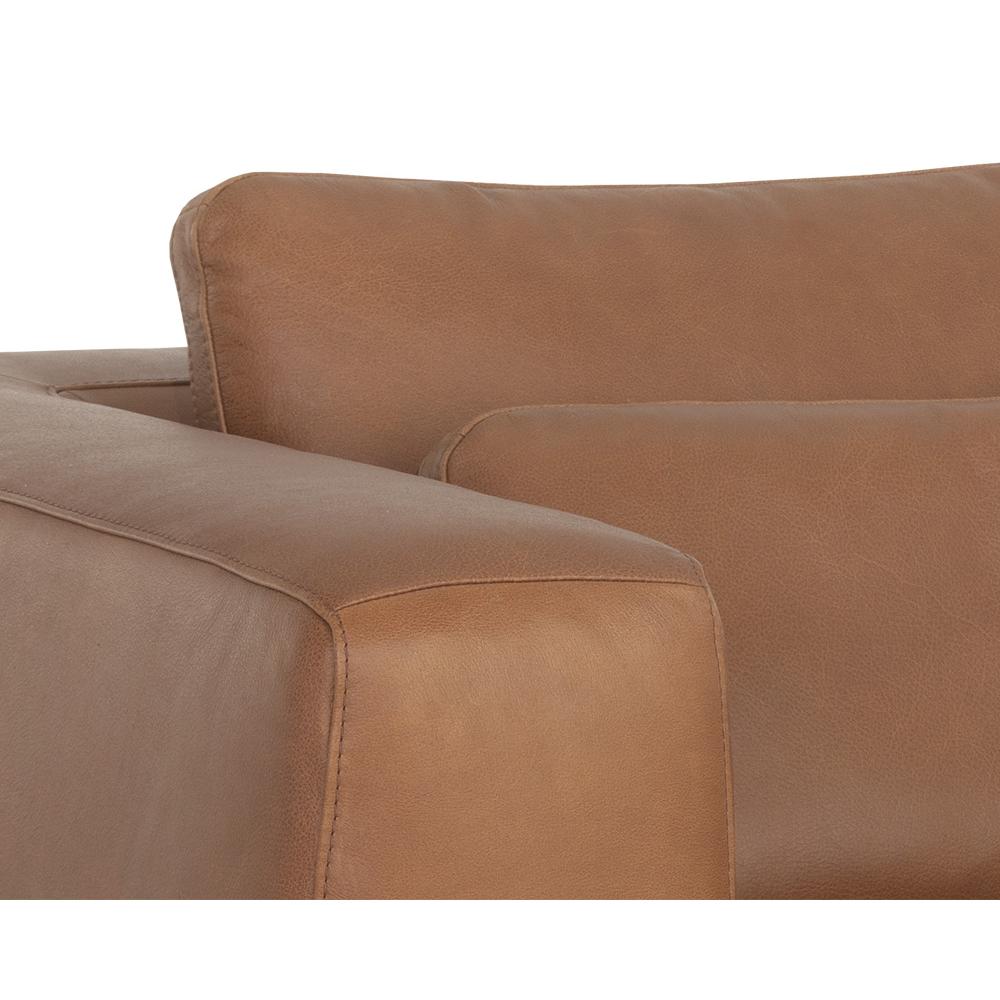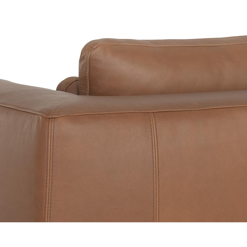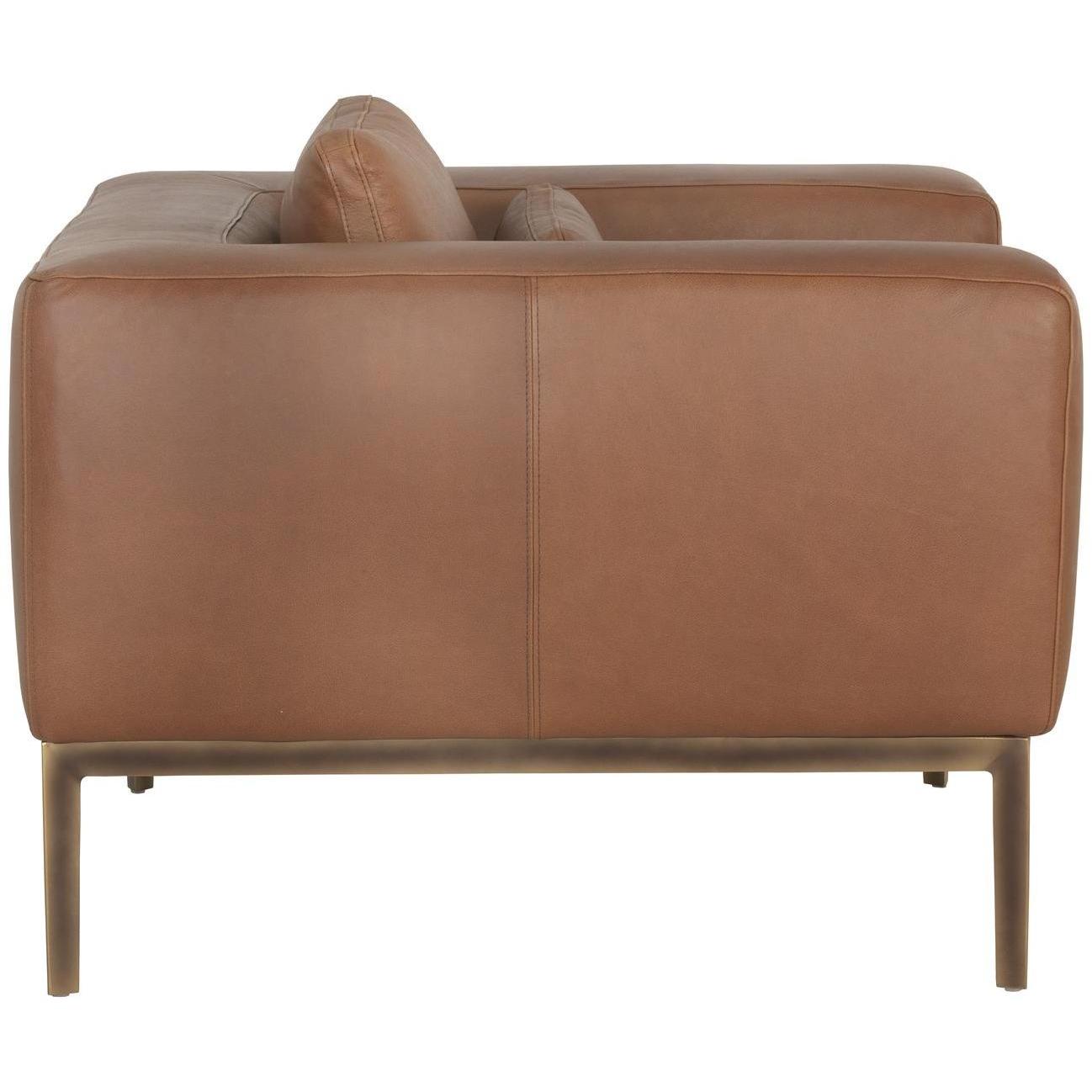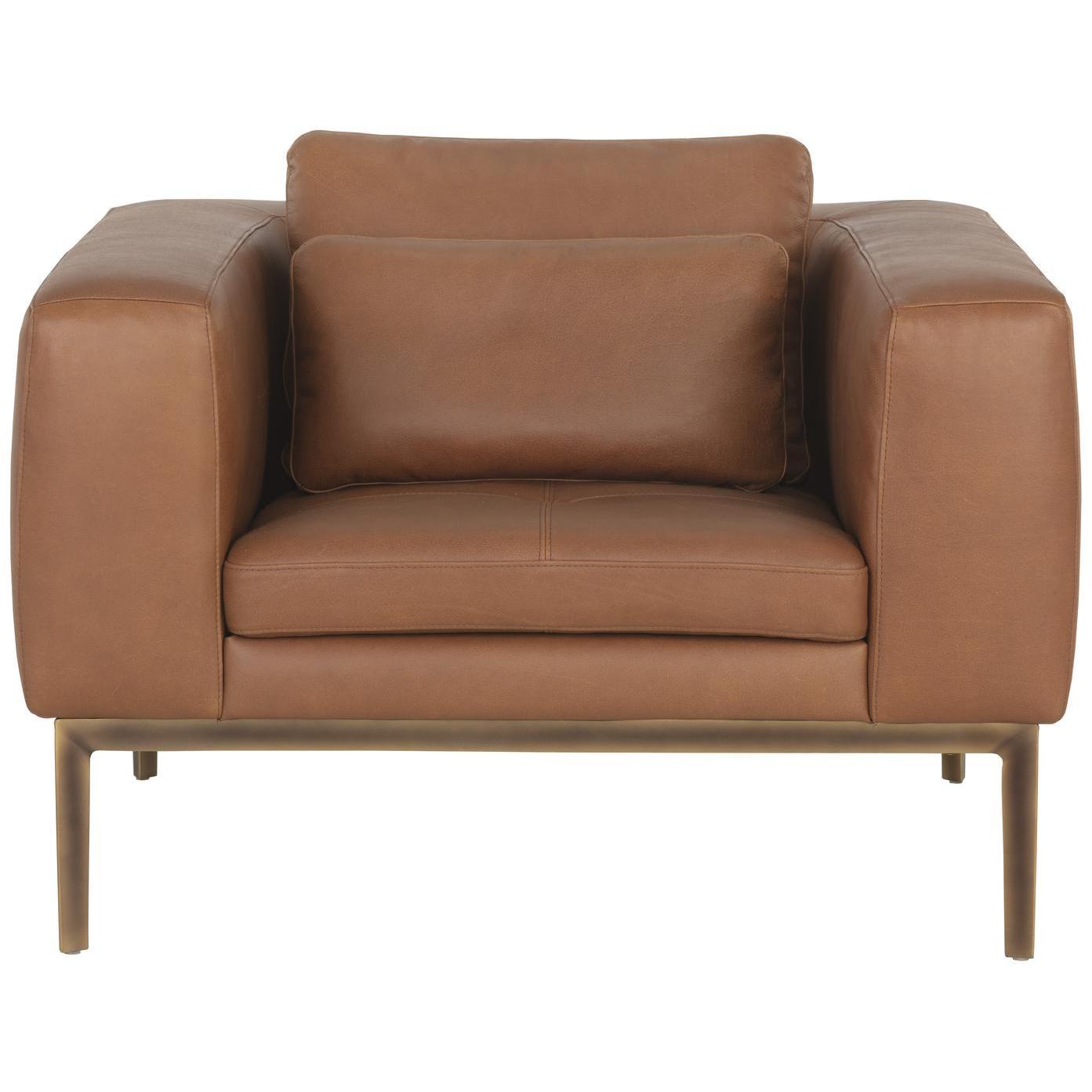 A masculine armchair with a modern design. Features an oversized seat and armrests with rustic bronze feet. Stocked in behike saddle leather. Can be paired with coordinating sofa. Handle with Care: This design has been crafted with leather. Leather is a natural material; as such markings, wrinkles, grooves and light scratches are acceptable and appreciated characteristics. No two pieces are alike. Visit our Product Care page for more information on how to ensure the lasting beauty of this piece.