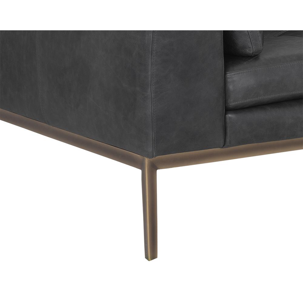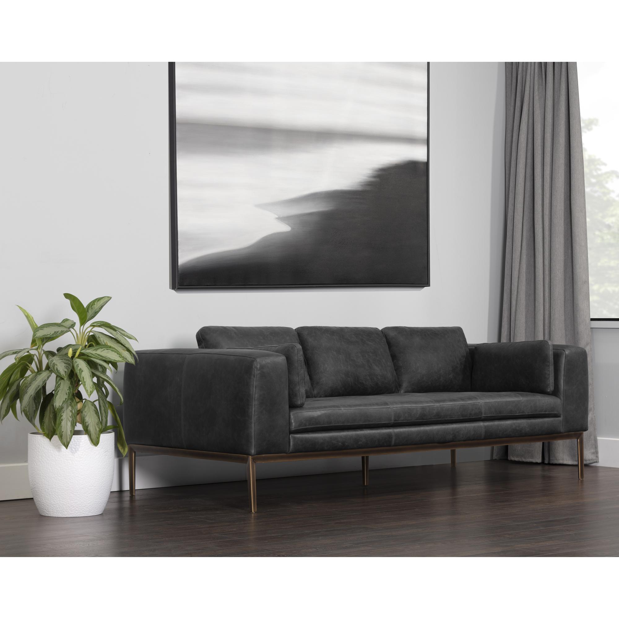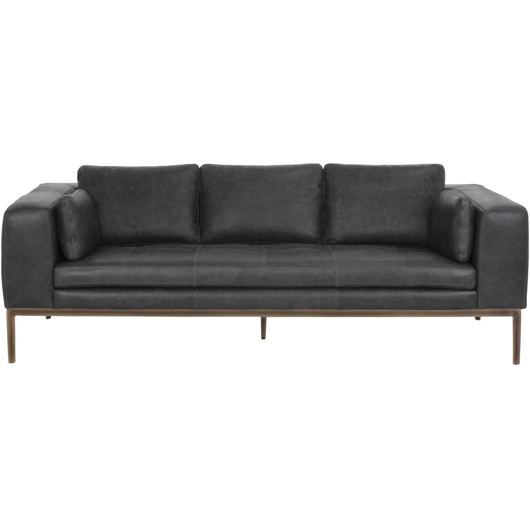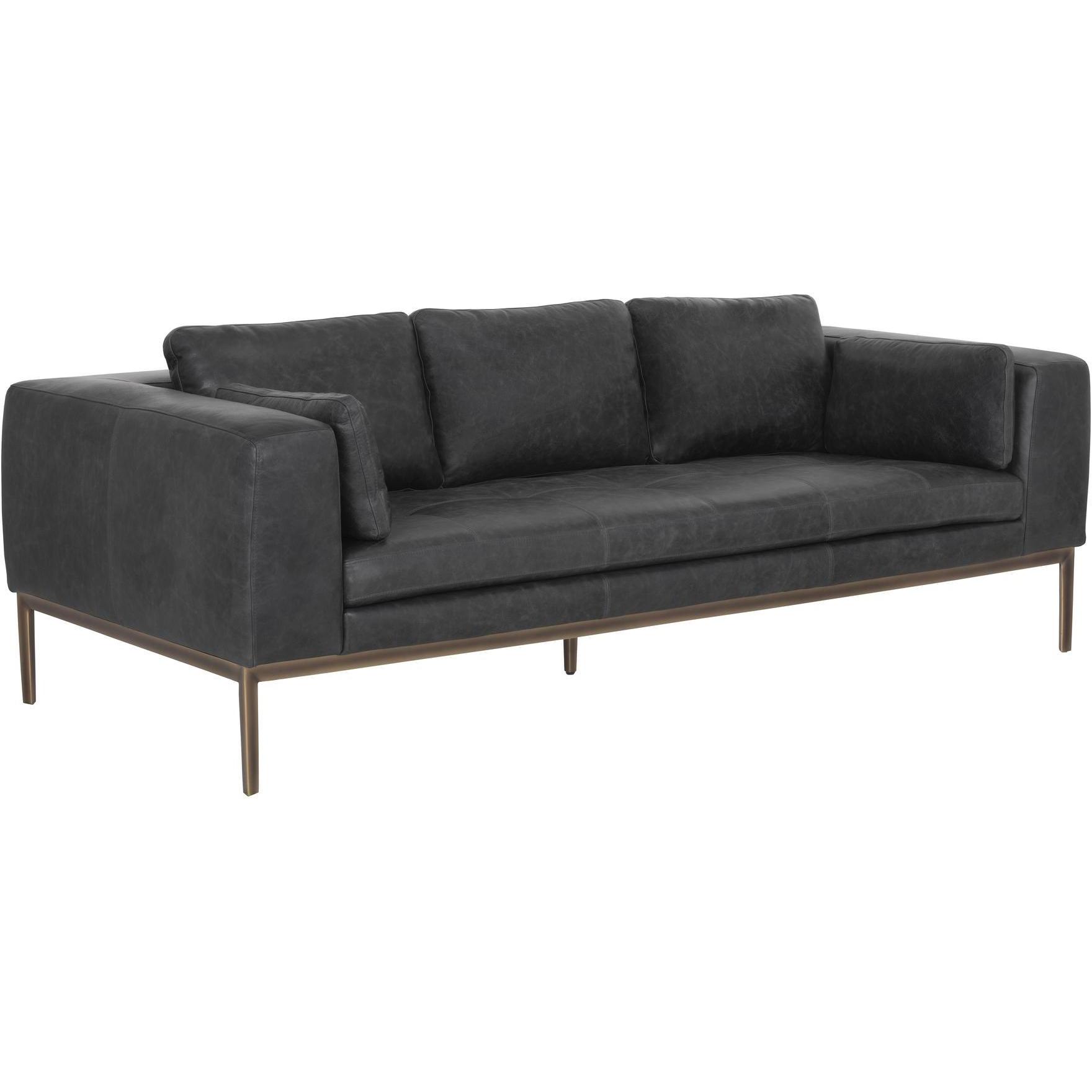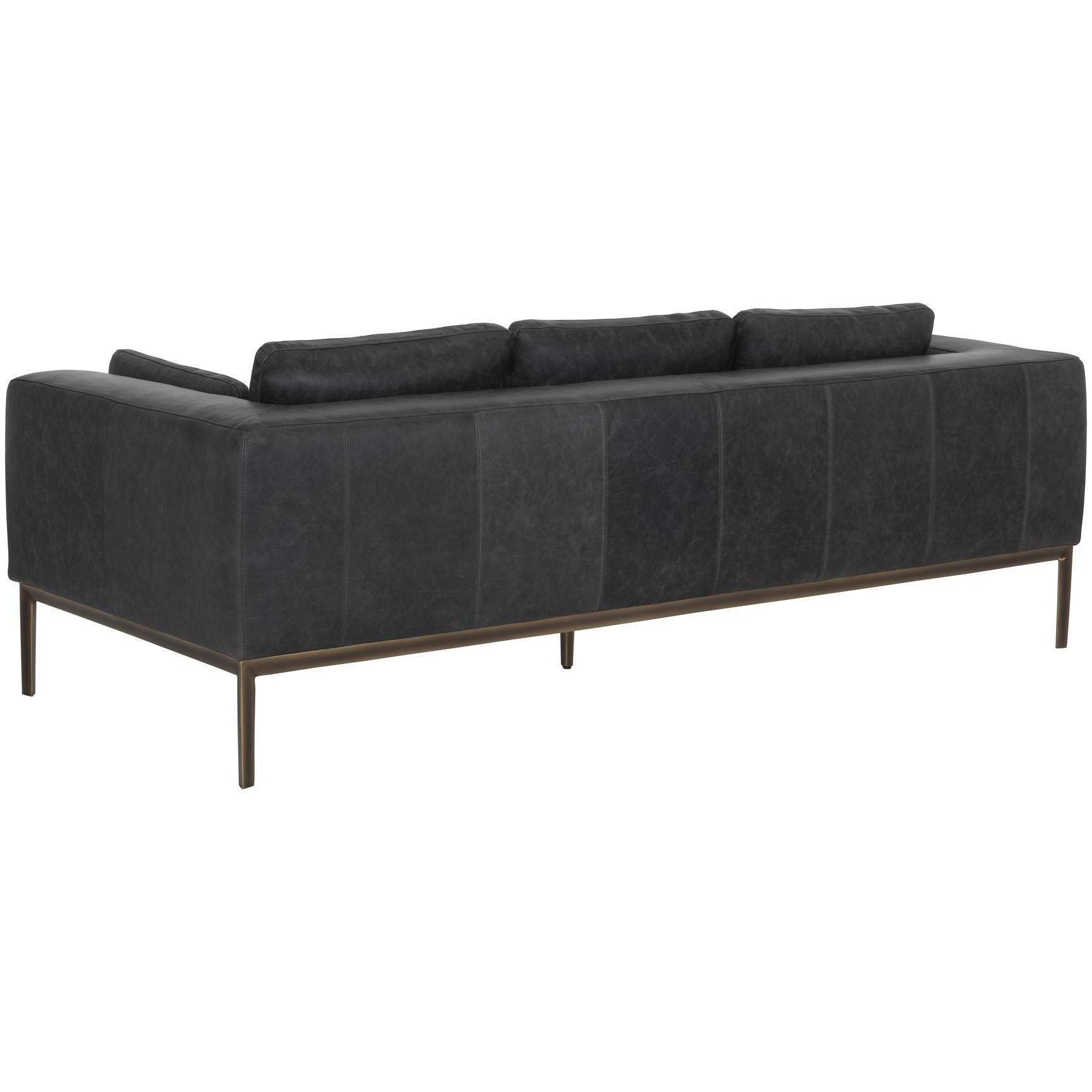 A masculine sofa with a modern design. Features an oversized seat and armrests with antique brass feet. Stocked in serbia black leather. Handle with Care: This design has been crafted with leather. Leather is a natural material; as such markings, wrinkles, grooves and light scratches are acceptable and appreciated characteristics. No two pieces are alike.