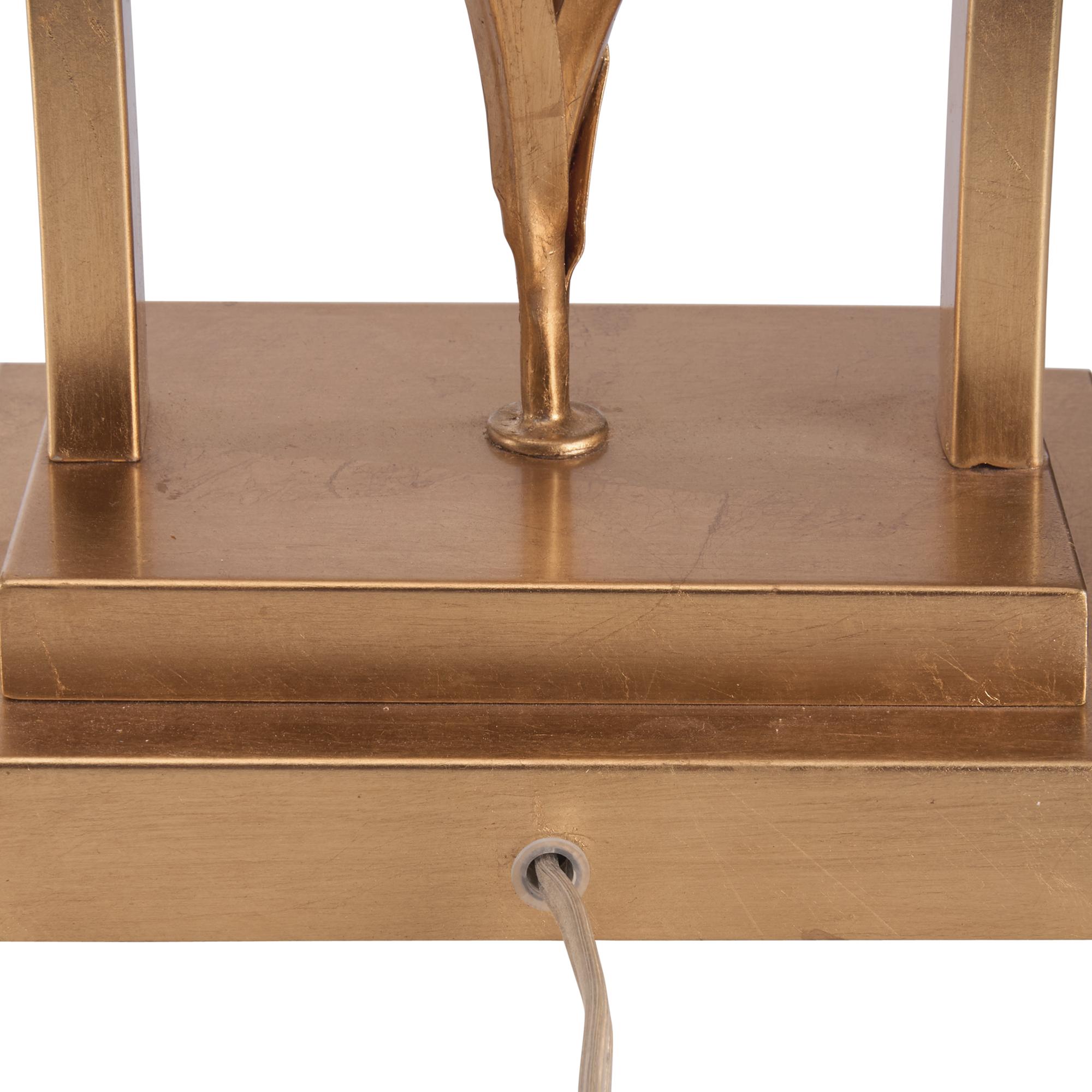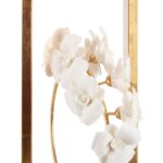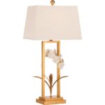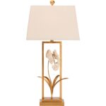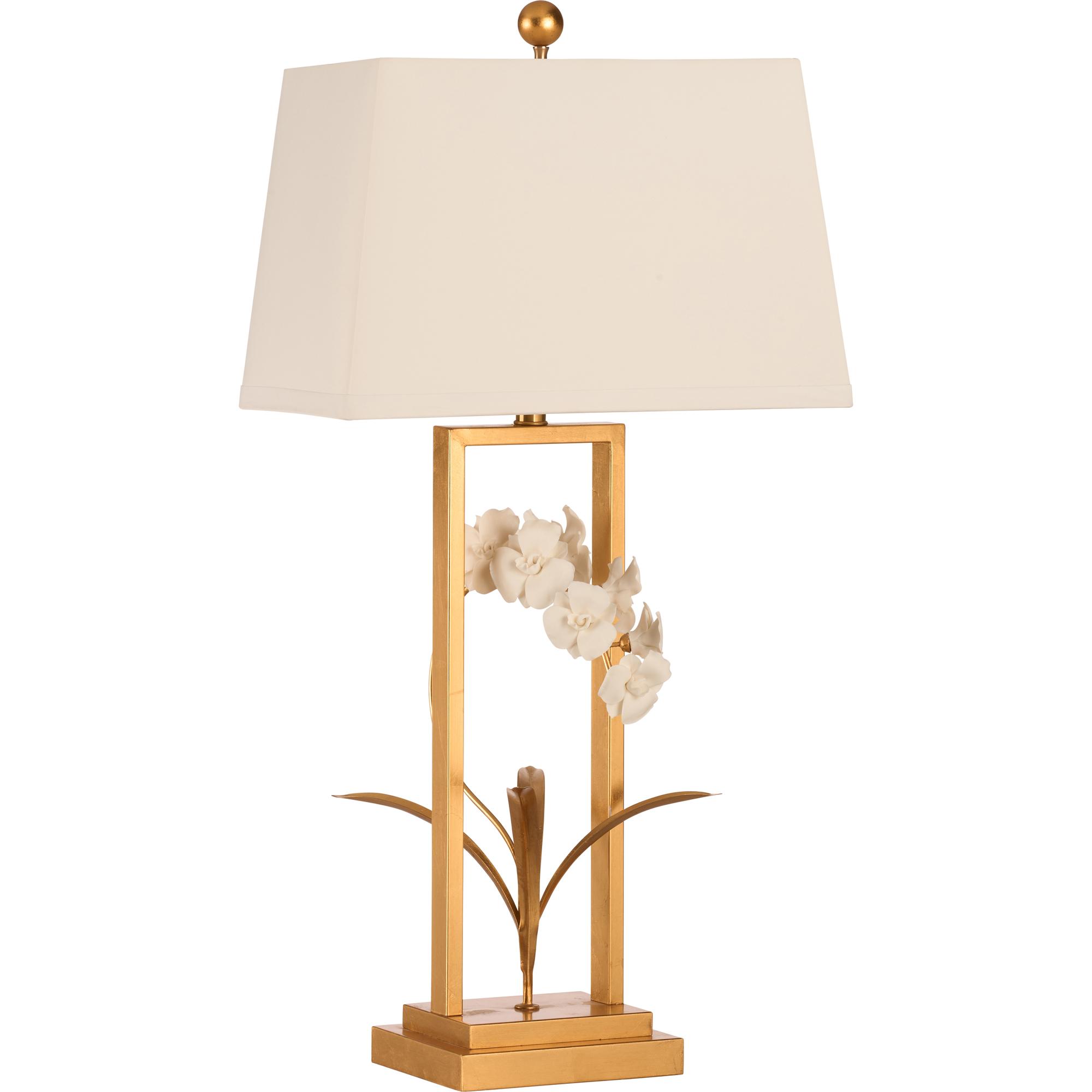 This elegant lamp showcases a delicate porcelain orchid perched on a gold stem with sculpted leaves, all encased in a graceful gold border, blending floral beauty with refined sophistication. Designed by Bill Cain.