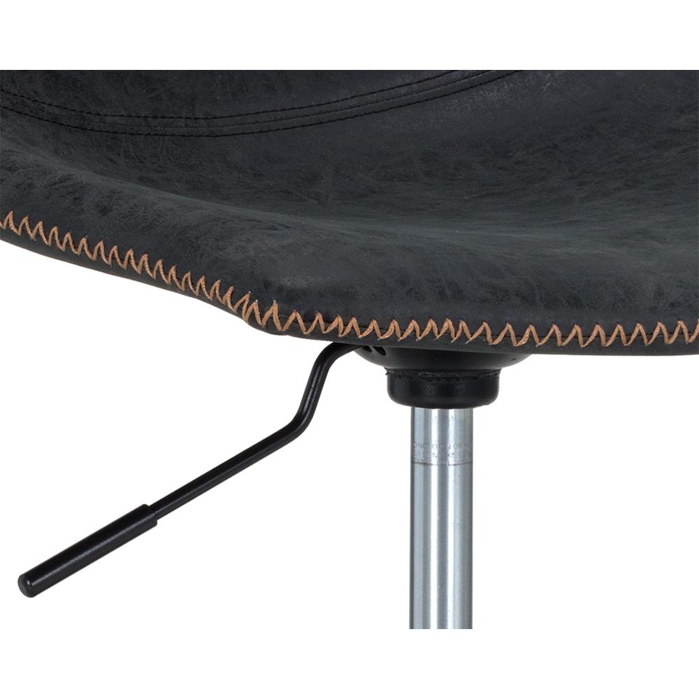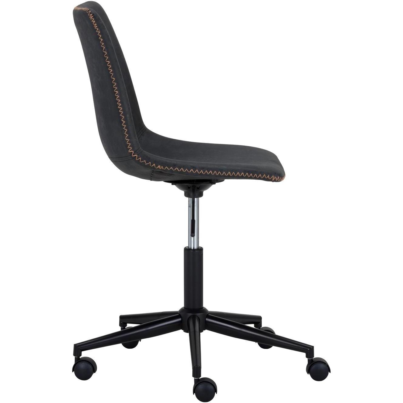 A comfortable and compact office chair. Designed with a simple, mid-century silhouette. Features an adjustable seat and castors for mobility. Stocked in antique black faux leather. Handle With Care: This design has been crafted with faux leather. Faux leather is manufactured to reflect the natural characteristics of leather; as such, colour variations, markings wrinkles, grooves, and light scratches are appreciated characteristics. No two pieces will be alike. Visit our Product Care page for more information on how to ensure the lasting beauty of this piece.