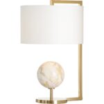 Calabria lamp features a ball of natural calacatta gold marble supported on a metal base with a warm coffee bronze finish and topped wiht an off white linen drum shade. This combination of mixed materials creates an ideal accent lamp that will function as a primary decorative piece, illuminating any elegant modern space.