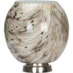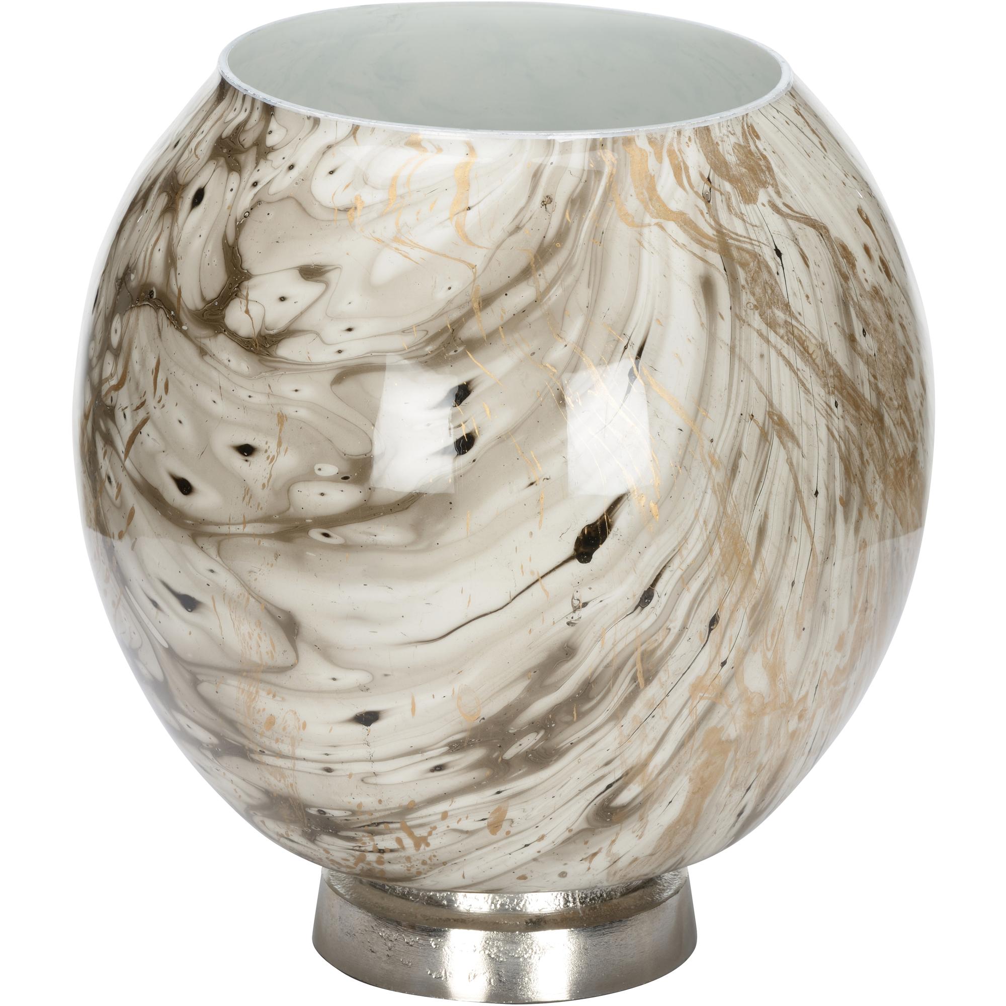 Be mesmerized by the swirls of the calacatta gold… Sitting atop an aluminum base with a polished nickel finish, cream, gray and gold create a marbled pattern on this striking 11″ glass vase. The swirls add visual interest and a sense of calm to any environment. Add flowers for a stunning centerpiece.