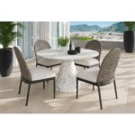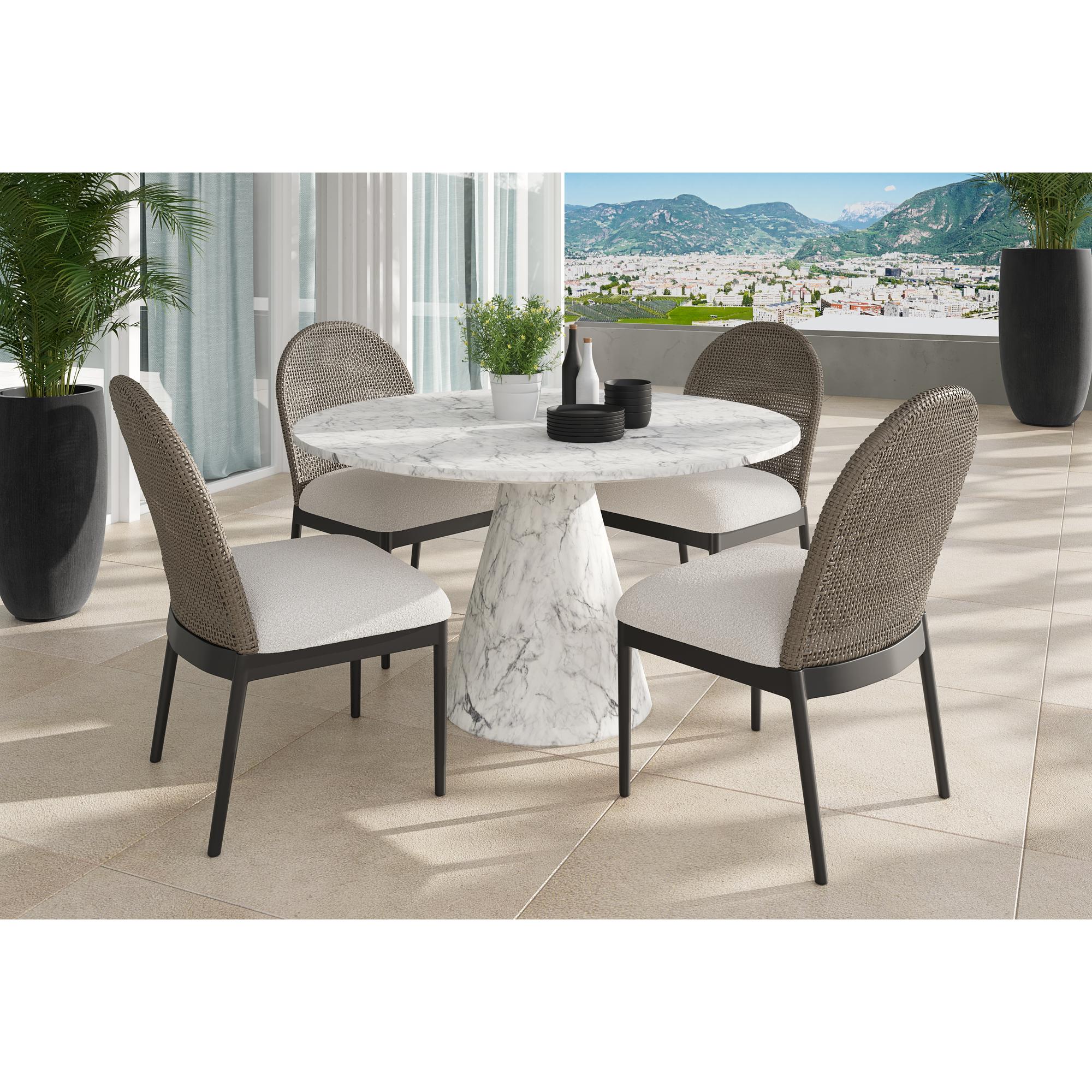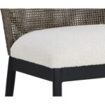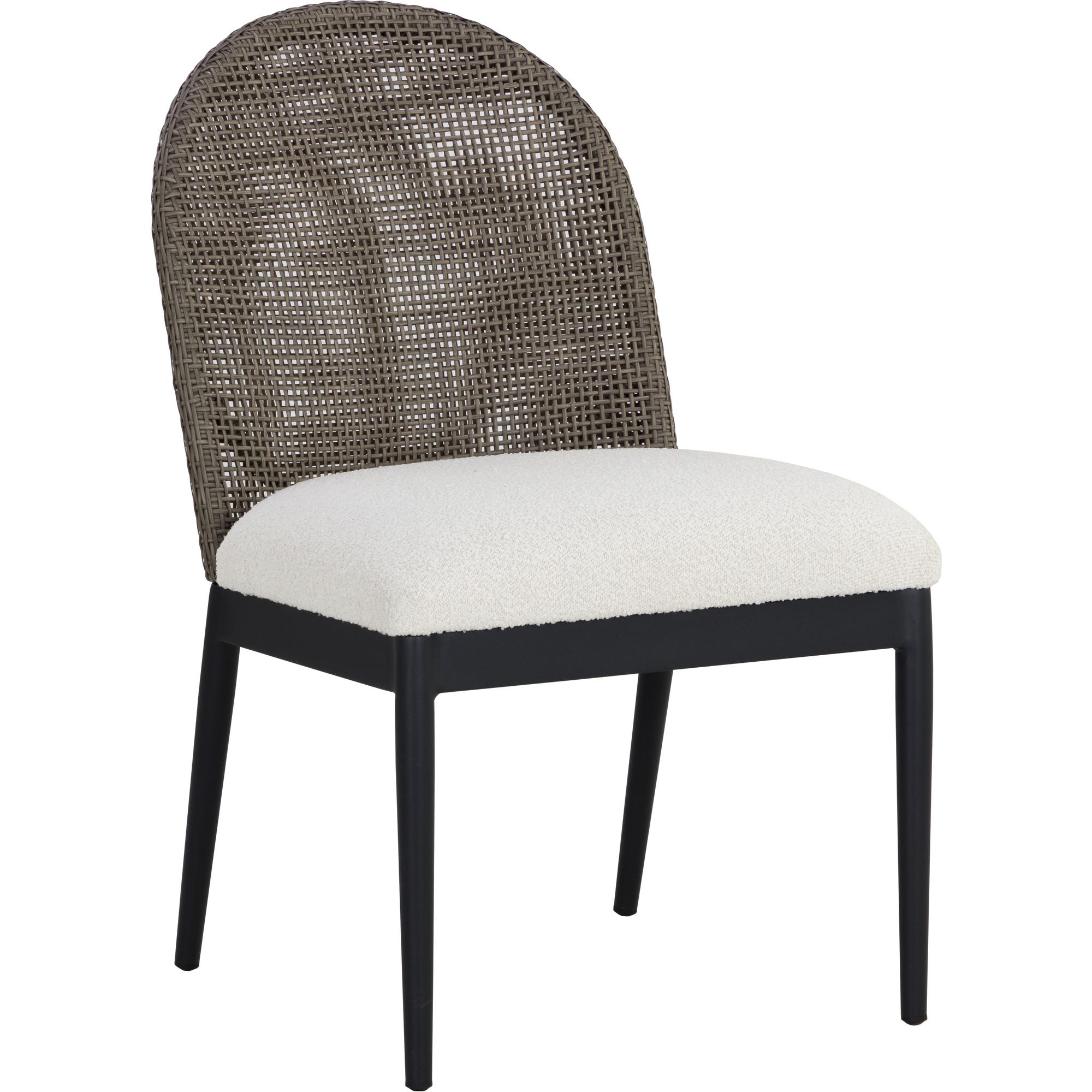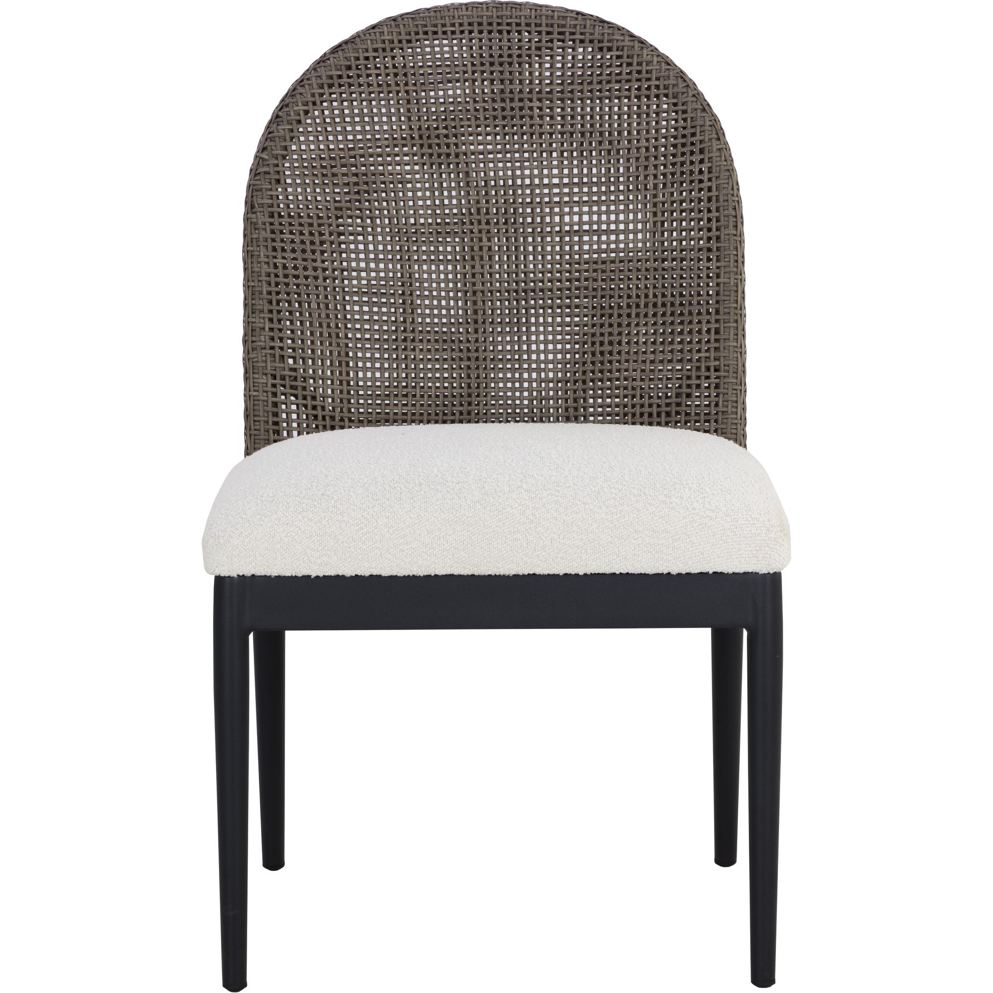 The Calandri Dining Chair brings a fresh and airy feel to any outdoor dining space. A softly curved back made with ore grey polyethylene cane wicker weave pairs beautifully with our soft louis cream outdoor boucle performance fabric, exuding both comfort and style.