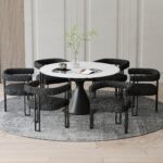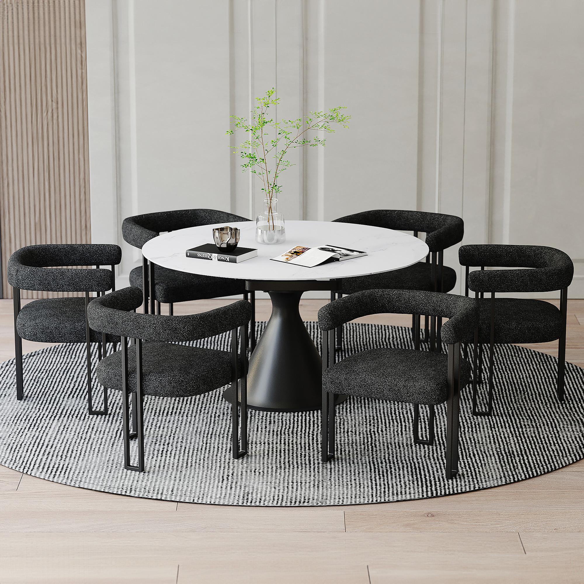 Practicality and style come together with a few turns. This table goes from a spacious stadium-shaped table, to an large-diameter round table in a matter of seconds – just a few one-handed turns of the table top. The sintered stone table is the best option for durability and design. Heat resistant, stain resistant, scratch resistant and, with the marble effect finishing, still pretty to look at! The sturdy cone-shaped pedestal base is the perfect finishing touch on this gorgeous new centrepiece to you dining room or kitchen. Bring the magazine-worthy dining experience to life with these beautiful, boucle-upholstered dining chairs. The textured fabric is quickly becoming a design staple for creating that high-end feel in your space. The square-line black metal frames and supports the chair perfectly, providing hours of seated comfort.