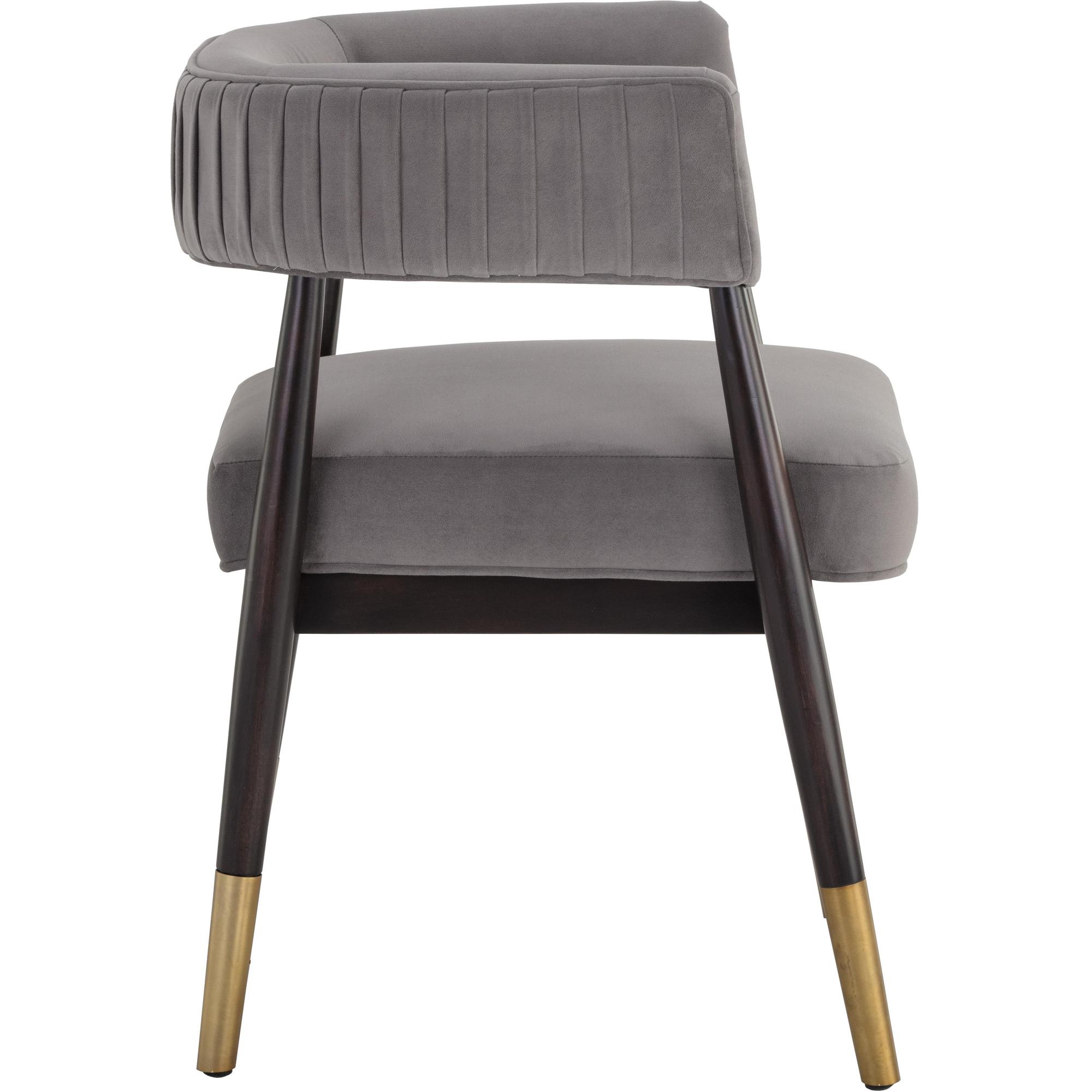 Invite guests to relax in this elegant open back armchair. Features a modern barrelback seat in antonio charcoal performance fabric with ruching on the exterior. An exposed brown birchwood frame with gold metal caps completes the look. Perfect for living, lounge and office spaces. Performance fabric is moisture repellent, durable and easy to clean.