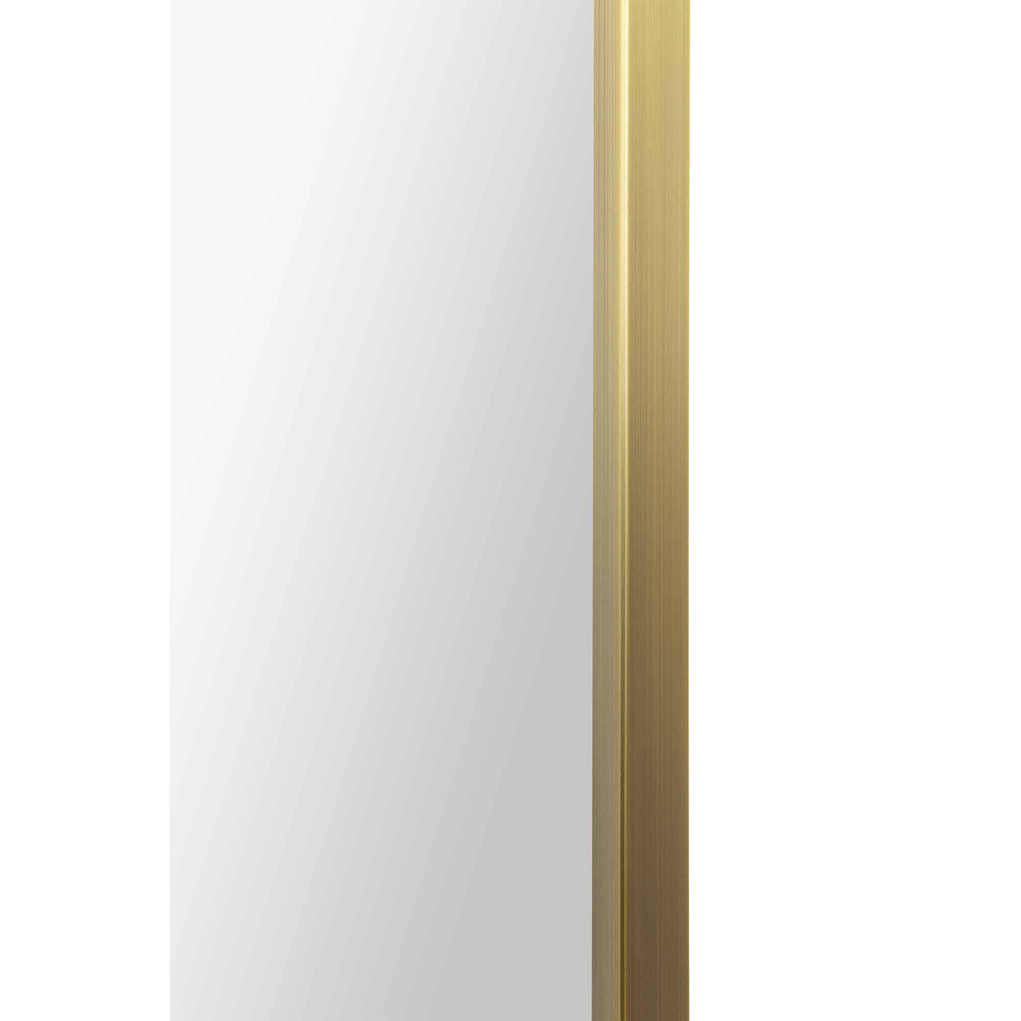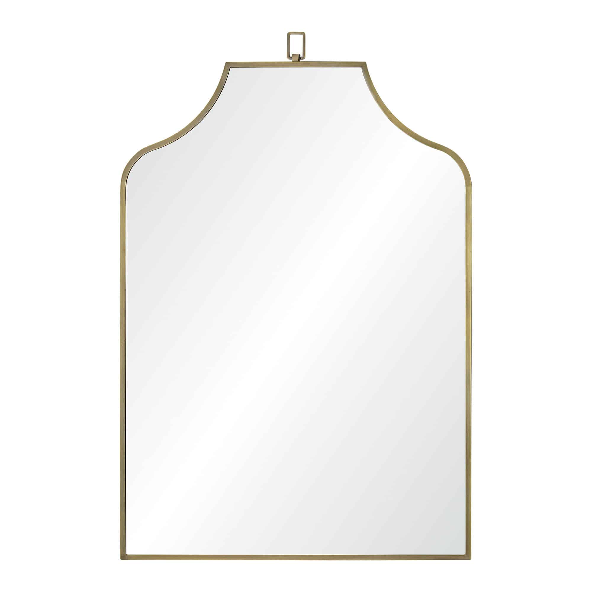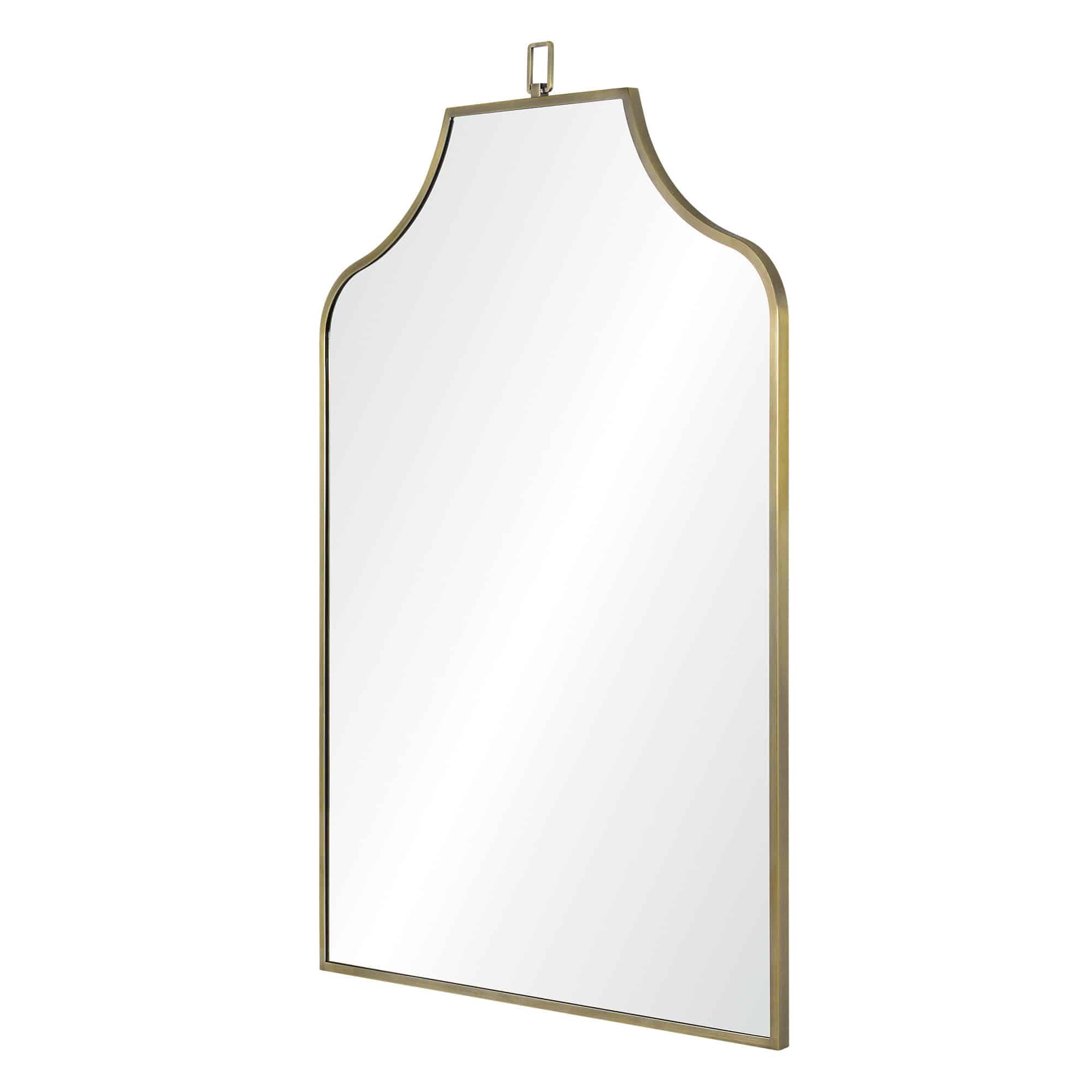 Routine reflection takes on an elevated, elegant appearance with this wallmount mirror design. Showcasing an antique brushed brass finished frame, this mirror has an inherent warmth that sets a welcoming tone for the interior it hangs within. The mirror’s unique shape not only adds historical charm to its impression, but it brings complexity to the wall it hangs against.