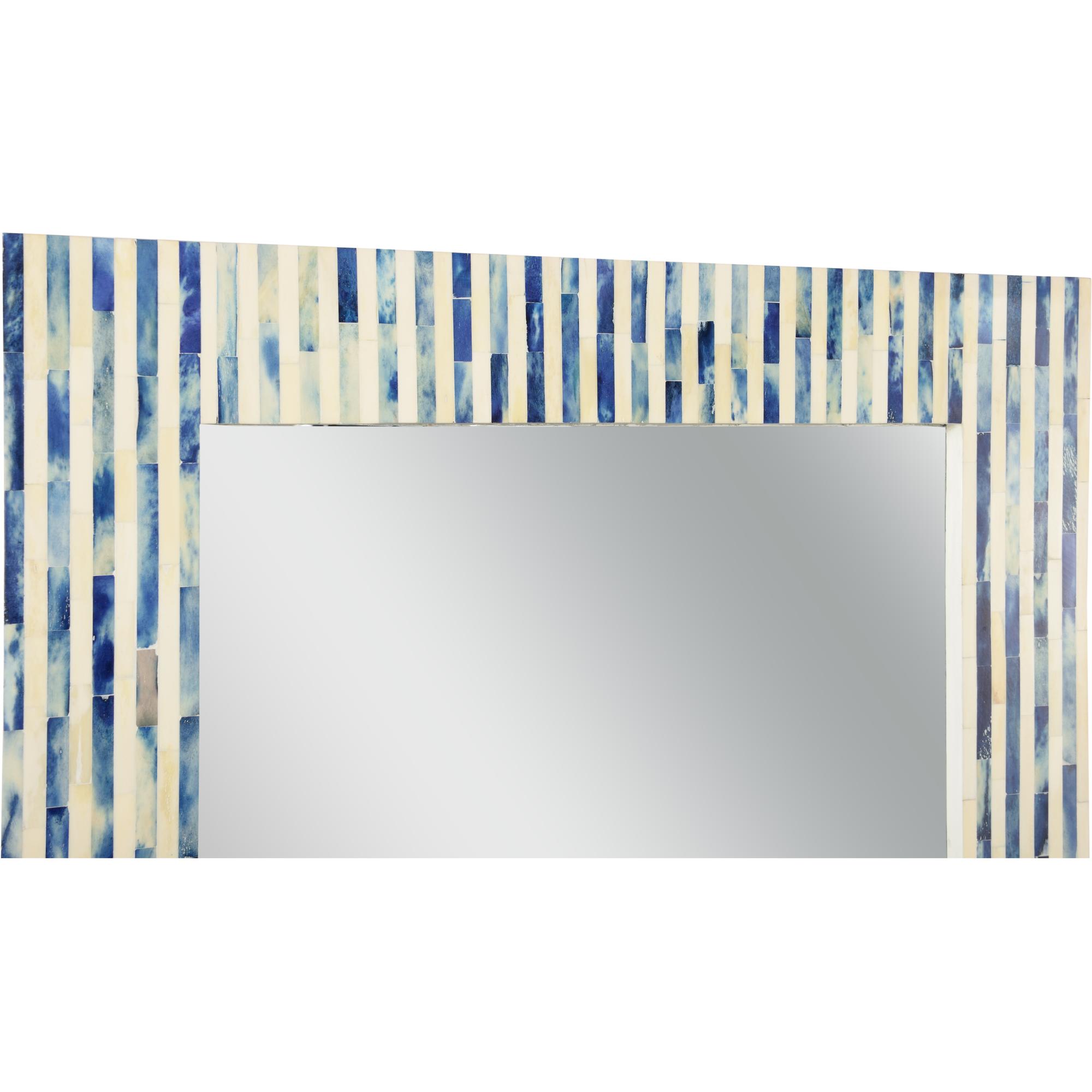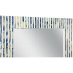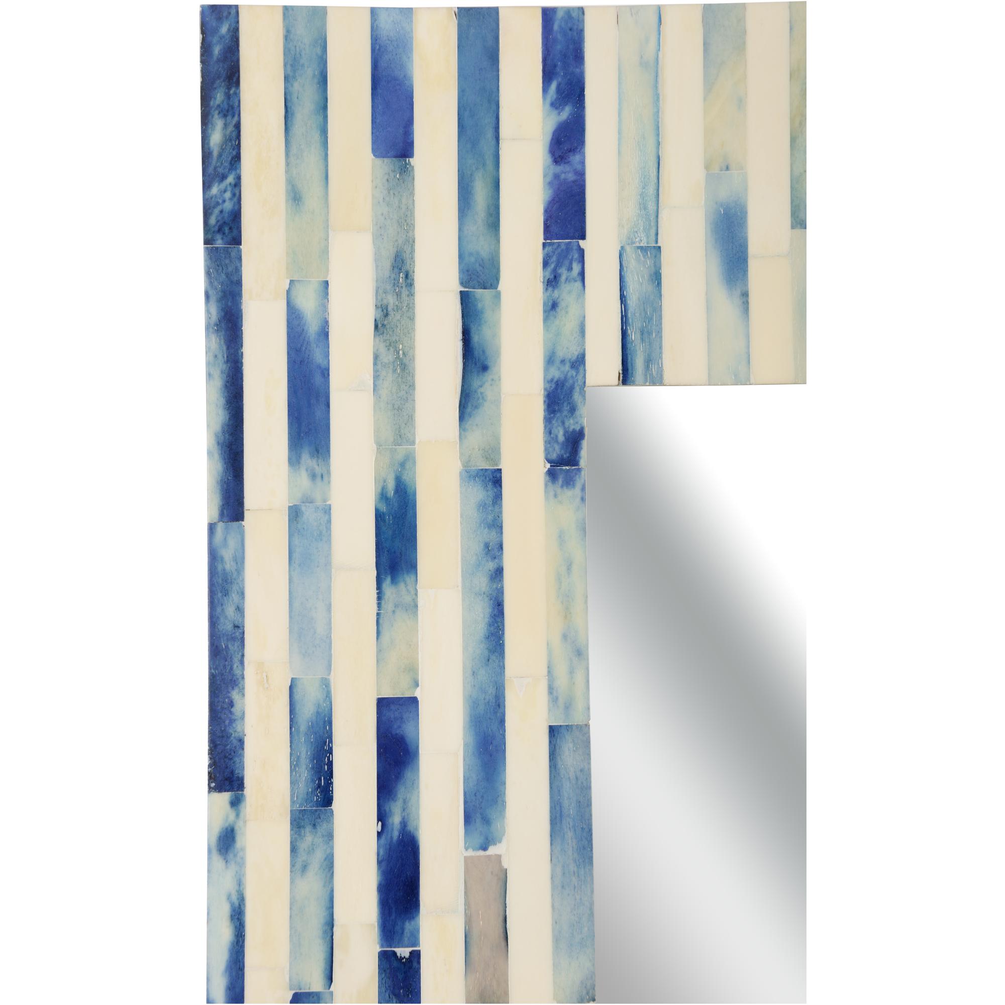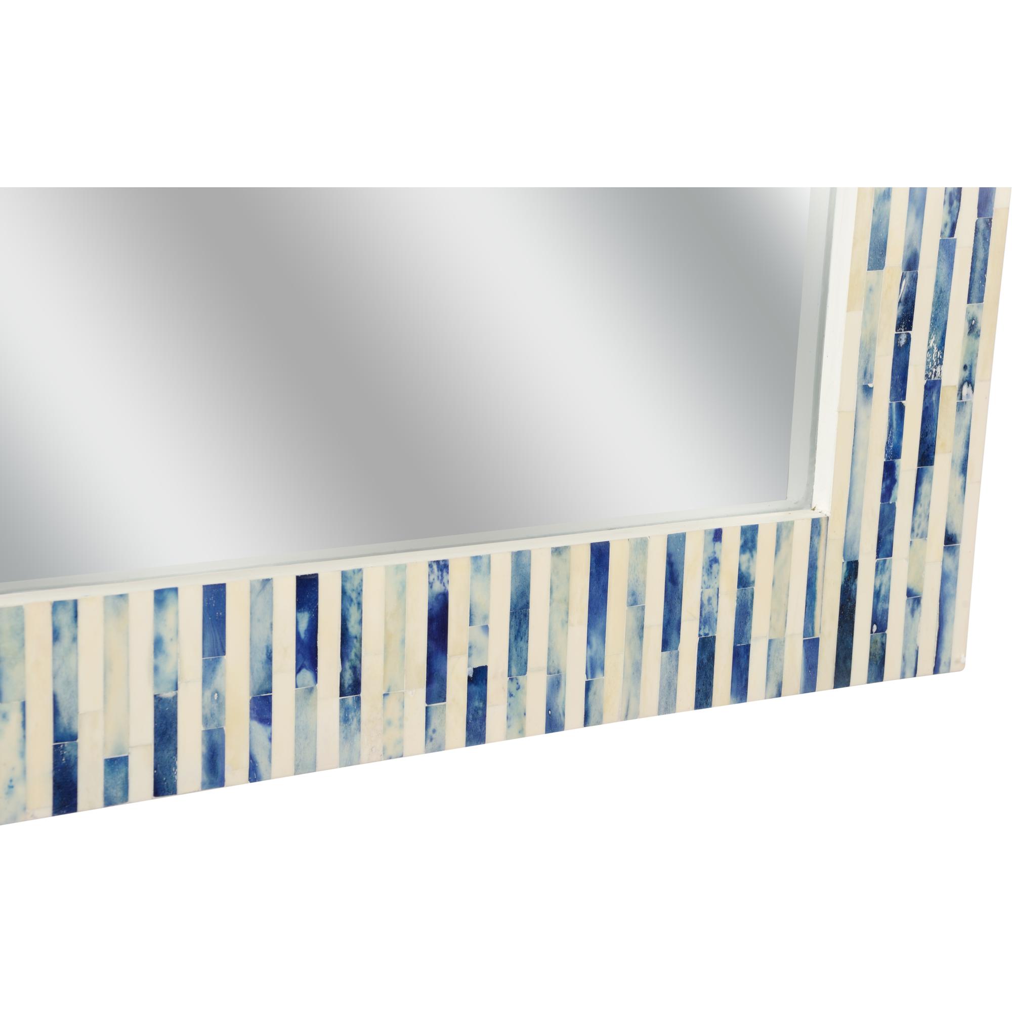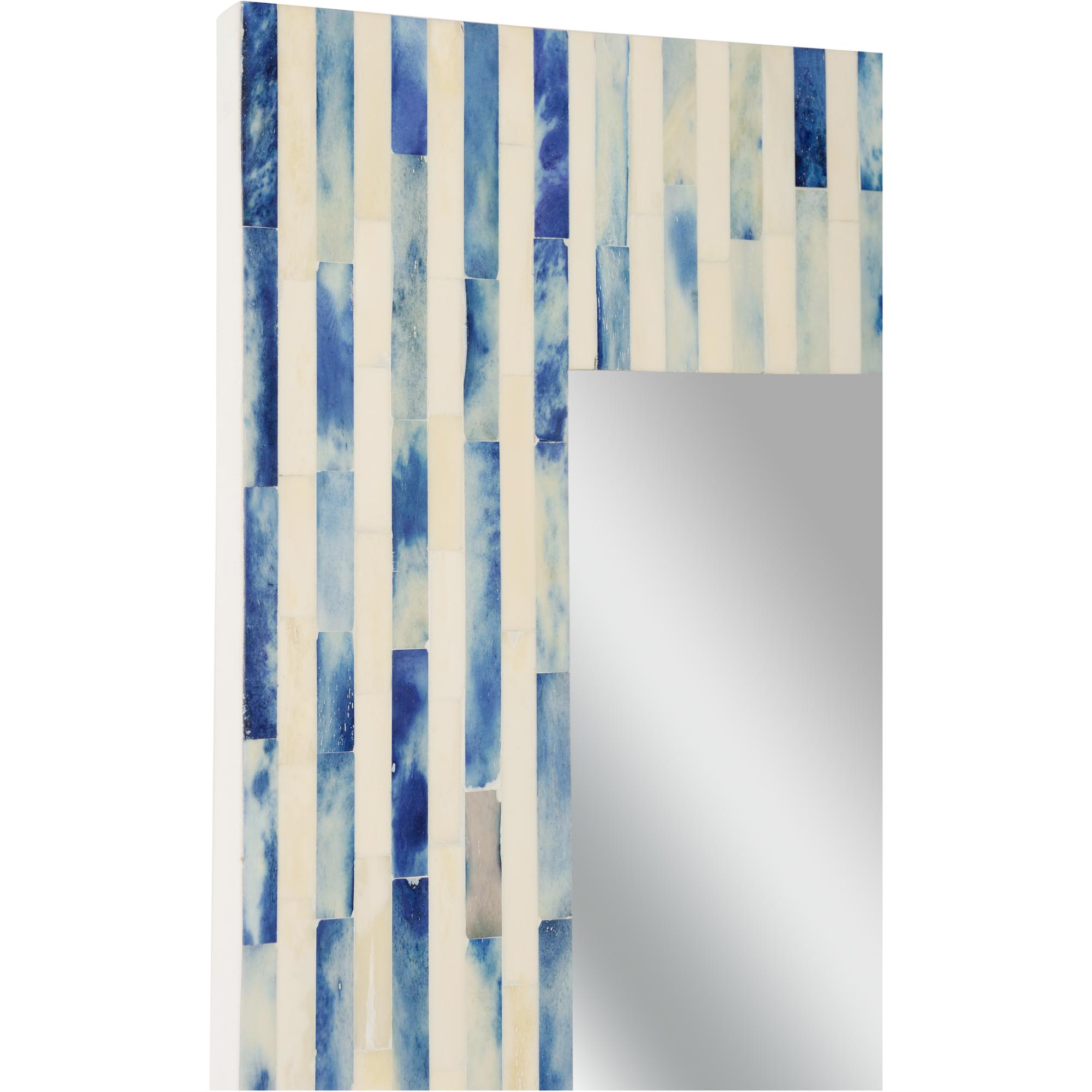 The Cambridge Mirror is surrounded by a beautifully intricate bone inlay frame, hand-cut and meticulously arranged in a stunning pattern that contrasts rich blue hues with crisp white tones. The delicate design adds depth and texture, making this mirror not just a functional piece but a striking statement for any room.