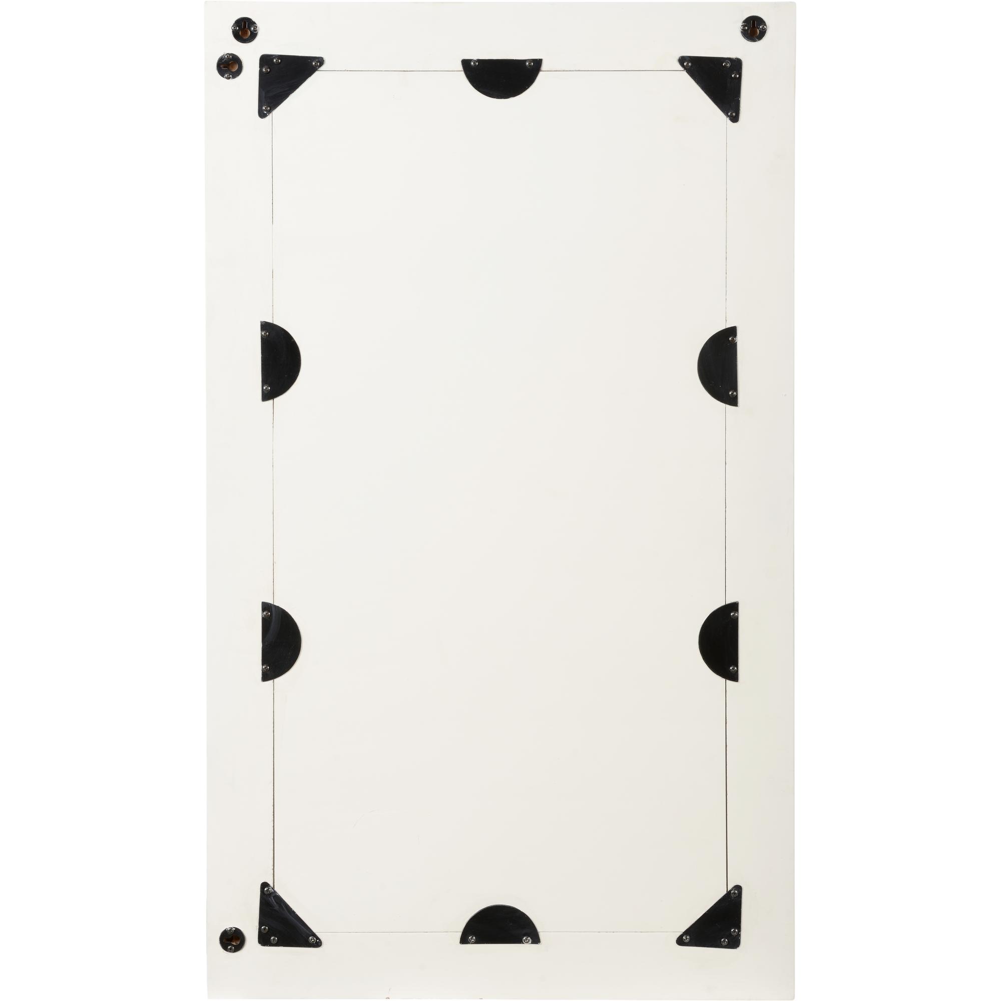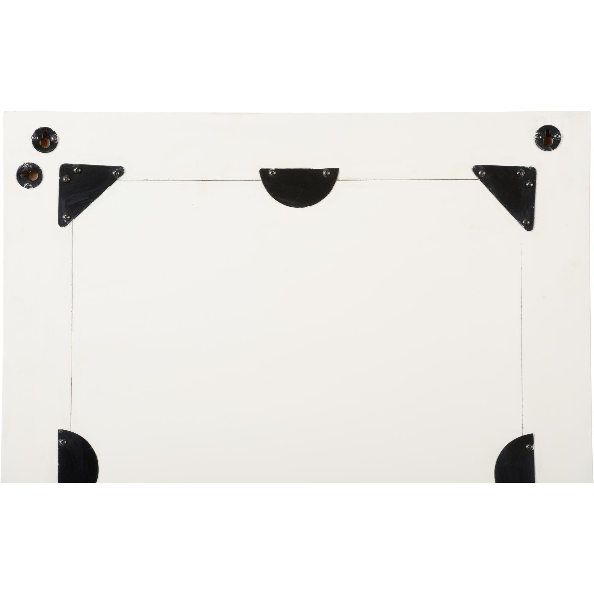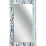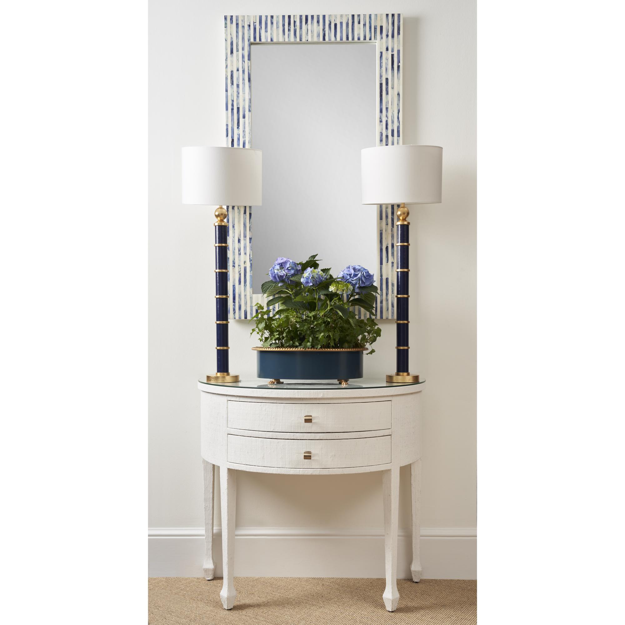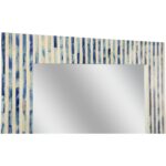 The Cambridge Mirror is surrounded by a beautifully intricate bone inlay frame, hand-cut and meticulously arranged in a stunning pattern that contrasts rich blue hues with crisp white tones. The delicate design adds depth and texture, making this mirror not just a functional piece but a striking statement for any room.