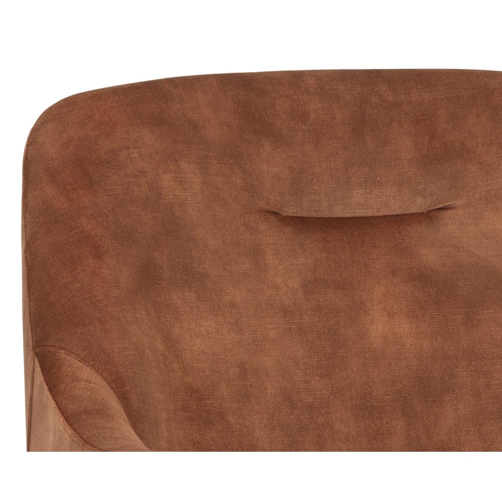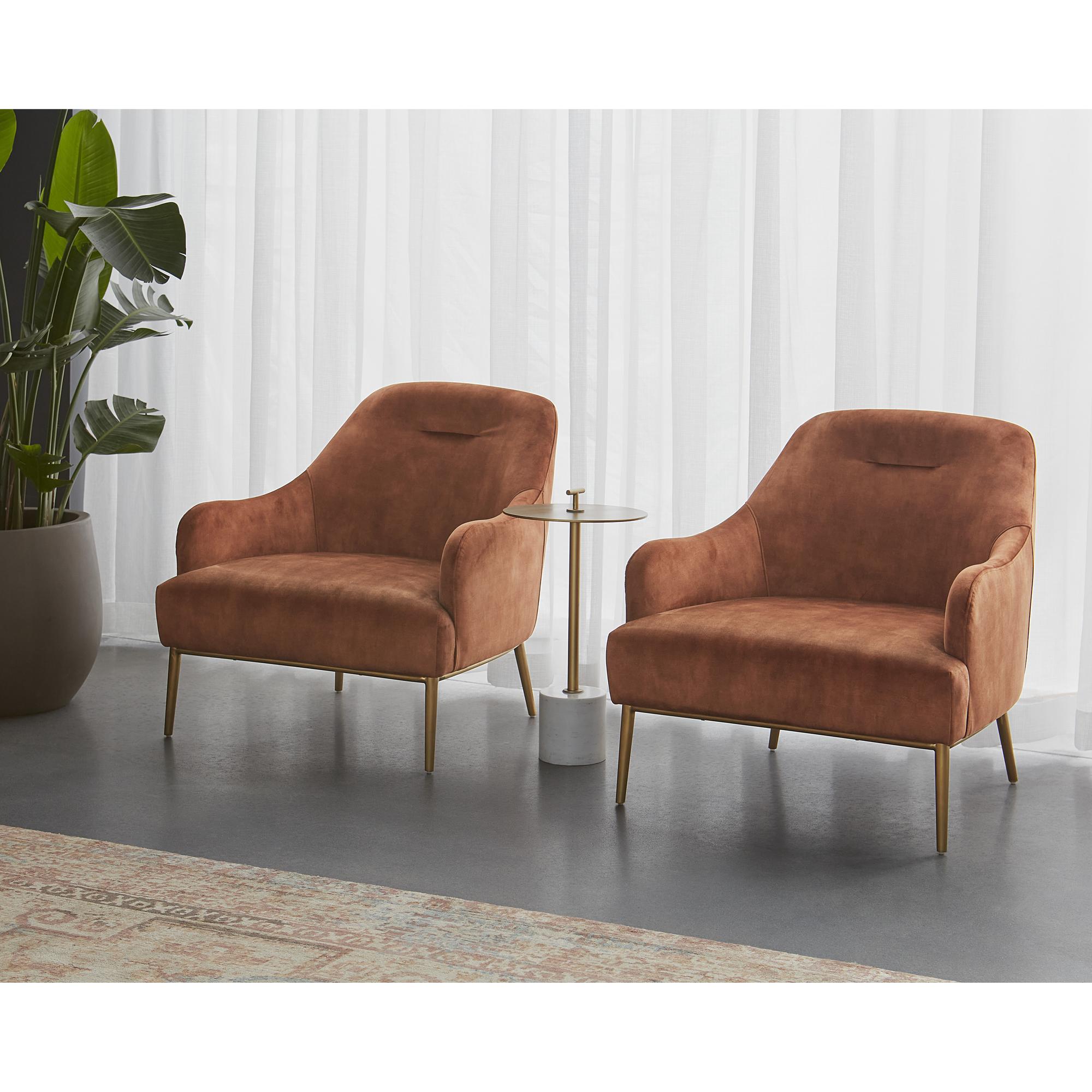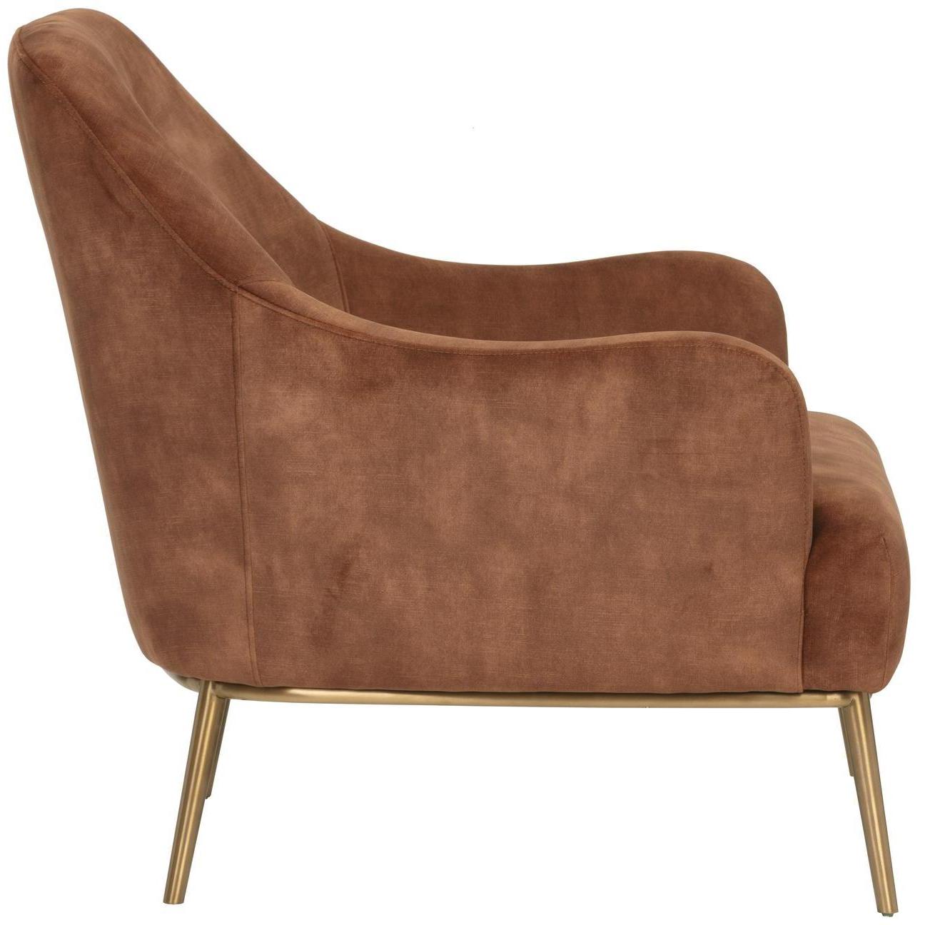 An elegant lounge chair with mid-century modern influence. Designed with a comfortable, single tufted seat and sloping arms. Stocked in a beautiful, velvet-like nono petrol, rust or shitake fabric. Nono fabric features a natural variation of light and dark sections. An exposed gold stainless steel frame and legs complete the look.