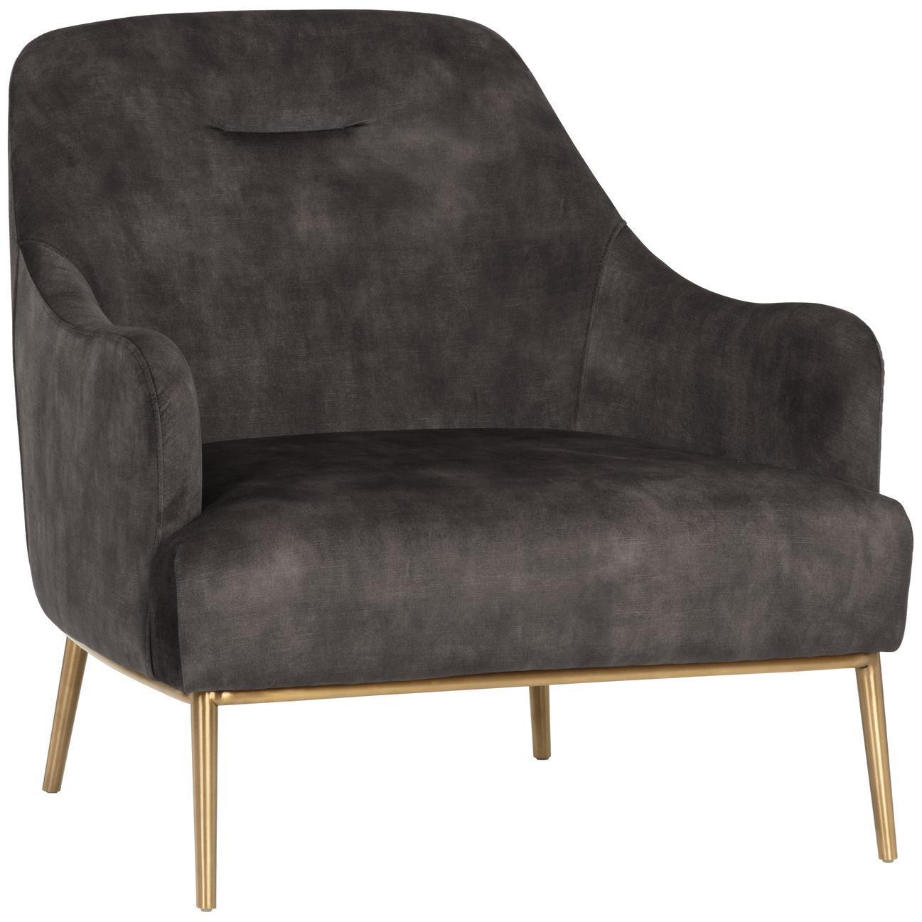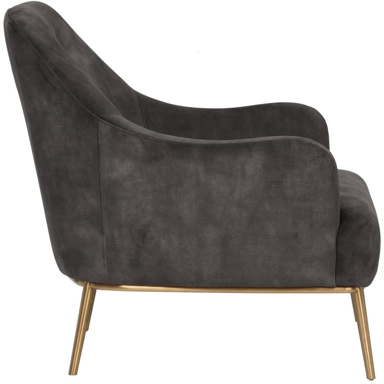 An elegant lounge chair with mid-century modern influence. Designed with a comfortable, single tufted seat and sloping arms. Stocked in a beautiful, velvet-like nono petrol, rust or shitake fabric. Nono fabric features a natural variation of light and dark sections. An exposed gold stainless steel frame and legs complete the look.