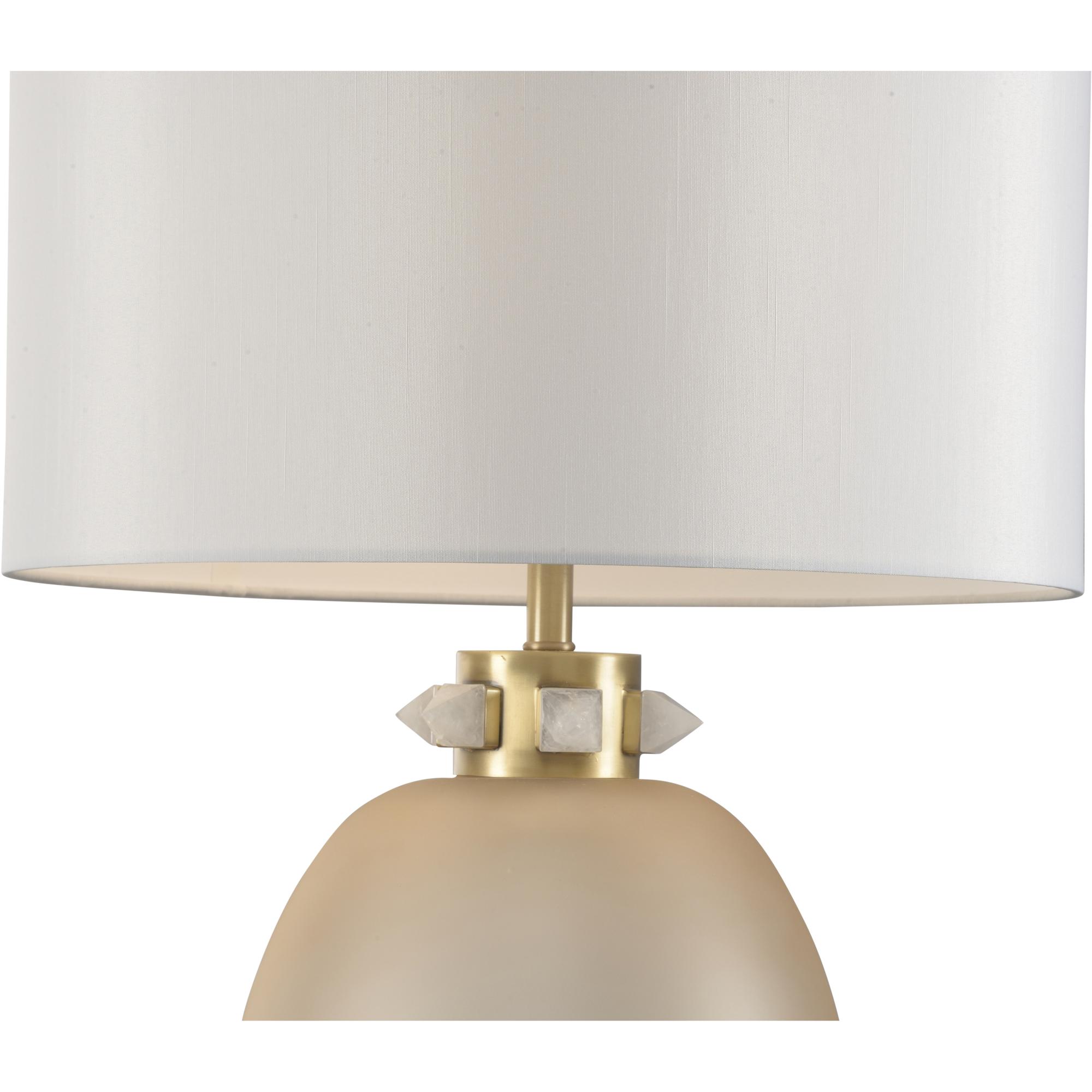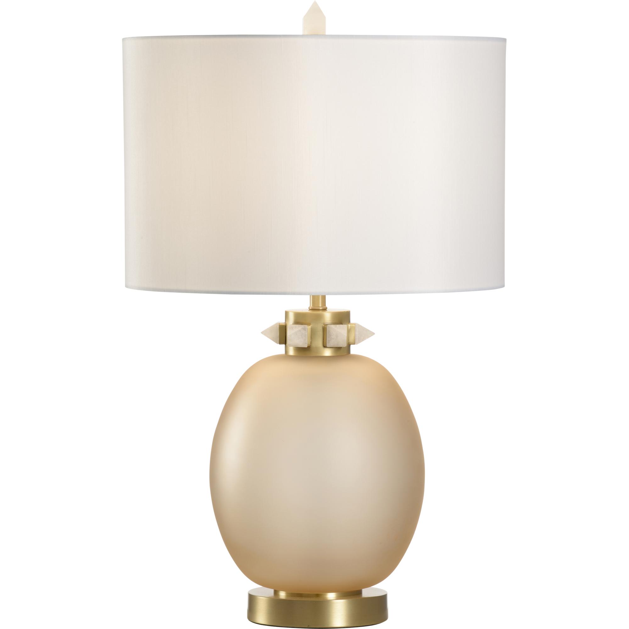 The Cameron Lamp features a stunning round shape crafted from amber-colored glass, exuding warmth and elegance. Topped with a crystal stone collar and complemented by light antique brass detailing, this lamp beautifully balances modern and classic design. Finished with a white fabric shade.