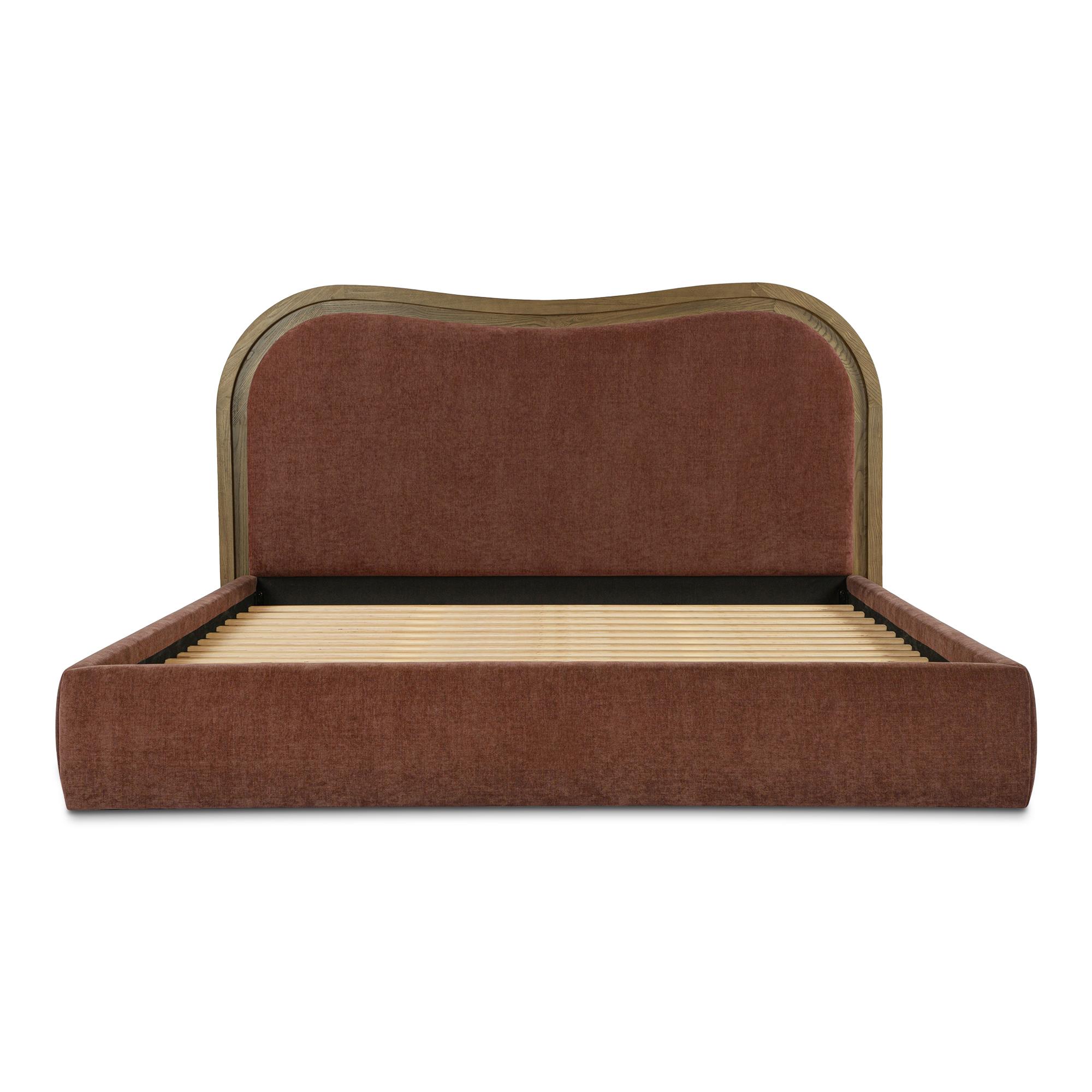 A wave bed, but make it architectural. Camilla brings Art Deco curves to bedtime with a headboard that looks carved, not crowded. The stepped-down inset frame shapes a clean wave, while foam-and-fiber padding keeps your sit-up-and-read routine comfortable. Wrapped in 100% polyester upholstery and grounded by an ash frame in a chestnut finish, it feels balanced and intentional. Included slats support your mattress—no box spring needed. So your room gets the statement, and you rest.