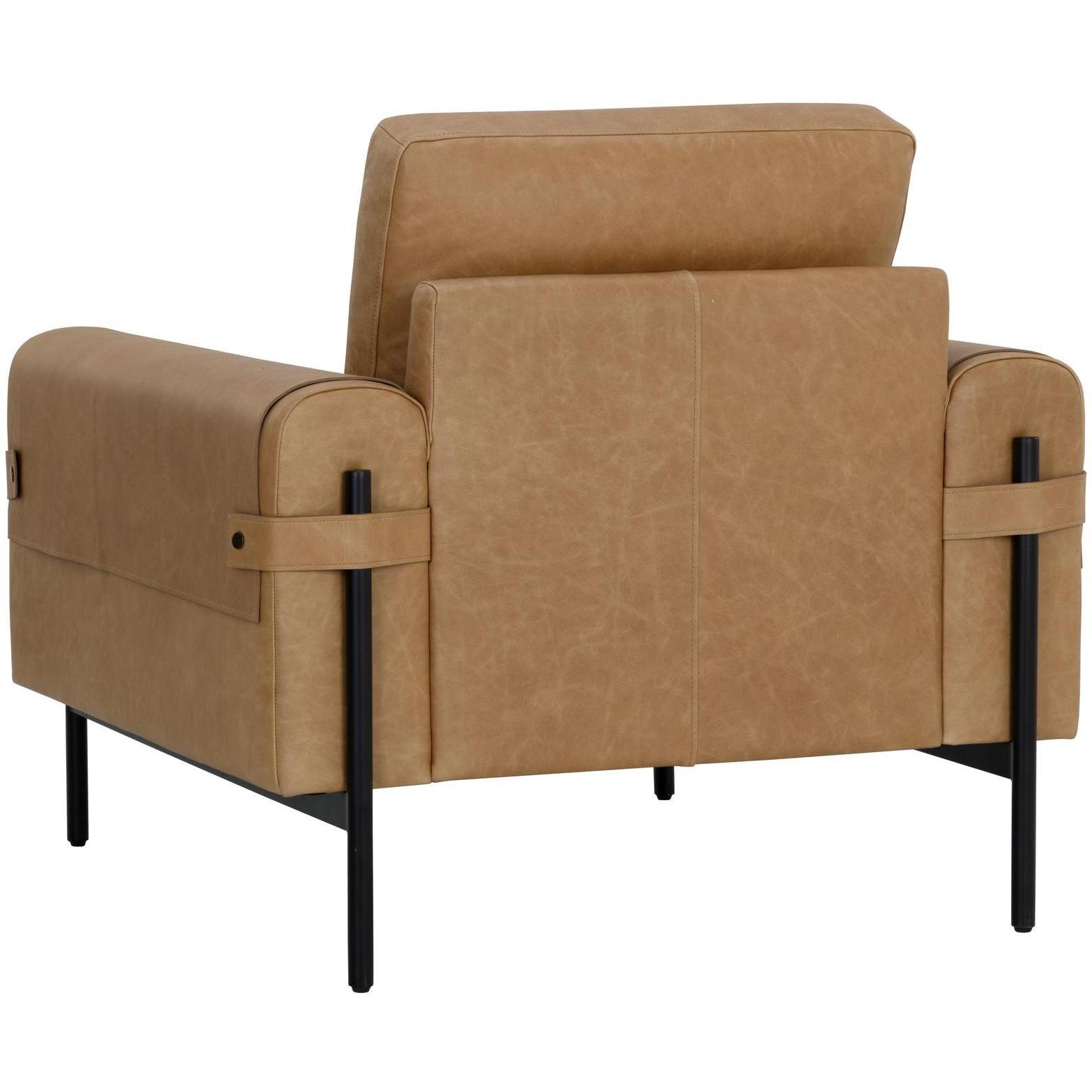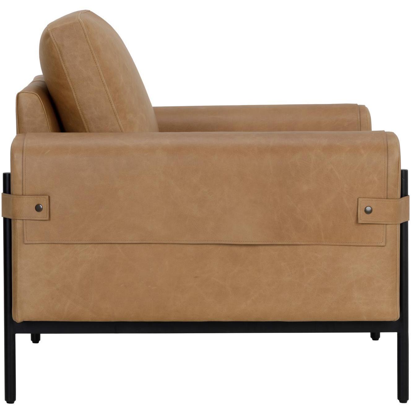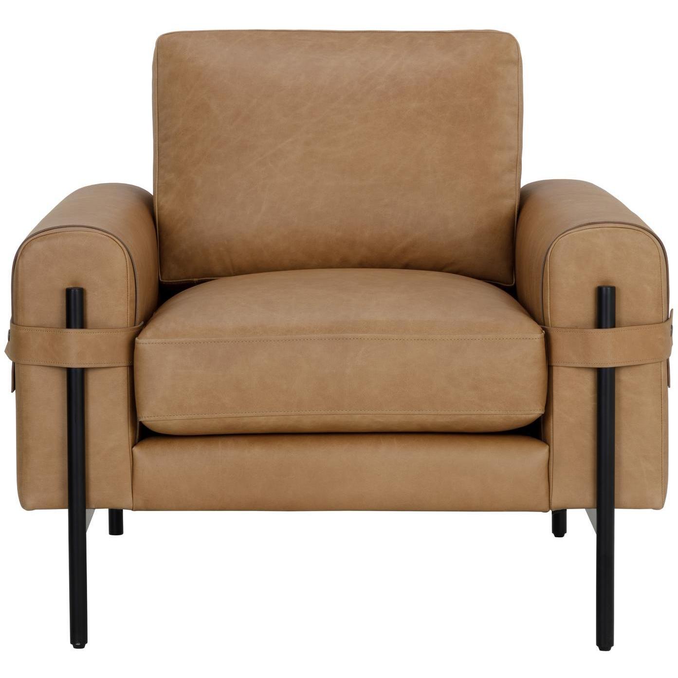 With its classic silhouette, the Camus Armchair will add comfort to any room. Generously upholstered in soft ludlow sesame leather that is as stylish as it is luxurious. Strap detailing on the front and back of the rounded armrests provide a playful accent to the piece. Completed with black iron legs. Handle with Care: This design has been crafted with top grain leather. Leather is a natural material; as such, colour variations, markings, wrinkles, grooves and light scratches are acceptable and appreciated characteristics. No two pieces are alike. Visit our Product Care page for more information on how to ensure the lasting beauty of this piece.