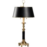 Illuminate your study with this traditional hand finished cast brass candlestick lamp. This classic table lamp features two lights with brass pull chains that are both decorative and functional. A black parchment shade with tortoise shell interior completes this timeless design.