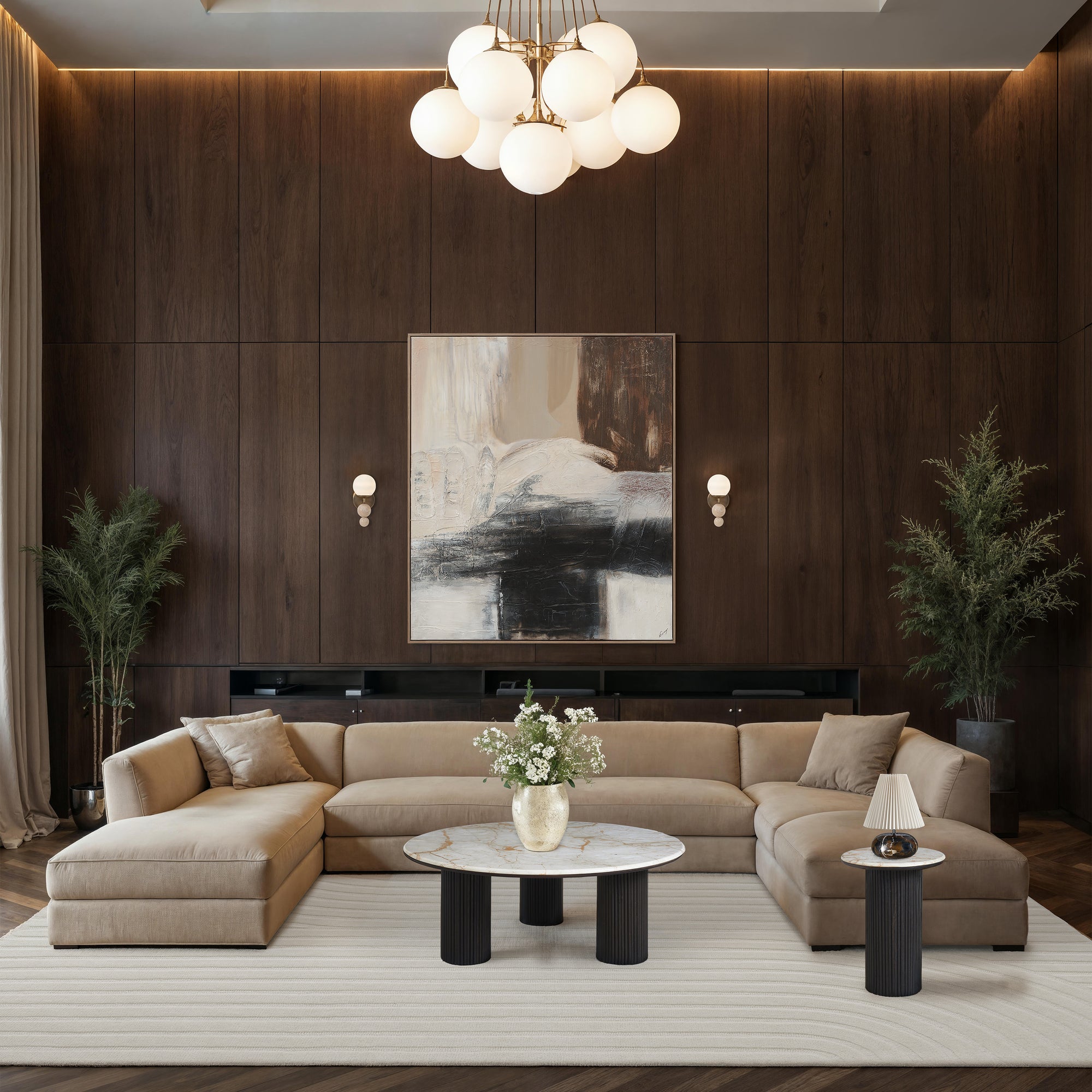 Anchor your design scheme with the textured elegance of the Cane wall art canvas. Its oversized scale and medium walnut frame make a striking statement, while a neutral palette of beige, black, and white adds subtle warmth. Rich plaster textures give depth and interest, creating a sophisticated focal point for any contemporary interior.