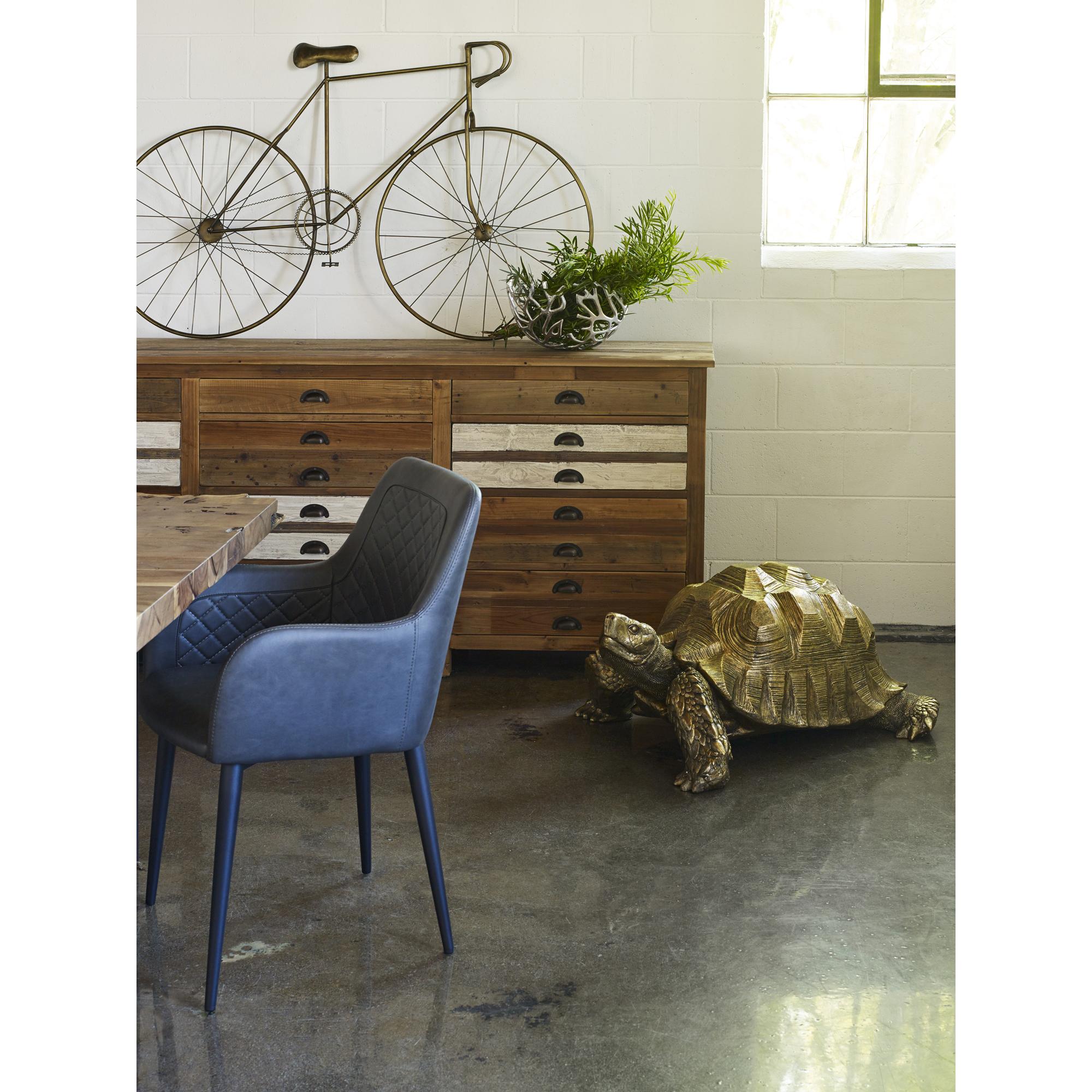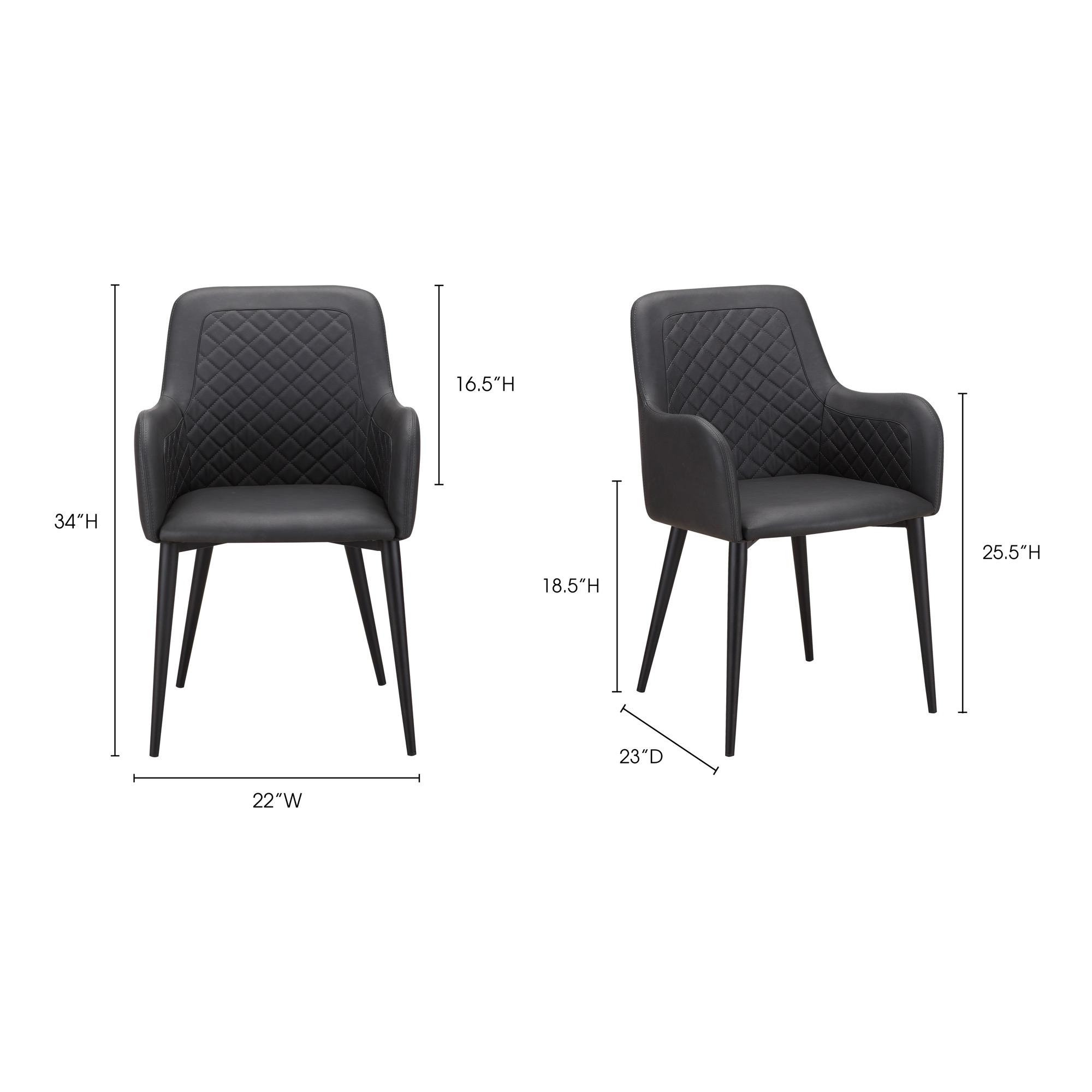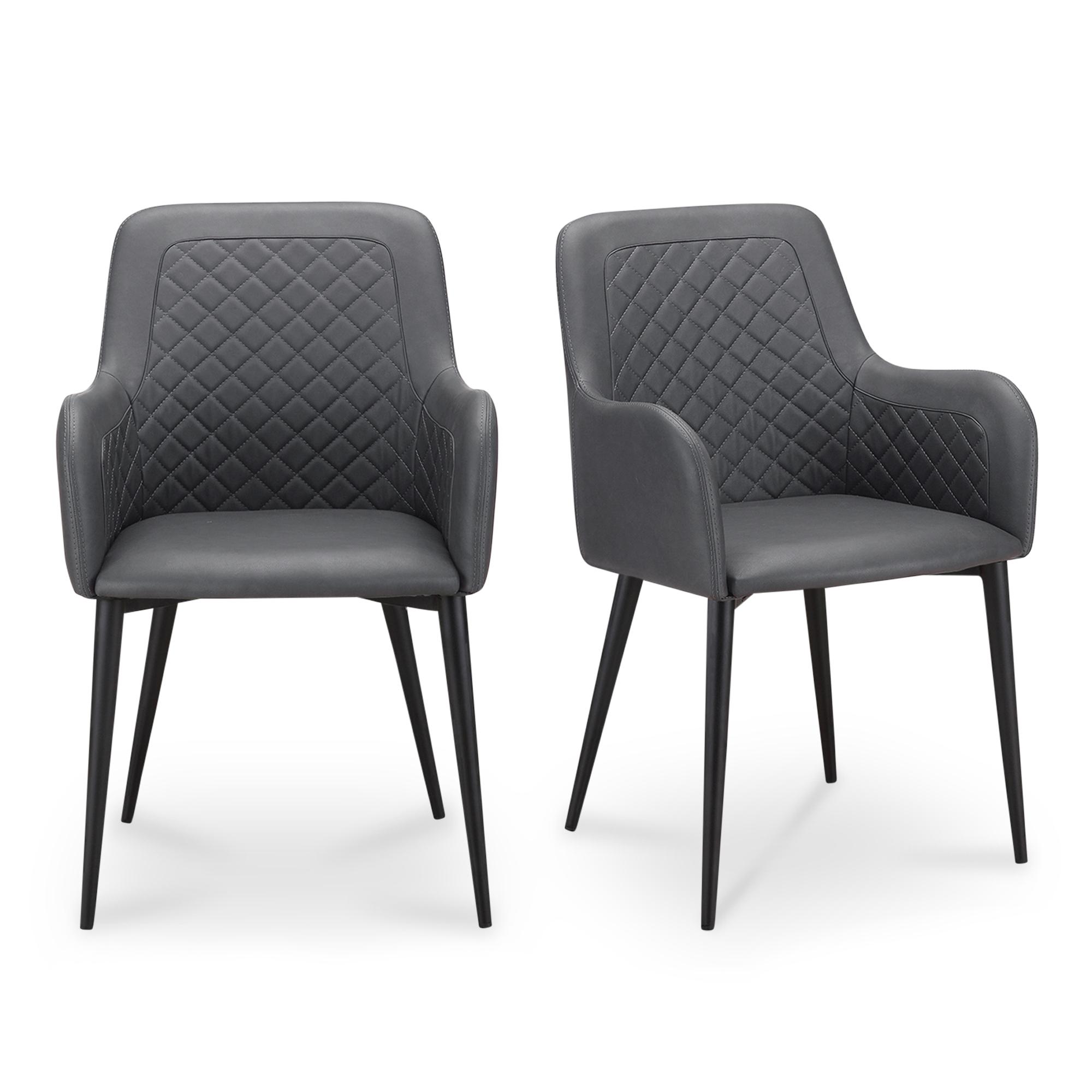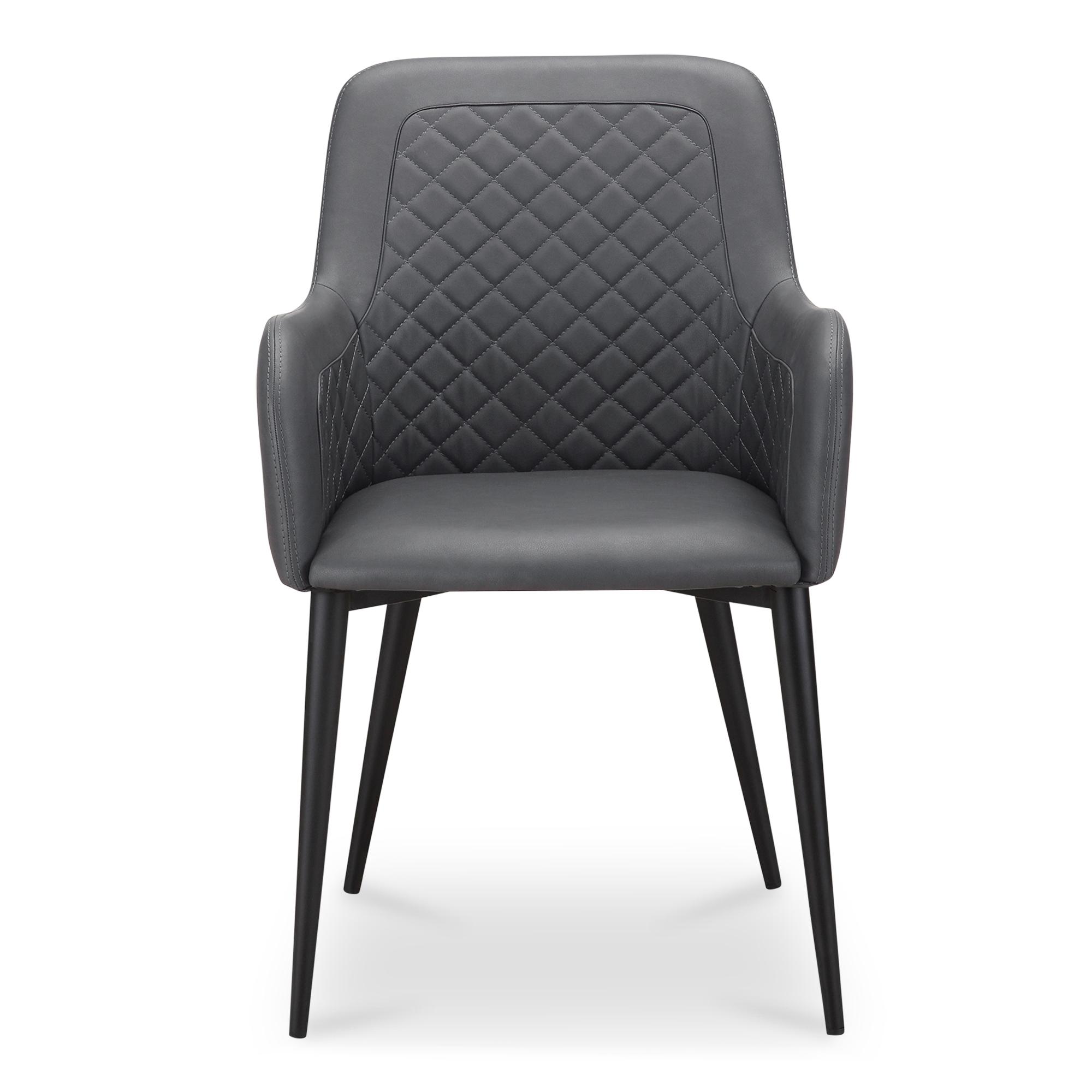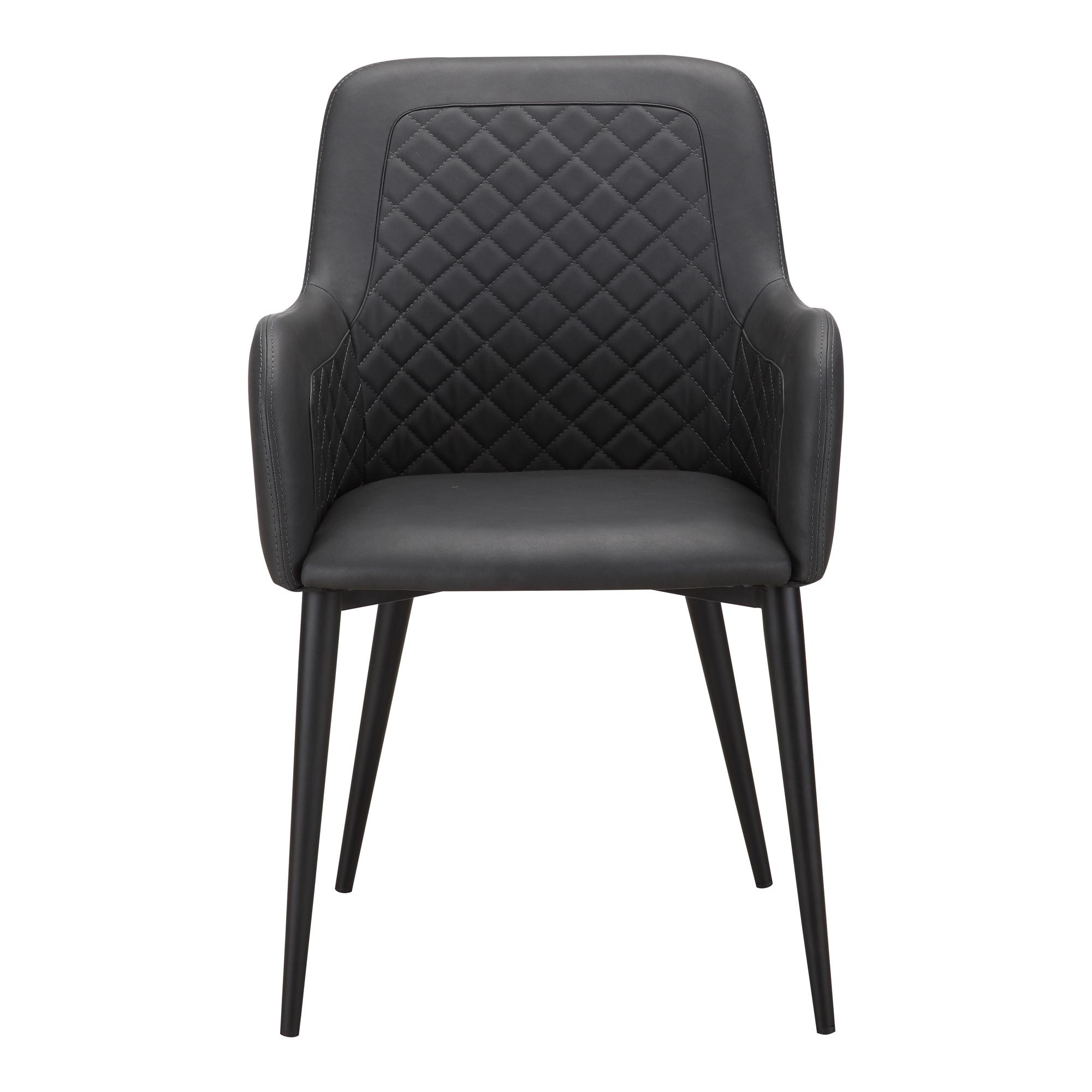 A diamond of dining design. Both refined and contemporary, the Cantata dining chair is made with sturdy steel legs and durable, easy-to-clean greyish-black vegan leather upholstery. The diamond tufted back and armrests give this seat a flair of elegance, making it an ideal chair for long dinners and the occasional card game.