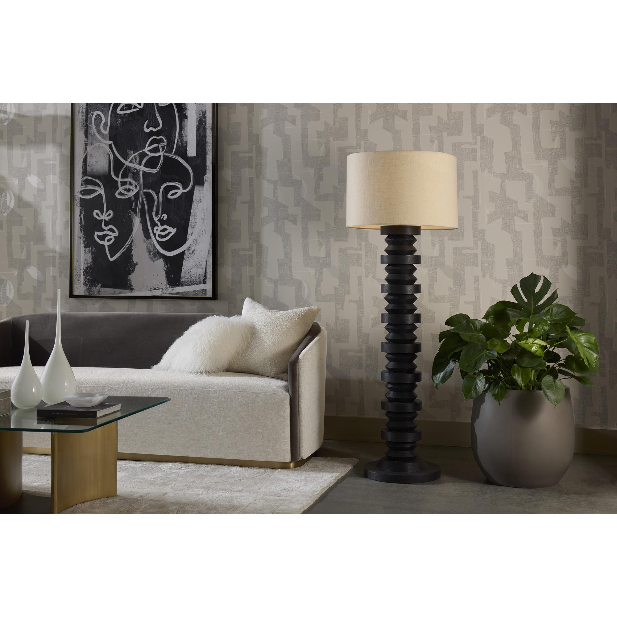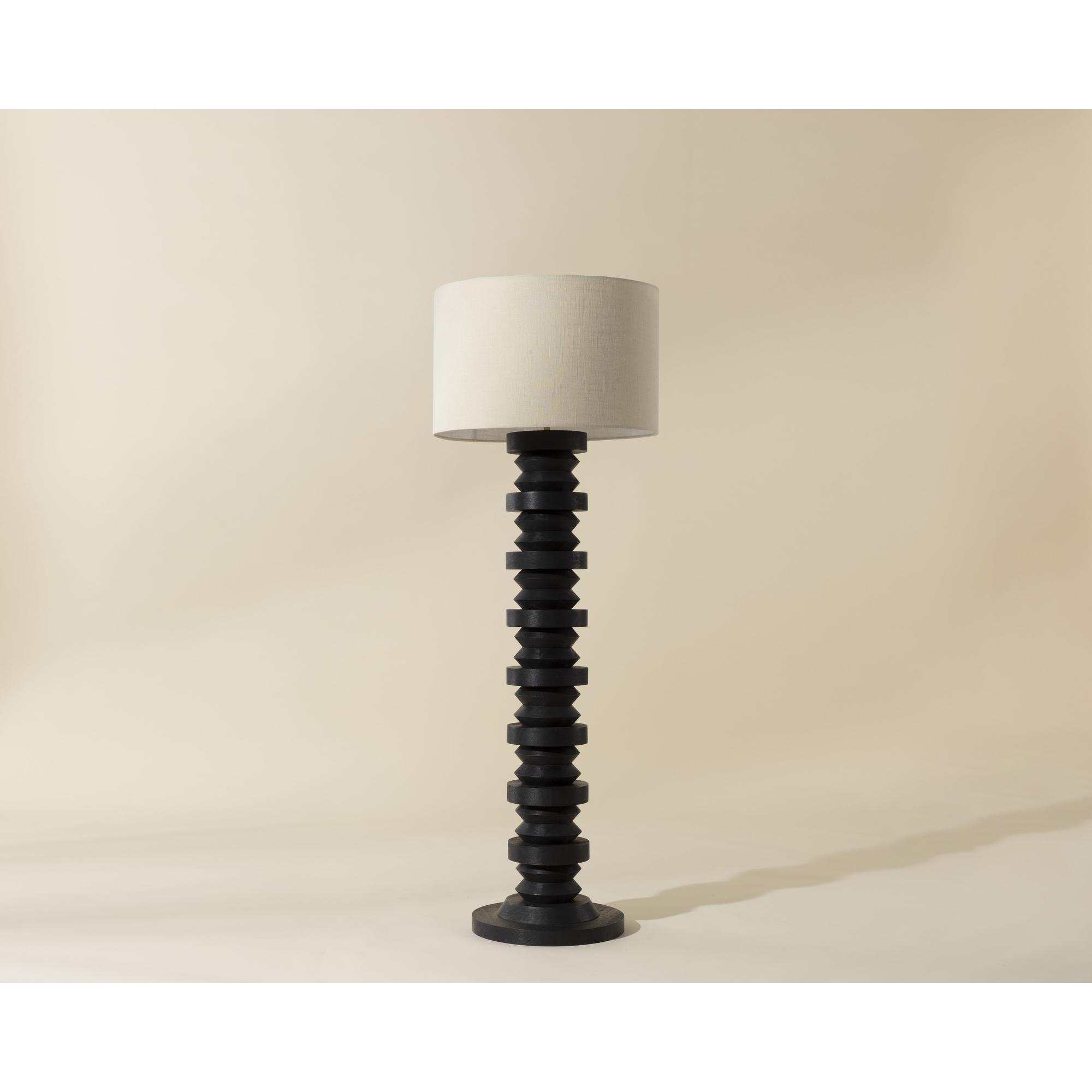 The Caplo Floor Lamp captures attention with its strong presence. Its sturdy black mango wood base features undulating shapes that infuse the design with distinctive character.
