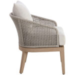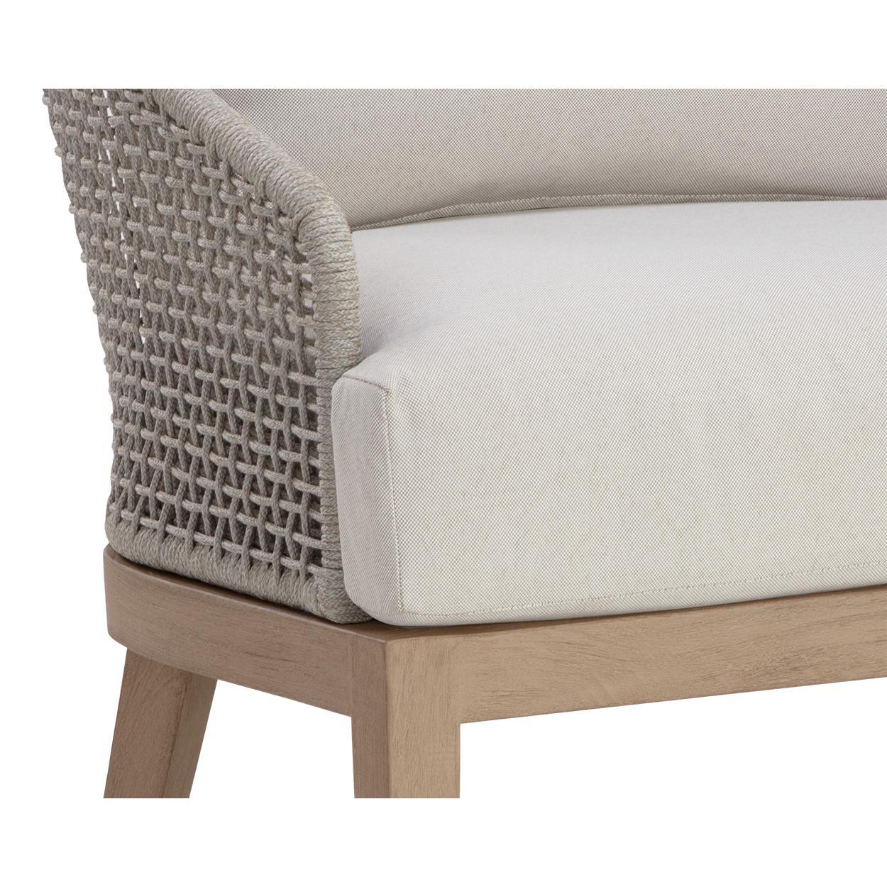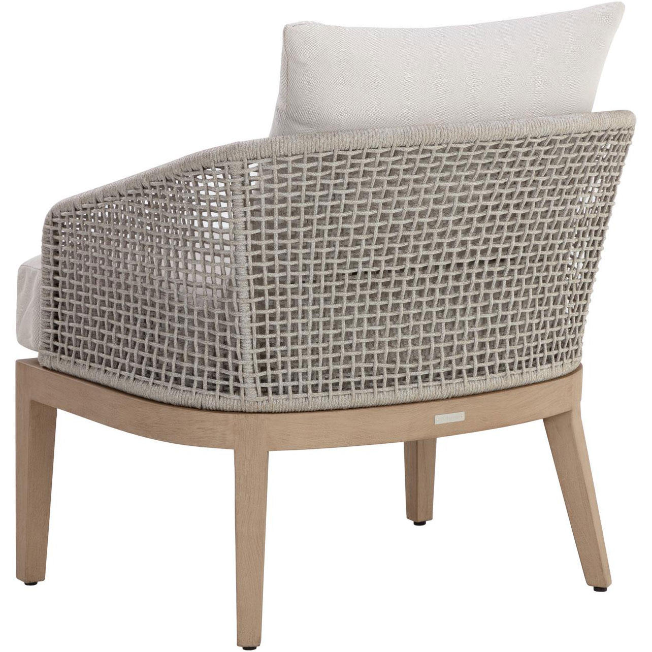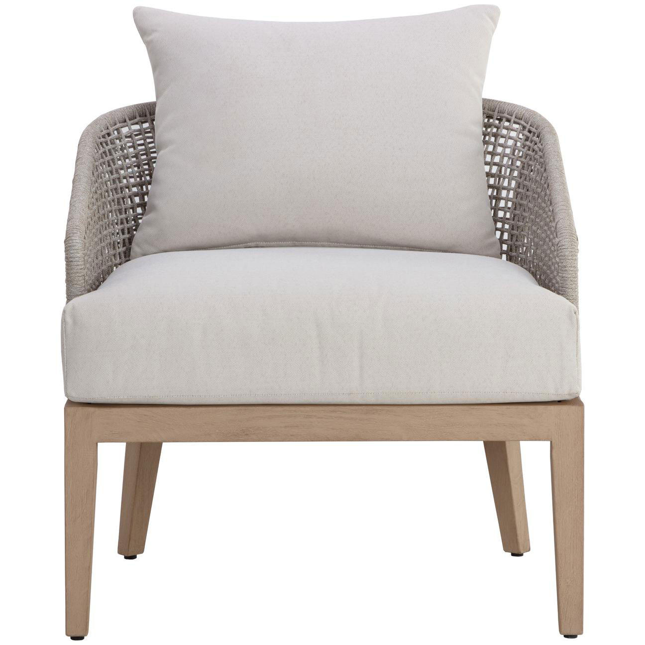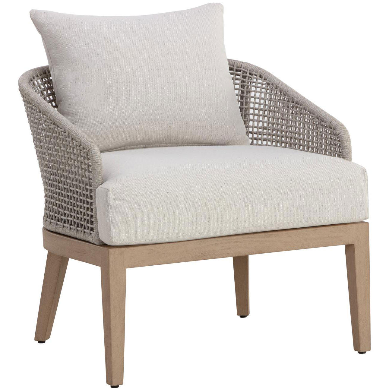 Blur the lines of inside and out with this beautiful outdoor lounge chair. This comfortable design features a barrelback frame wrapped in greymix weave and seat cushions in palazzo cream fabric. A drift brown teak wood base completes the look. Suitable for indoor and covered outdoor spaces.