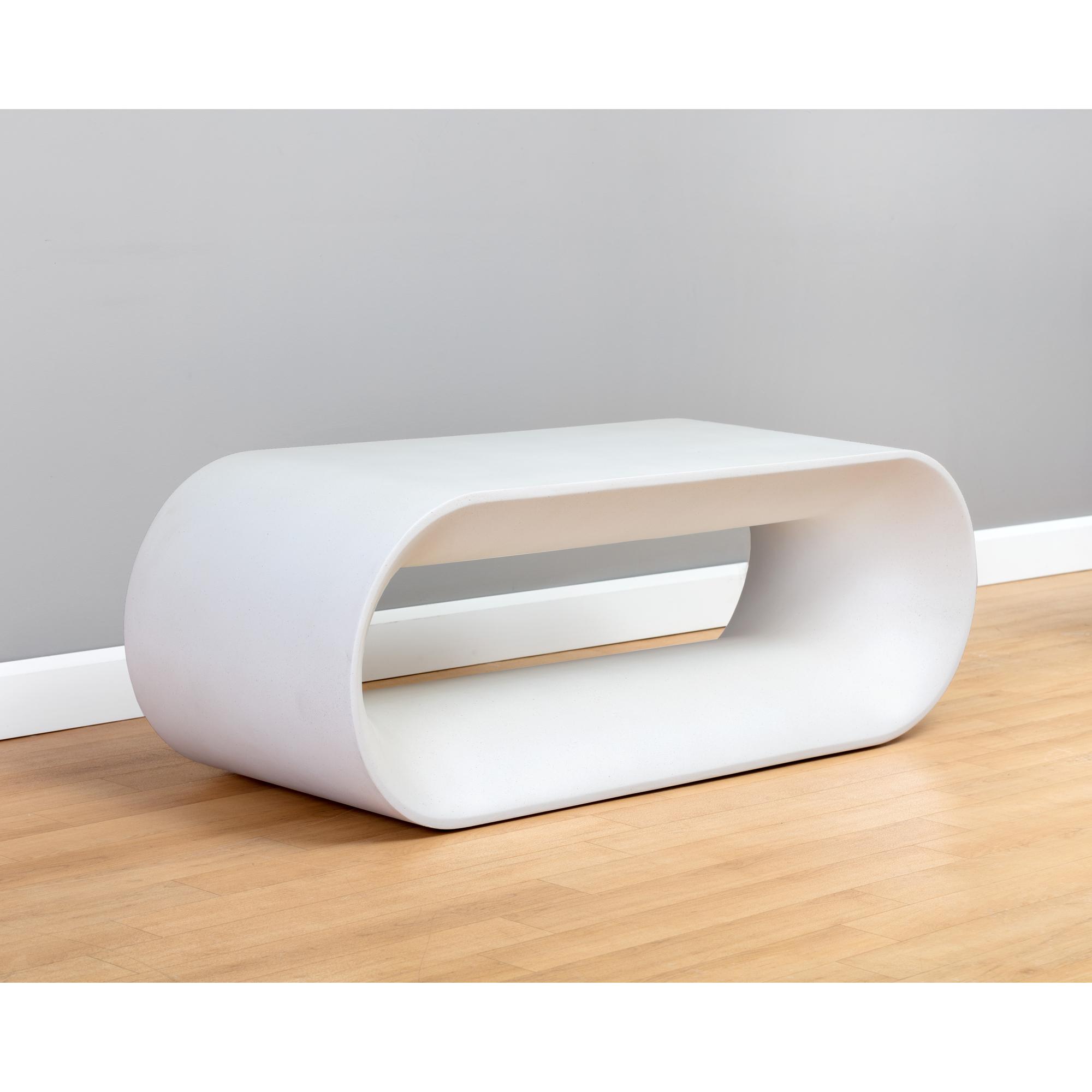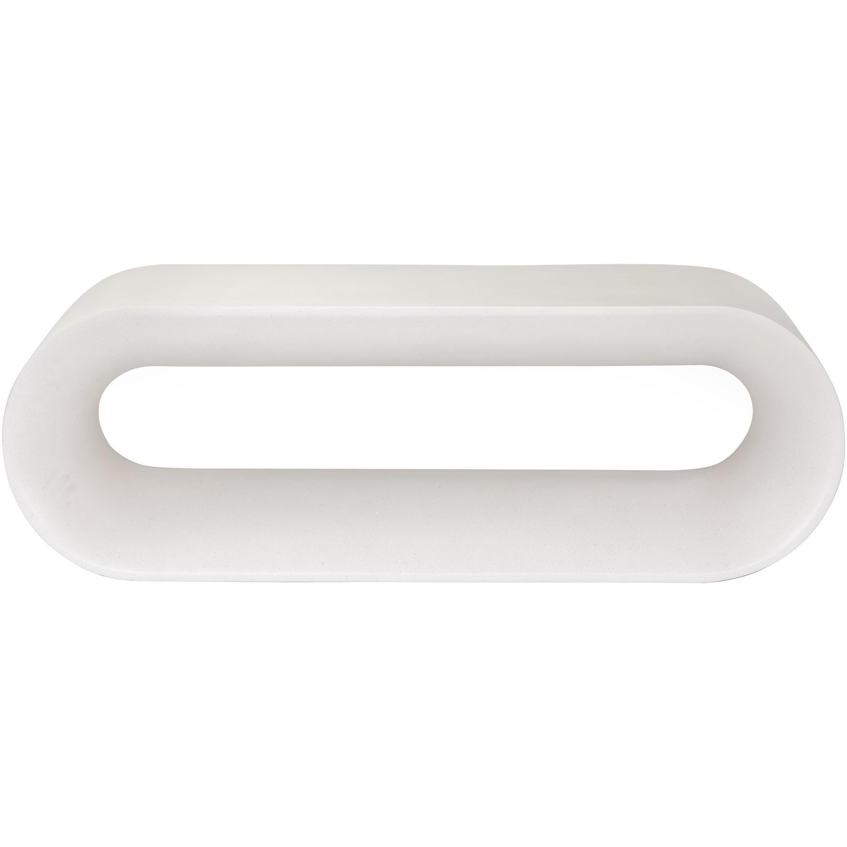 This contemporary white concrete bench combines unique form and function. Features a spacious bench with an open frame that can be used for storage. A versatile piece suitable for indoor and covered outdoor spaces. Crafted from a natural concrete mix, each piece will look different, with variations of white hues that will enhance over time.
