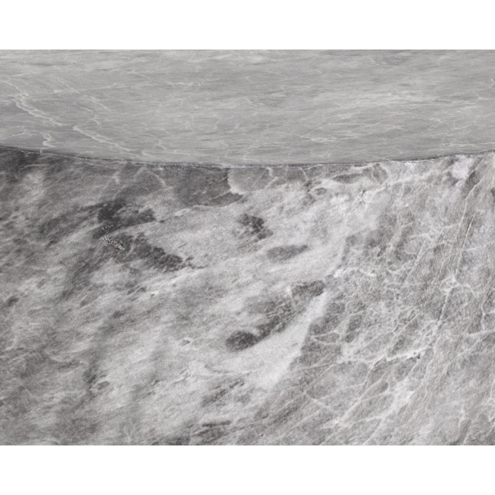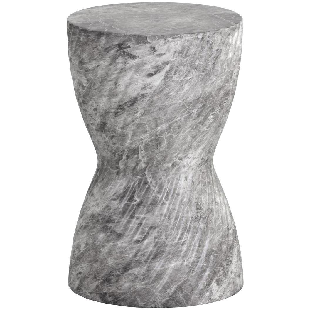 With a mesmerizing shape, this end table is well defined by its stunning swirl indentation on the base. Made with a grey faux marble finish on concrete. Suitable for indoor and outdoor covered spaces. Coordinating coffee table in white concrete also available.