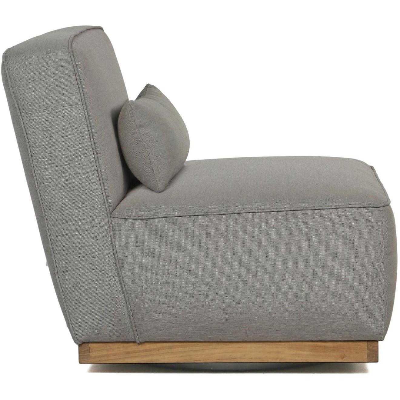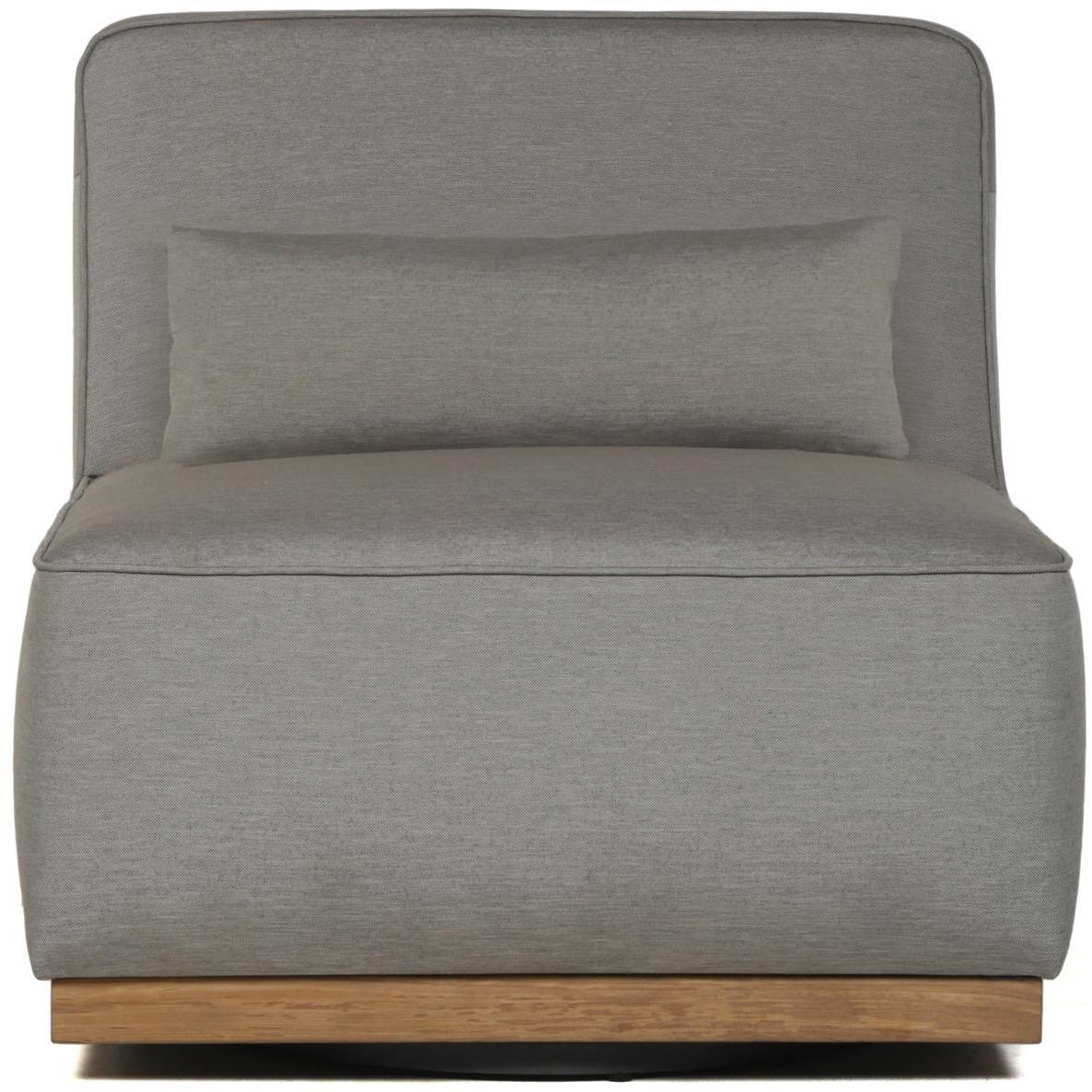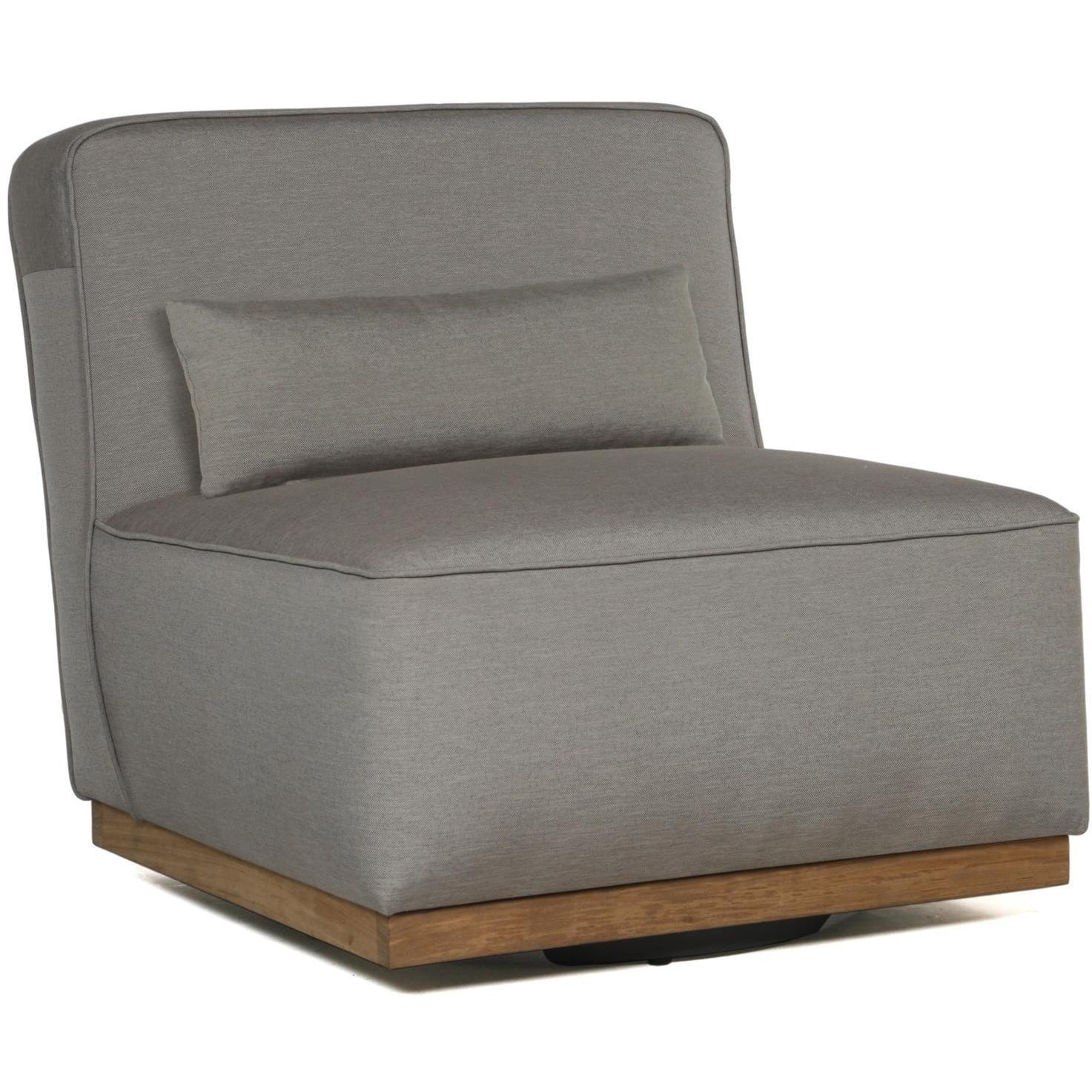 Modern with a contemporary flair, this armless swivel lounge chair from our Outdoor by SUNPAN collection will seat guests comfortably. Upholstered in palazzo taupe fabric with a teak wood base. Suitable for indoor and covered outdoor spaces.