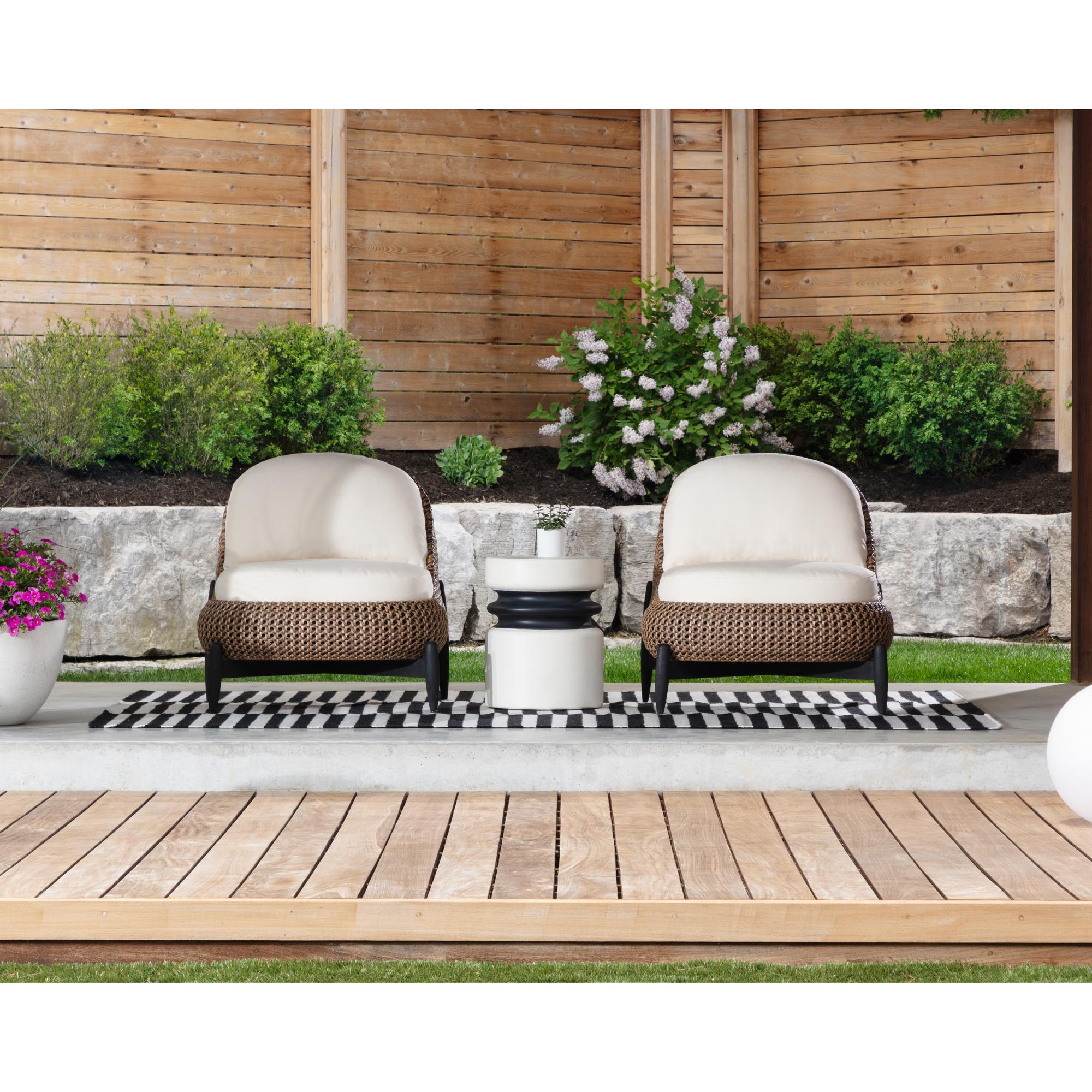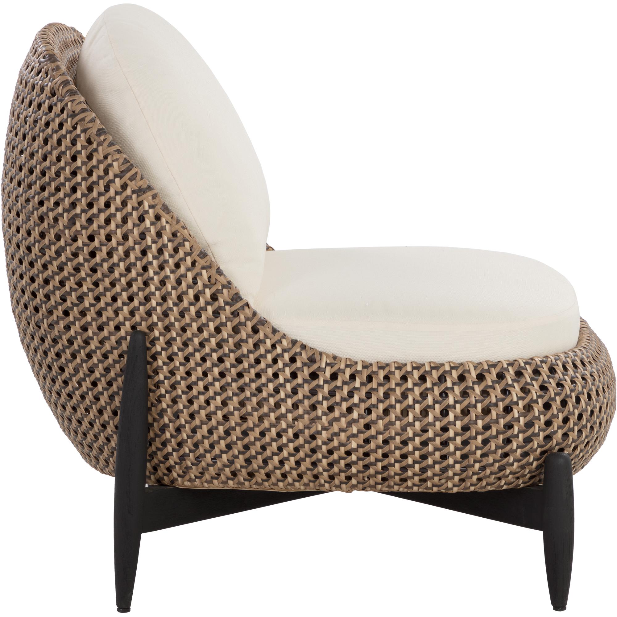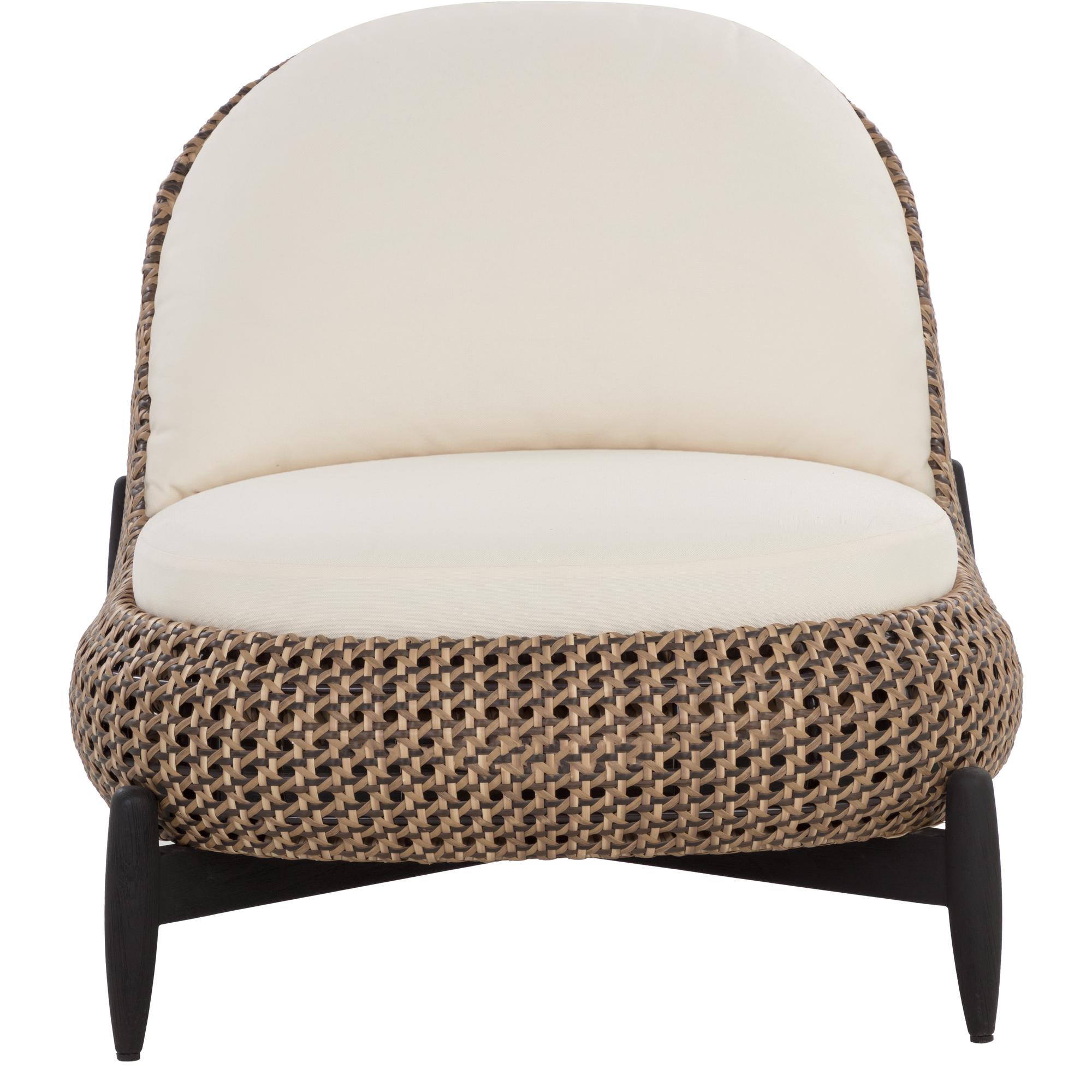 A curved, relaxed frame lends the Carilo Lounge Chair its playful modern form. Showcasing an expert mix of weather-resistant materials, this design boasts teak legs paired with a powder-coated aluminum frame featuring a sophisticated handwoven pattern made from synthetic wicker. Durable foam-filled cushions covered in performance fabric offer exceptional comfort and are removeable for effortless cleaning, making this outdoor lounge chair a perfect patio companion.