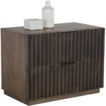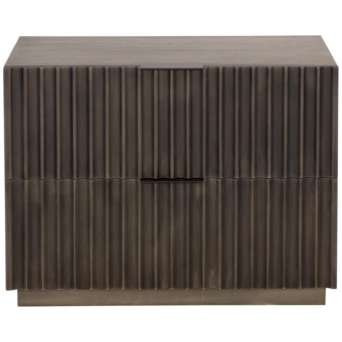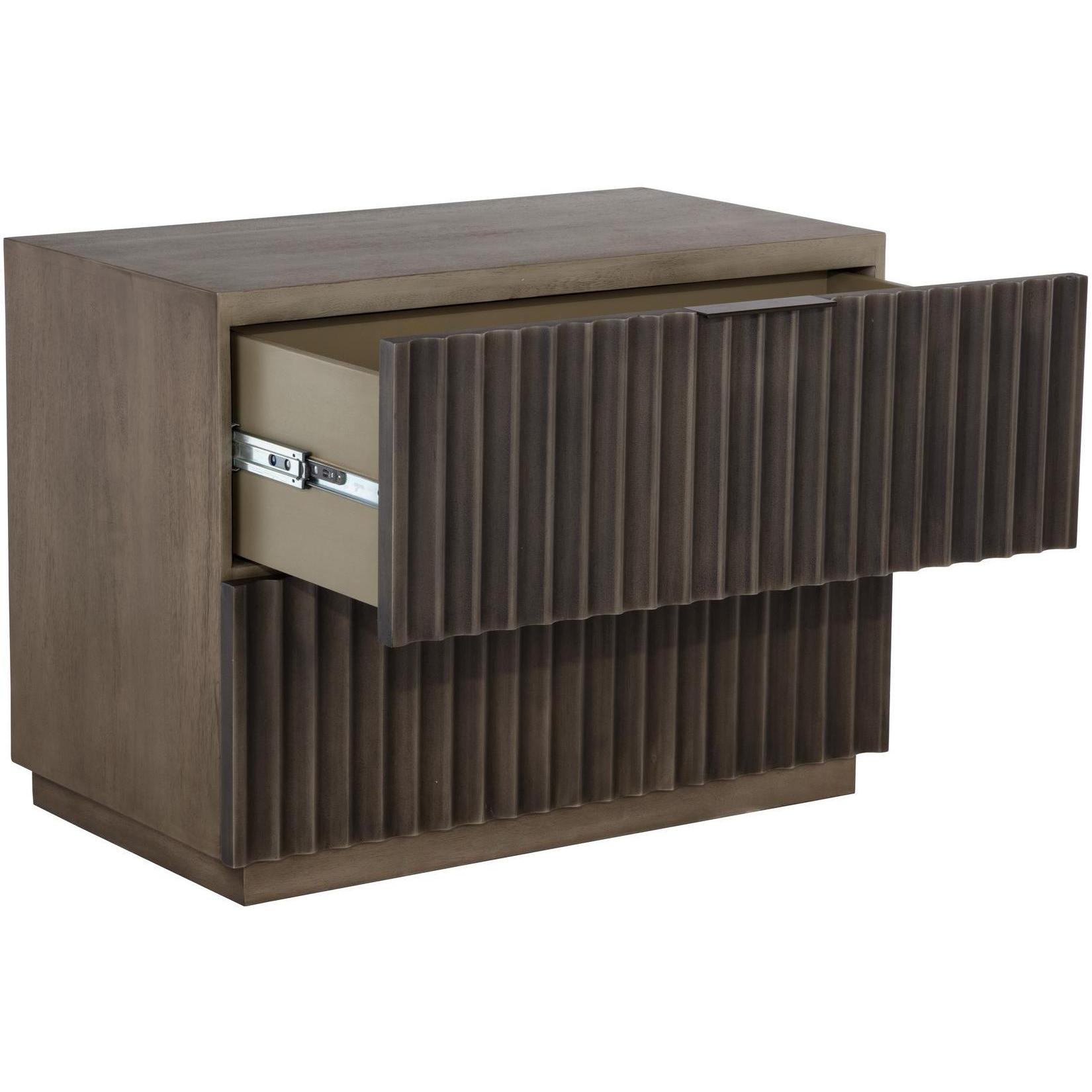 This bold nightstand will command attention in any bedroom space. Features a taupe mango wood frame with dramatic sculpted details on the face of the two drawers. Antique bronze powder coated aluminum handles complete the modern look. Sideboard version also available. As wood is an organic, porous material, these pieces will contain natural variation of texture and may also exhibit fine indentations and cracks. Wood pieces will also display a disparity of colour and grain, and visible knots and burls that add to the character of each piece. Made in India. With refined craftsmanship, this design was brought to life by skilled local artisans. By nature, these materials develop unique imperfections such as fissures, markings and colour variations for a truly one-of-a-kind piece.