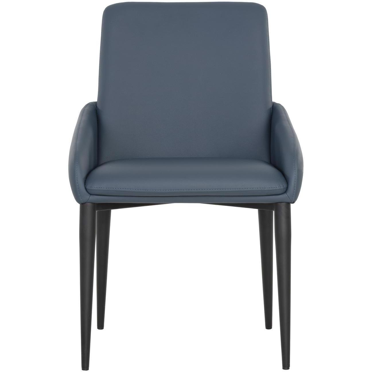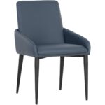 Add a touch of sophistication to dining spaces with this stylish dining armchair that features curved armrests. Upholstered in dillon thunder faux leather and features black powder-coated iron legs. Handle With Care: This design has been crafted with faux leather. Faux leather is manufactured to reflect the natural characteristics of leather; as such, colour variations, markings wrinkles, grooves, and light scratches are appreciated characteristics. No two pieces will be alike. Visit our Product Care page for more information on how to ensure the lasting beauty of this piece.