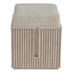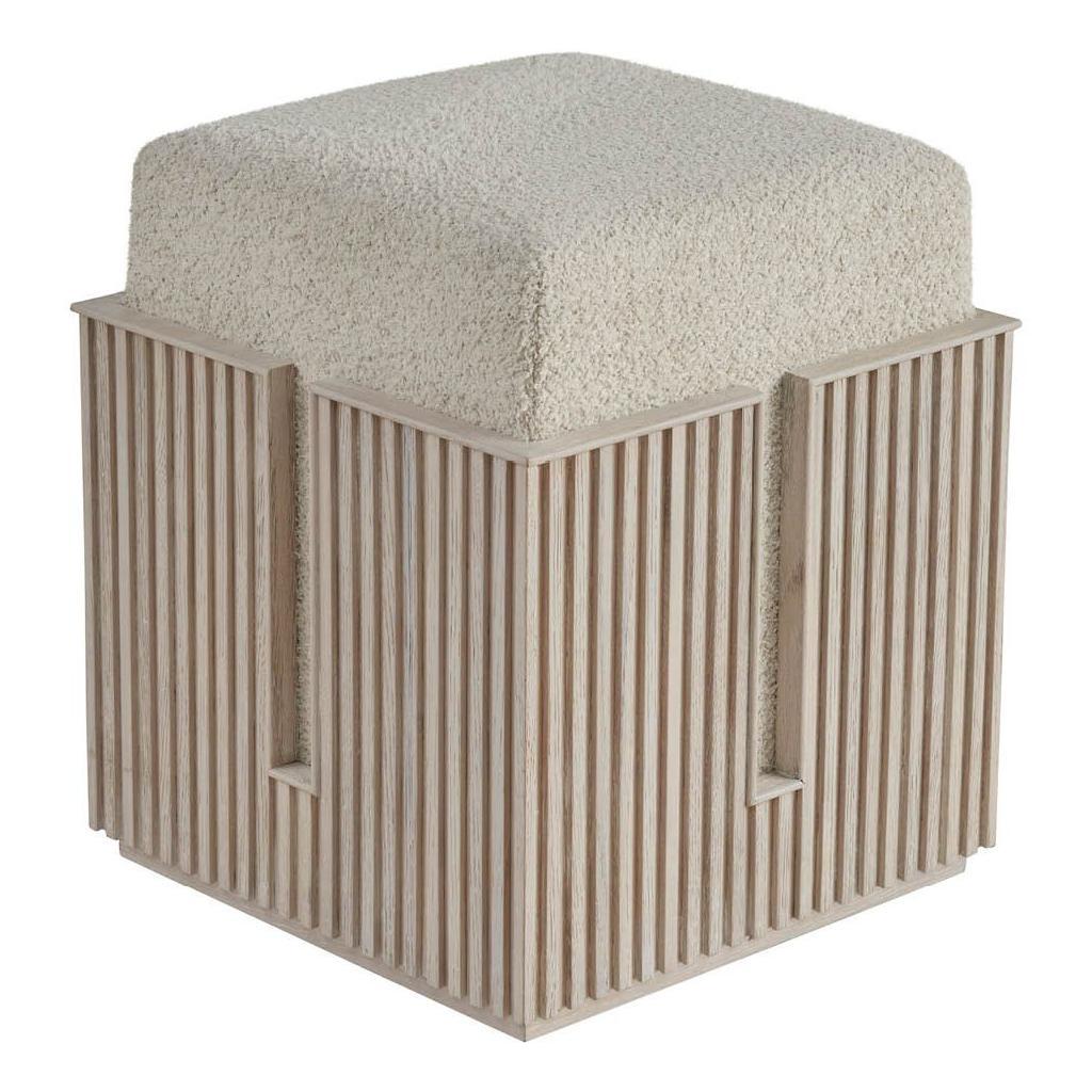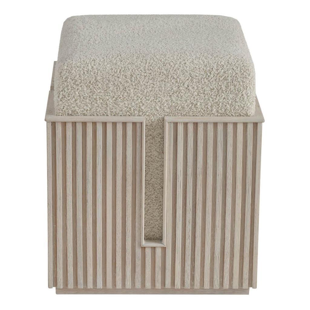 The Carmen Bunching Stool, a harmonious blend of form and function, is a versatile addition to any space. Its tambour-wrapped base, finished in a striking White Oak Finish, adds a touch of modern elegance. The cozy, upholstered top, wrapped in Sheldon Ivory fabric, provides a comfortable seating option.
