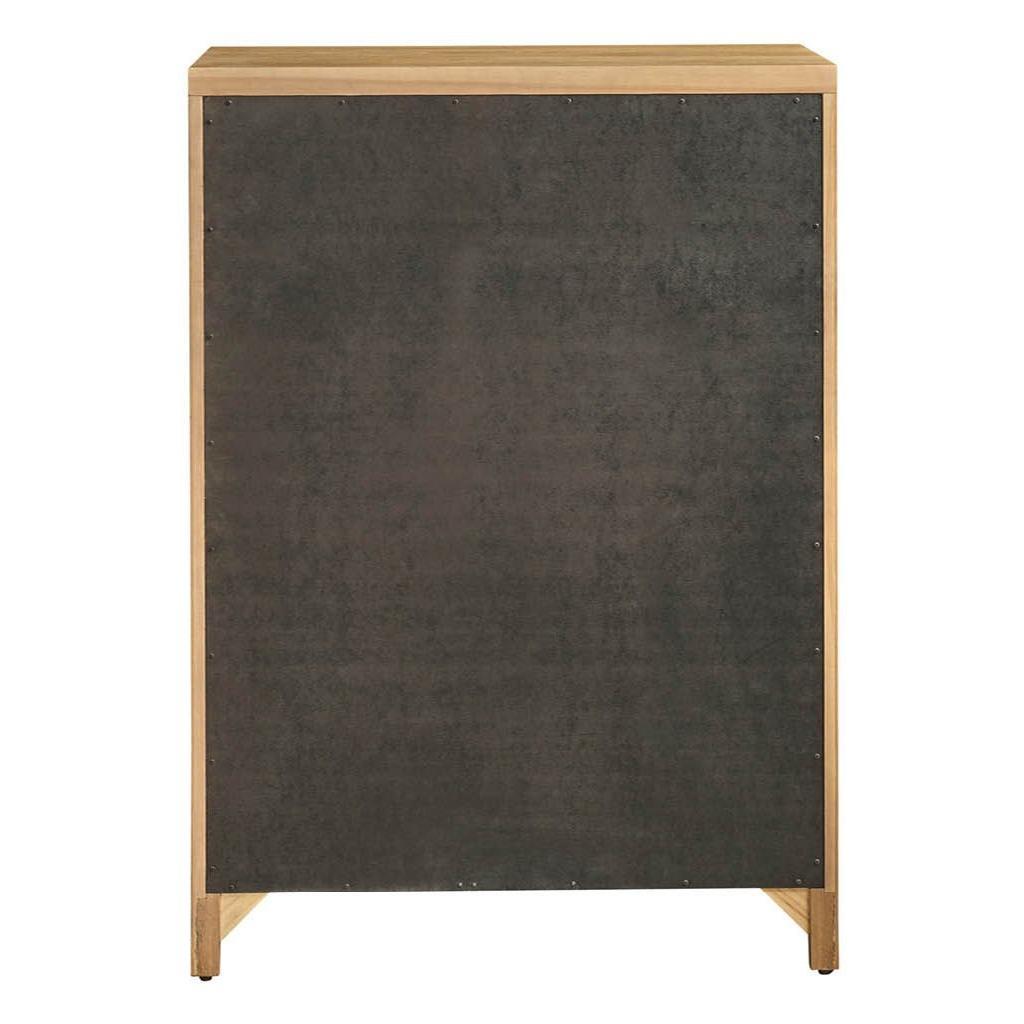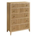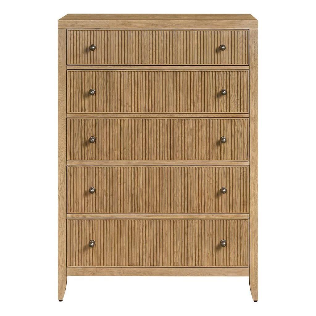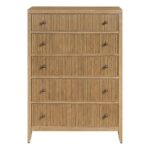 The Carmen Five-Drawer Chest is a striking piece of furniture that combines modern design with functional storage. Its tall silhouette, accented by distinctive vertical wood detailing, creates a sense of modern elegance. The five spacious drawers offer ample storage, while the rich finish adds a touch of sophistication. This versatile piece is a captivating addition to any bedroom.
