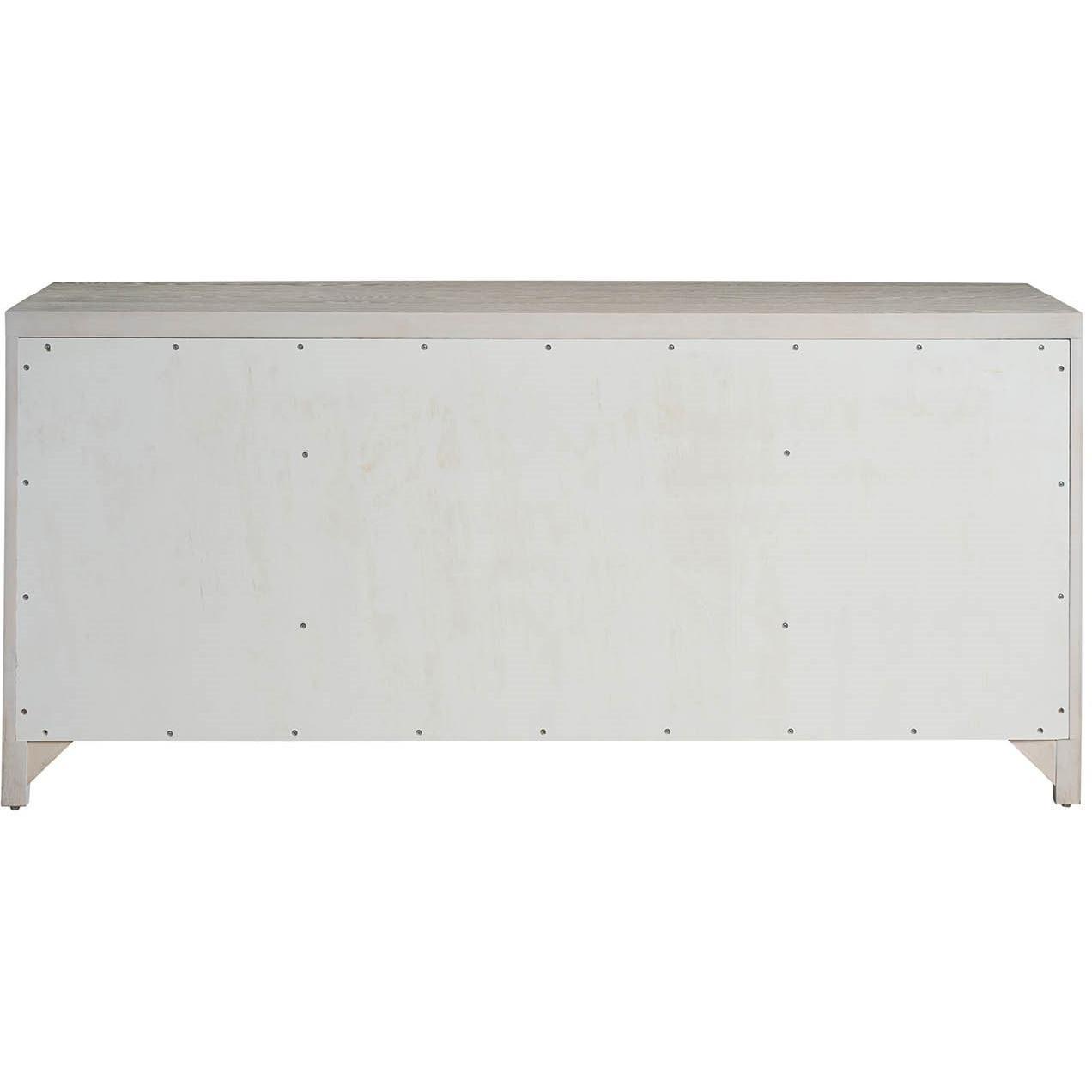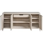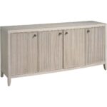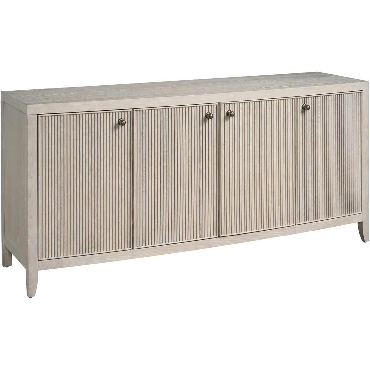 The Carmen Credenza, a sophisticated storage solution, offers ample space behind four doors with five adjustable shelves. Its distinctive, vertically textured design, complemented by sleek pulls and a White Oak finish, elevates any interior space.
