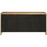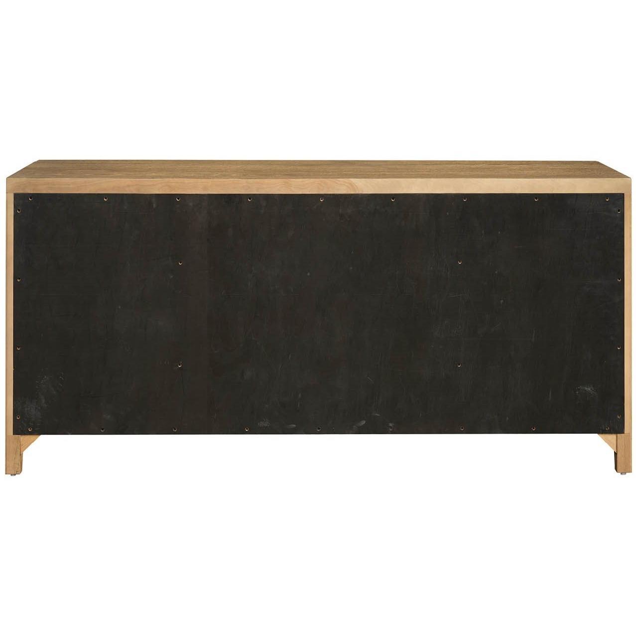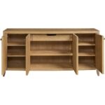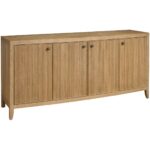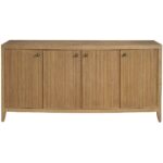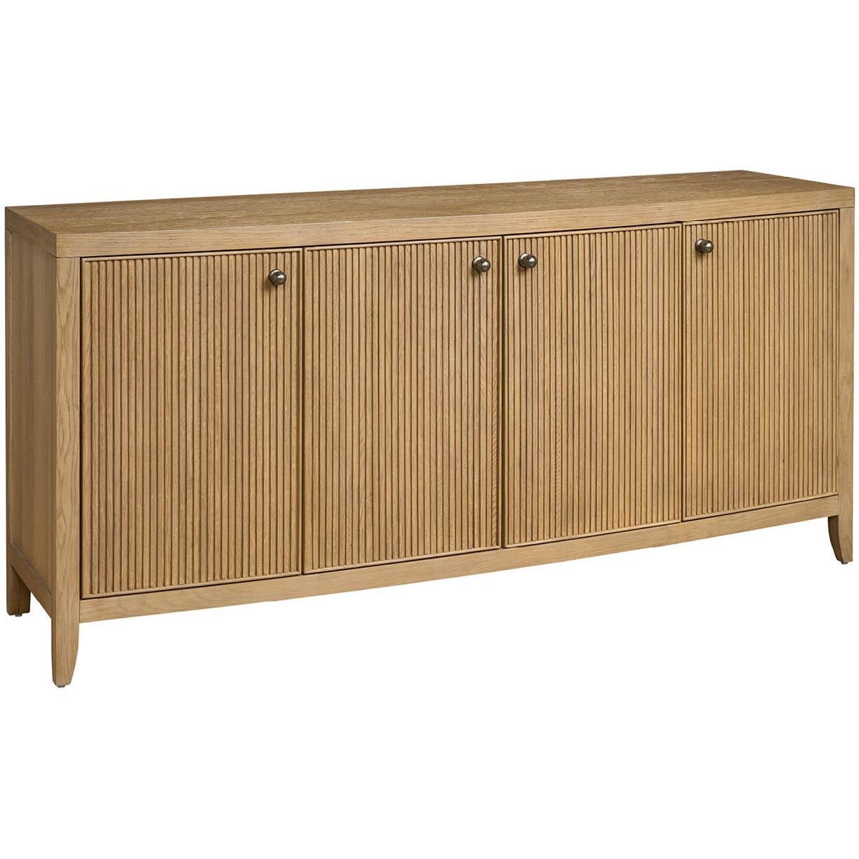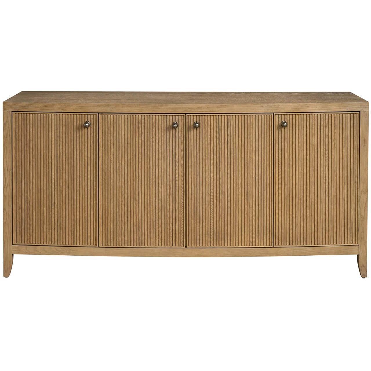 The Carmen Credenza, a sophisticated storage solution, offers ample space behind four doors with five adjustable shelves. Its distinctive, vertically textured design, complemented by sleek pulls and a Skylark Finish, elevates any interior space.