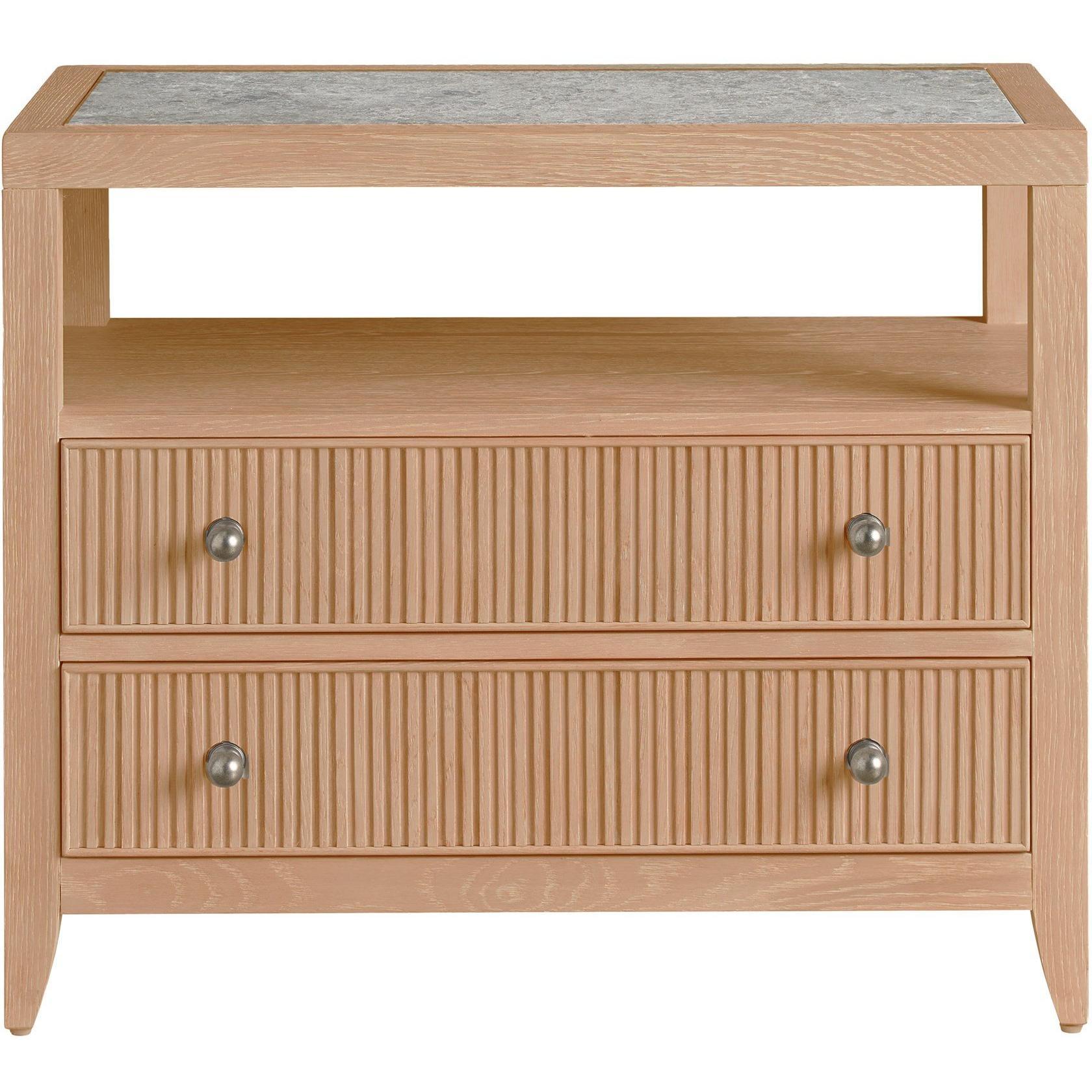 The Carmen Two-Drawer Nightstand is a stylish and functional addition to any bedroom. Its two spacious drawers, adorned with sleek metal ring pulls, offer ample storage for bedside essentials. The open shelf, accented by an inset stone top, adds a touch of luxury and provides a convenient space for displaying books or decorative objects.