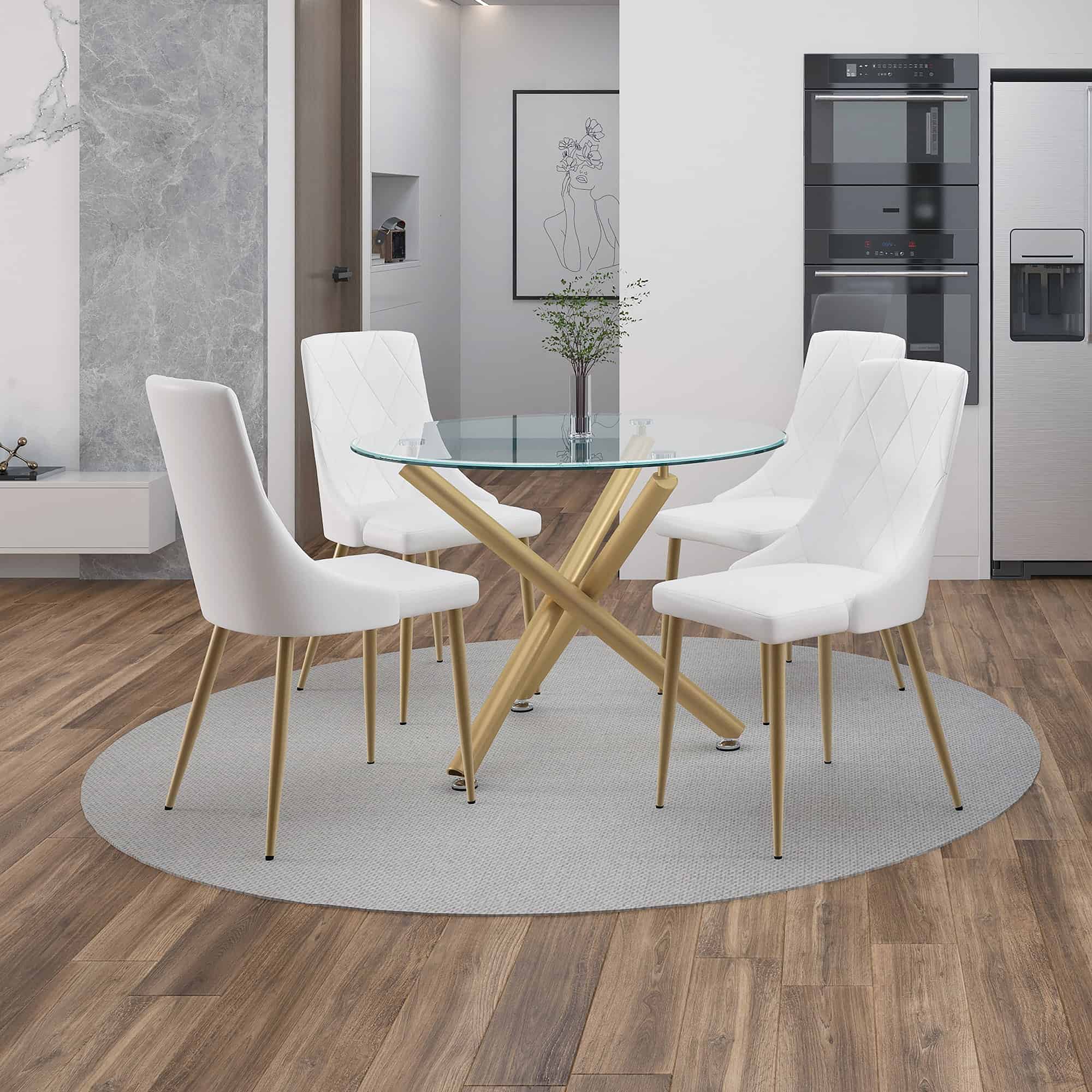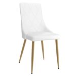 Incorporating a 10mm tempered clear glass tabletop on top of metal legs that have a matte gold finish, the illusion of crisscrossing geometric shapes makes this dining table a conversation starter. Detailed with chrome-finished glass holders and table feet, this dining table seamlessly blends a fun and visually interesting appearance with a captivating style. A perfect place to gather for meals, formal or casual. Composed of wood, faux leather, and metal, this side chair is a show stopper all its own. With its curved wood seat frame, seat cushion covered in faux leather upholstery with stitching details on the back, and chrome-finished metal legs, this chair unifies a multitude of elements all into one perfectly composed design. The comfortable seat allows for hours of conversation around the dinner table, while the slim, tapered look of the metal legs adds a splash of sophisticated design.