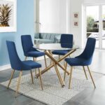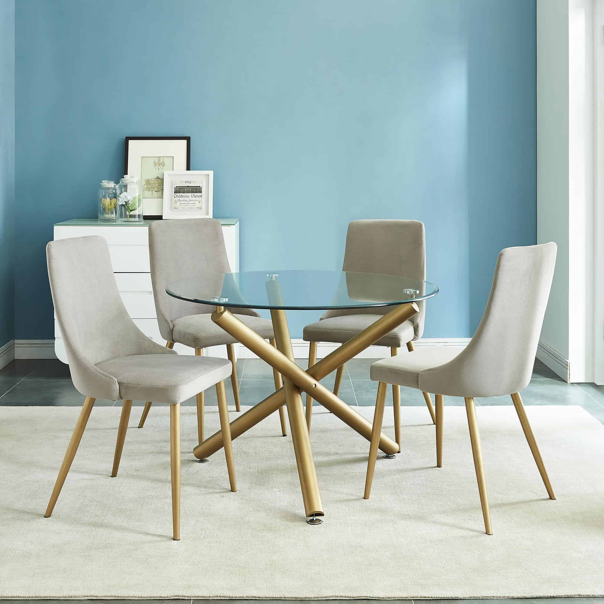 Combining metal and glass elements, this dining table is the perfect match for a variety of different chair styles. Incorporating a 10mm tempered clear glass tabletop on top of metal legs that have a matte aged gold finish, the illusion of crisscrossing geometric shapes makes this piece a conversation starter. Detailed with chrome-finished glass holders and table feet, this dining table seamlessly blends a fun and visually interesting appearance with a captivating style. A perfect place to gather for meals, formal or casual.
