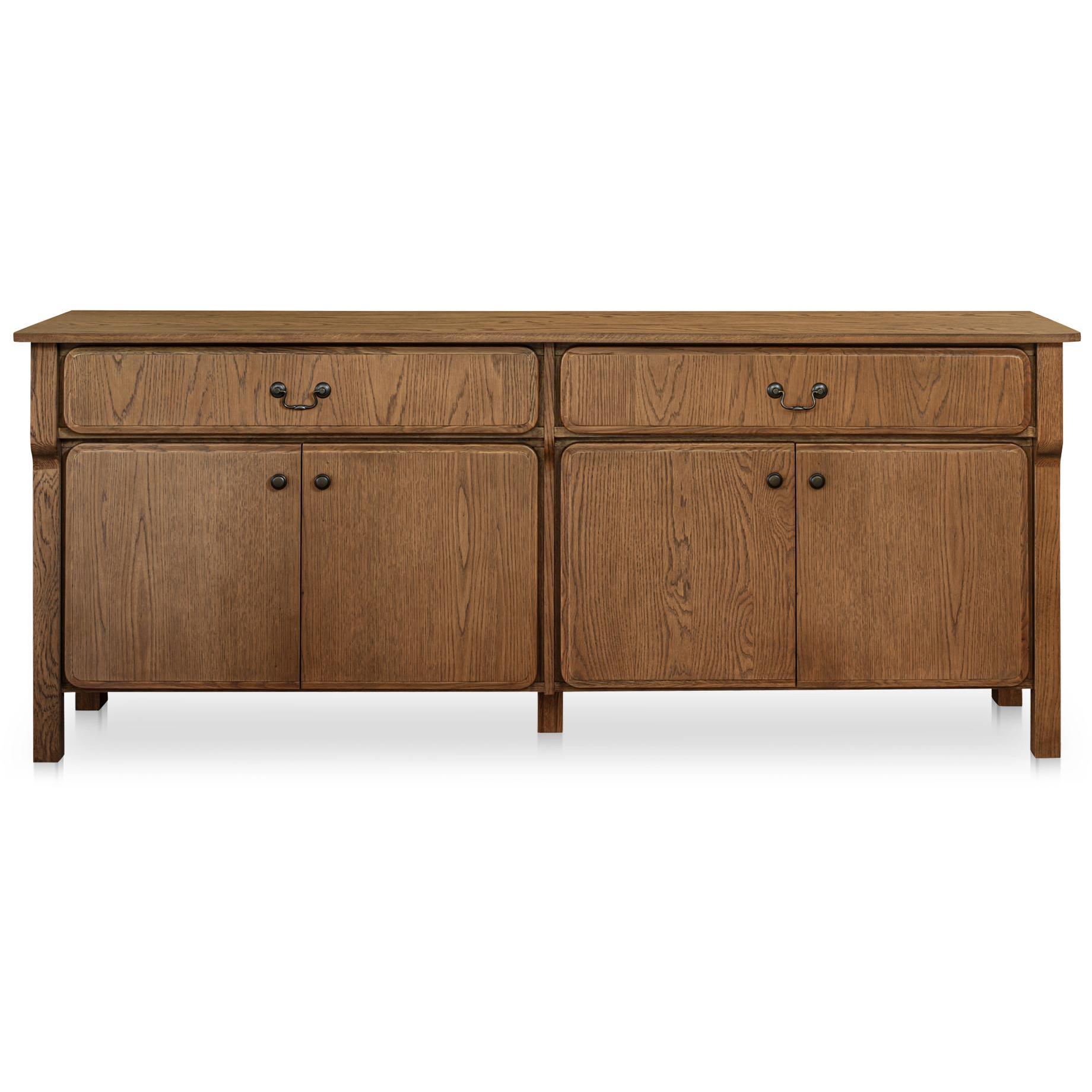 The Caroline sideboard features an overhanging top and curved front legs that soften its silhouette. Rounded edges on the drawers and doors echo the leg curvature, adding fluidity and grace. This piece features two drawers and four doors accented with refined handles and knobs and finished in a mid-tone brown with a wire-brushed texture.