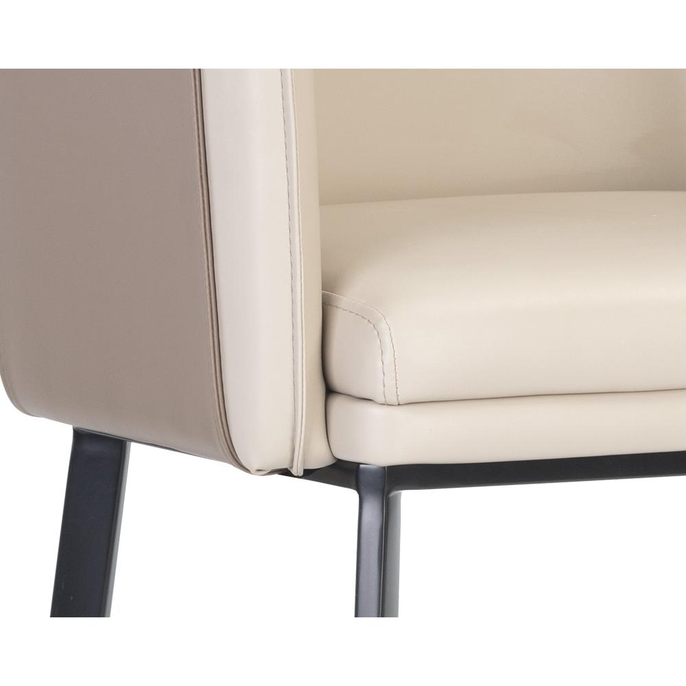 A unique barrel back counter stool upholstered in supple napa beige faux leather and accented with a contrasting exterior in napa tan faux leather. Finished with black steel legs and copper foot caps. Suitable for residential and commercial spaces. Handle With Care: This design has been crafted with faux leather. Faux leather is manufactured to reflect the natural characteristics of leather; as such, colour variations, markings wrinkles, grooves, and light scratches are appreciated characteristics. No two pieces will be alike. Visit our Product Care page for more information on how to ensure the lasting beauty of this piece.