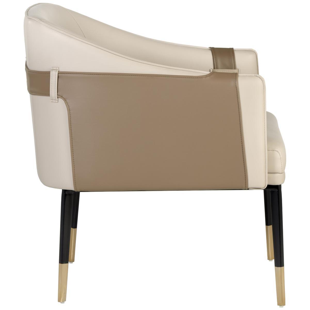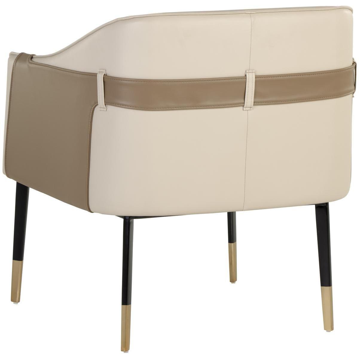 A unique barrel back lounge chair upholstered in supple napa beige faux leather and accented with a contrasting exterior in napa tan faux leather. Finished with black steel legs and copper foot caps. Suitable for residential and commercial spaces. Handle With Care: This design has been crafted with faux leather. Faux leather is manufactured to reflect the natural characteristics of leather; as such, colour variations, markings wrinkles, grooves, and light scratches are appreciated characteristics. No two pieces will be alike.