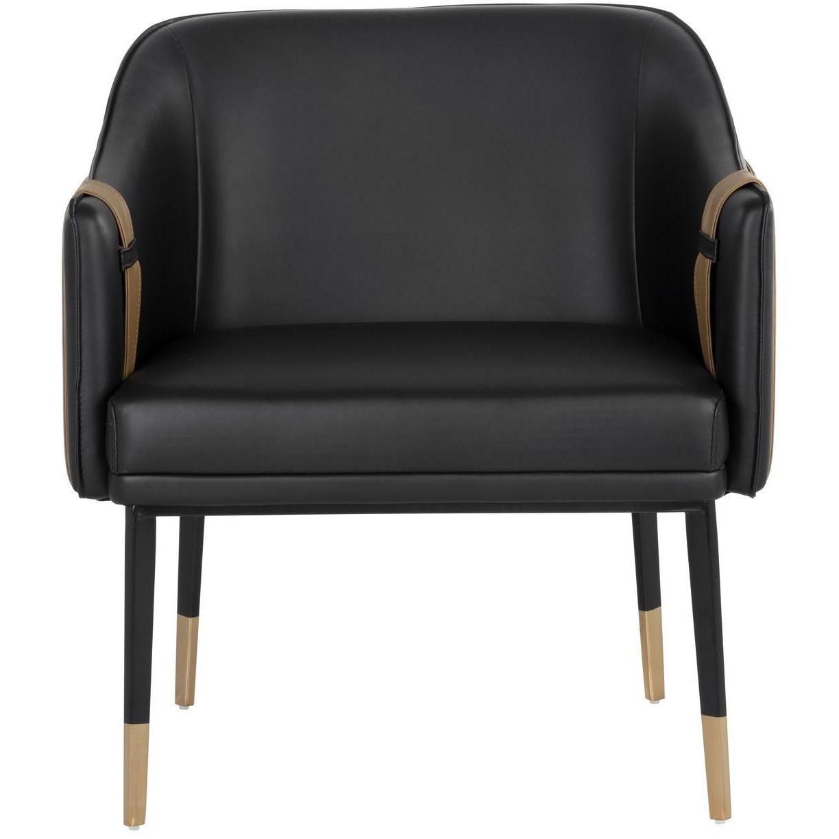 A unique barrel back lounge chair upholstered in supple napa black faux leather and accented with a contrasting exterior in napa cognac faux leather. Finished with black steel legs and copper foot caps. Suitable for residential and commercial spaces. Handle With Care: This design has been crafted with faux leather. Faux leather is manufactured to reflect the natural characteristics of leather; as such, colour variations, markings wrinkles, grooves, and light scratches are appreciated characteristics. No two pieces will be alike. Visit our Product Care page for more information on how to ensure the lasting beauty of this piece.