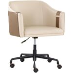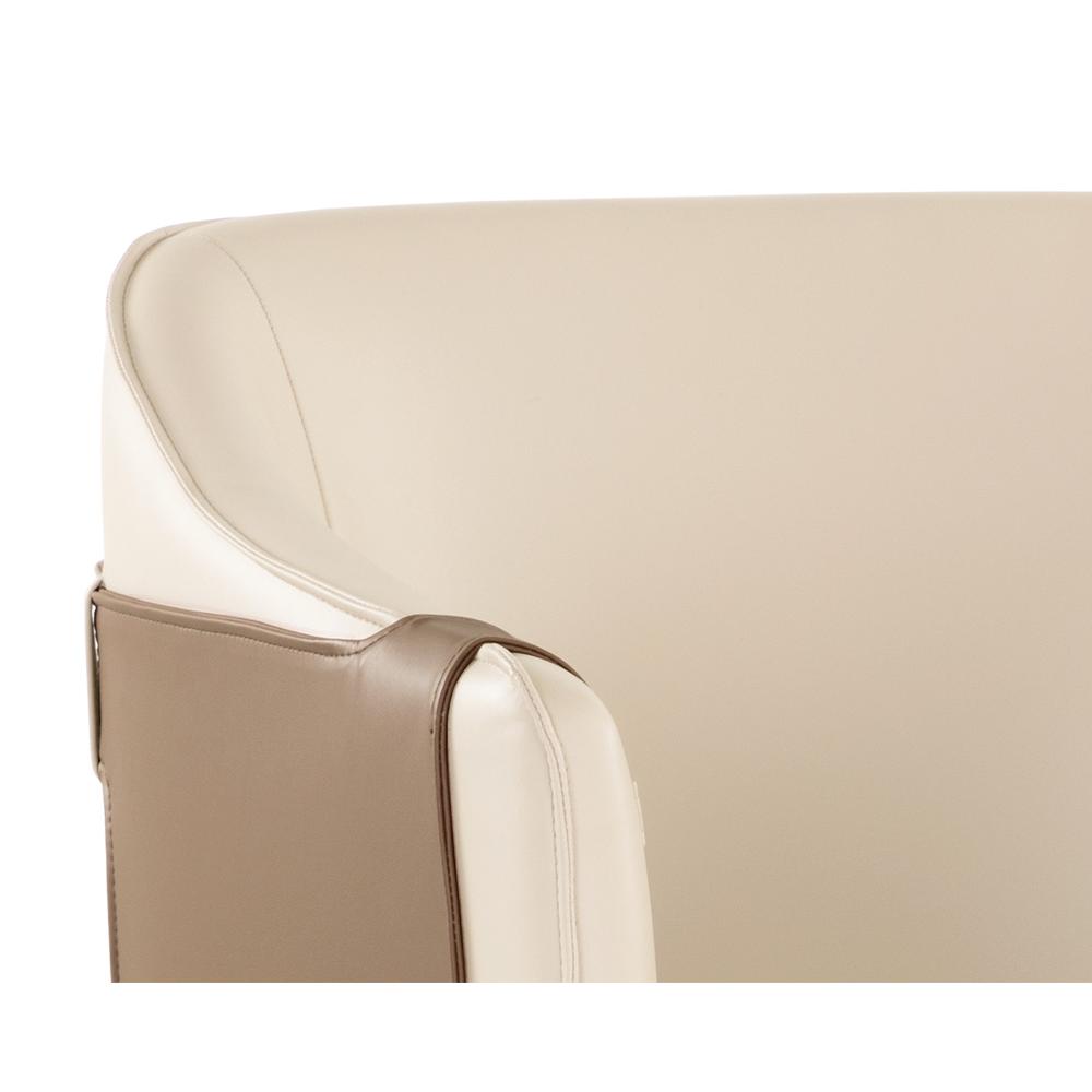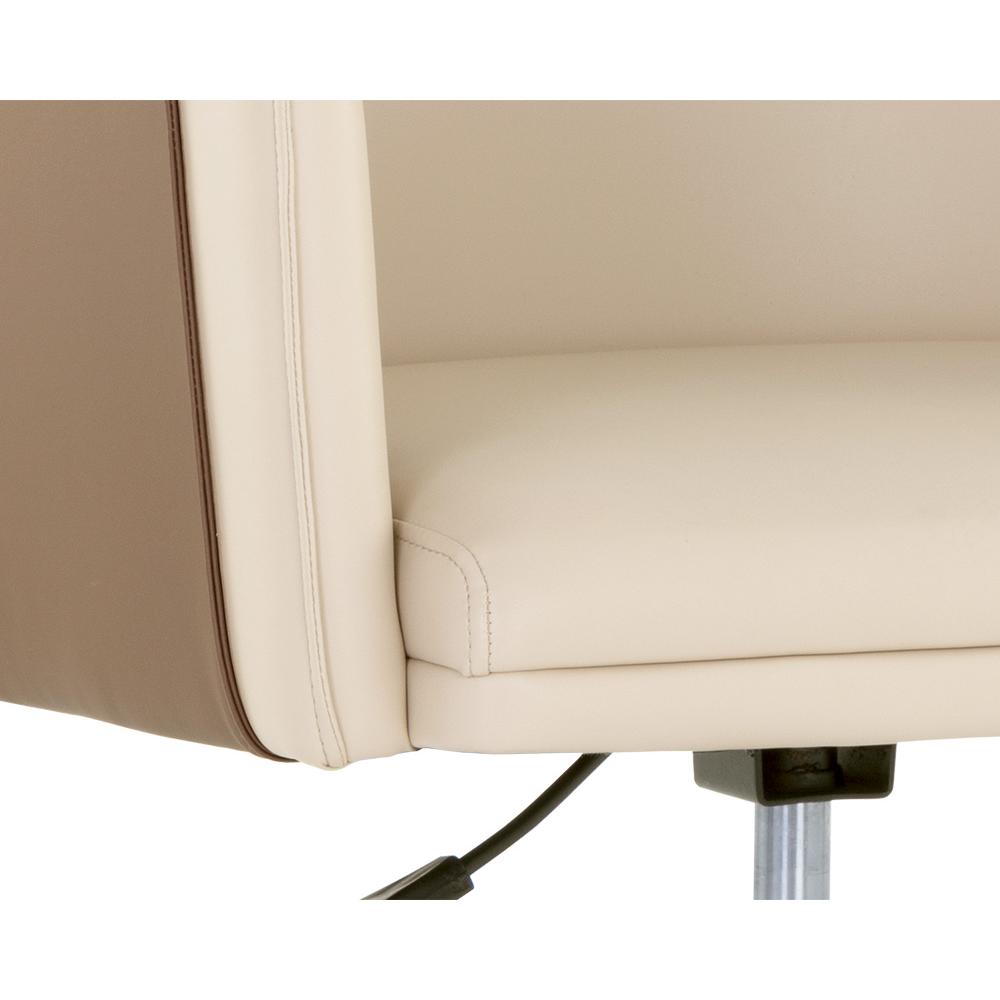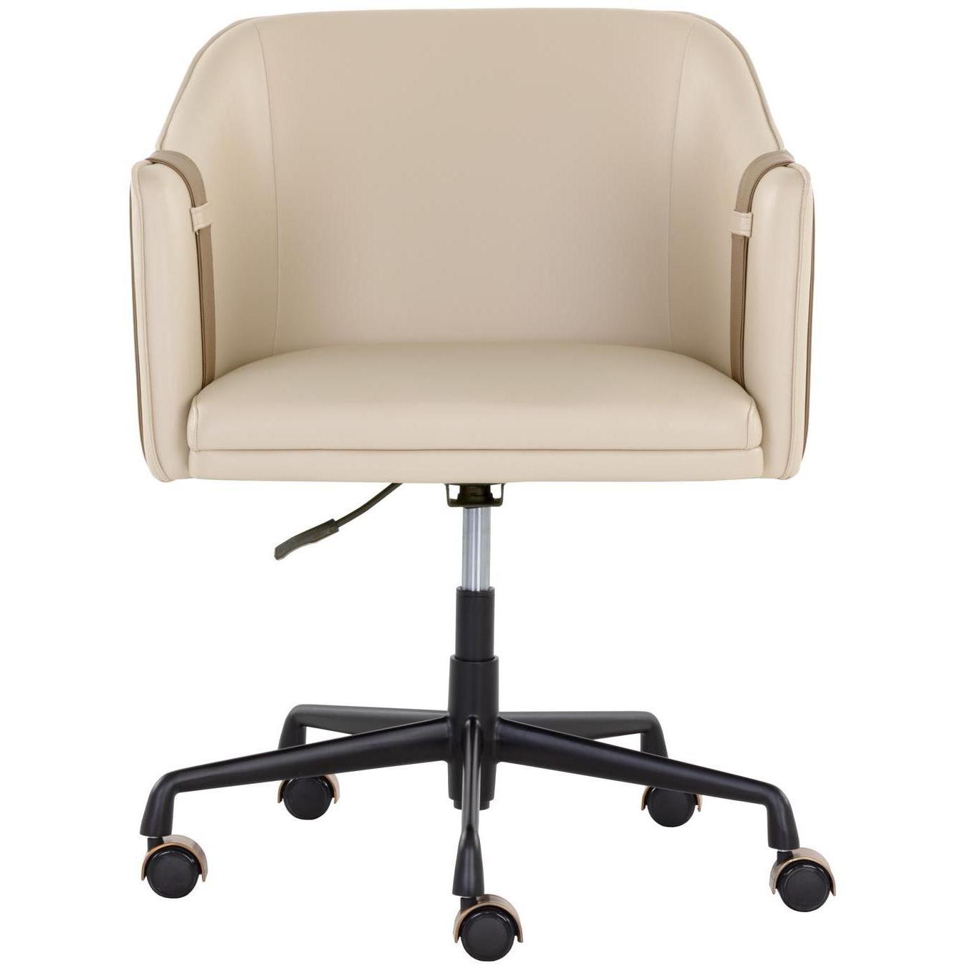 A unique barrel back office chair upholstered in supple napa beige faux leather and accented with a contrasting exterior in napa tan faux leather. Black powder coated aluminum legs with gold castors complete the look. Also available in napa black with cognac faux leather combination. Handle With Care: This design has been crafted with faux leather. Faux leather is manufactured to reflect the natural characteristics of leather; as such, colour variations, markings wrinkles, grooves, and light scratches are appreciated characteristics. No two pieces will be alike.