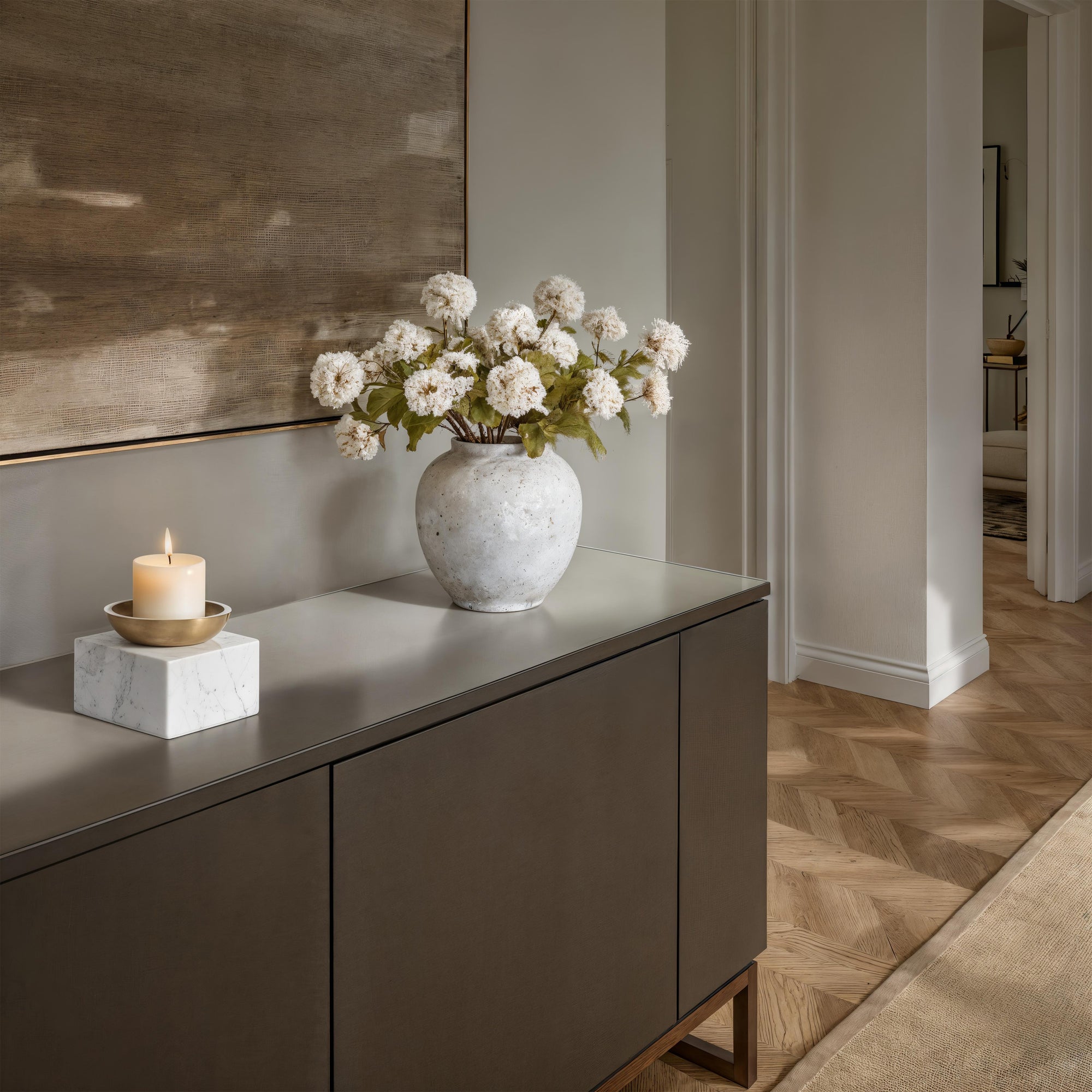 Set the mood instantly with the warm, luxe vibe of the Carvella candle holder. Gold-plated cast aluminum pairs with Banswara marble’s creamy white veining for a look that feels modern, classic, and unmistakably elevated. Just add your favorite candle and let the soft glow bring cozy elegance to any room.