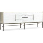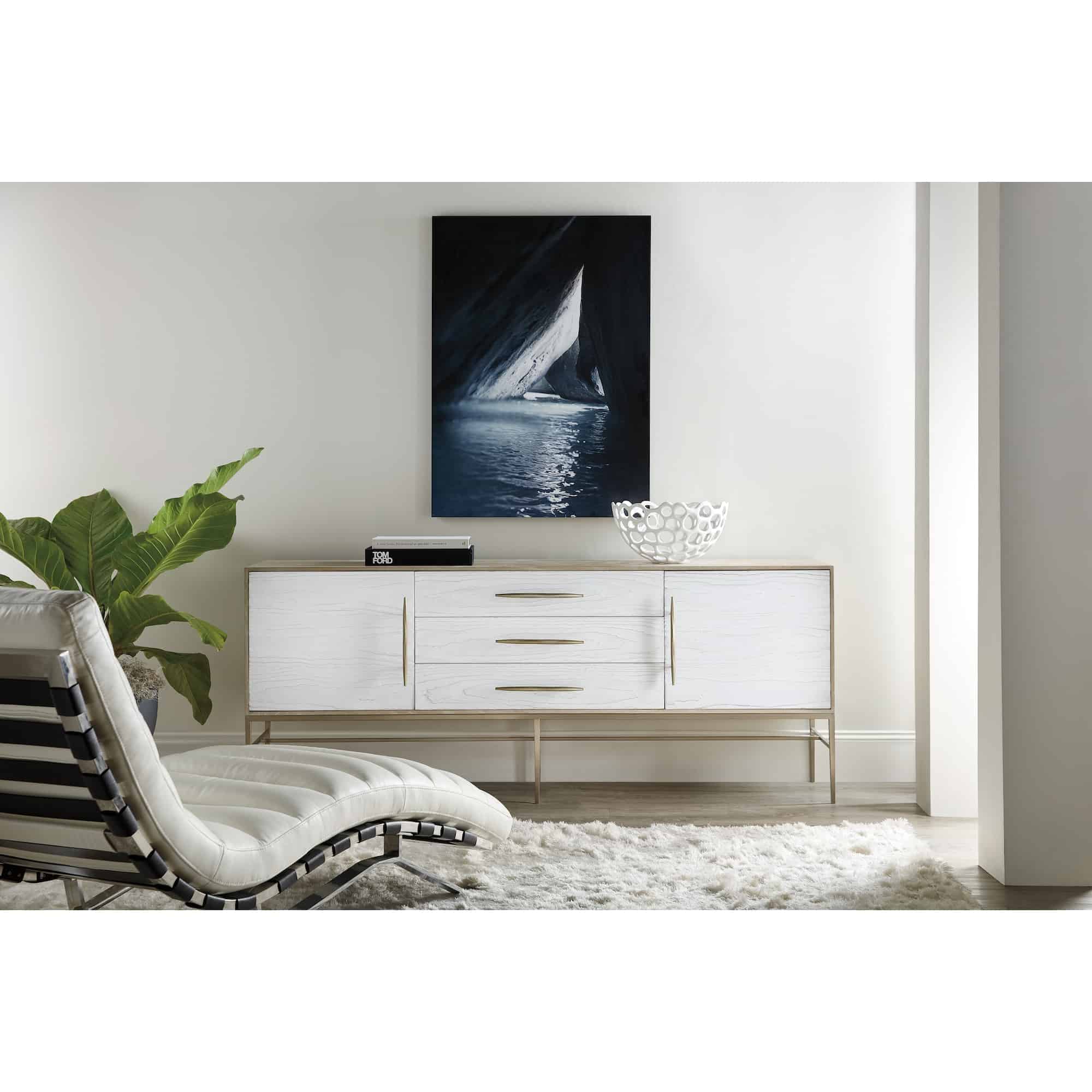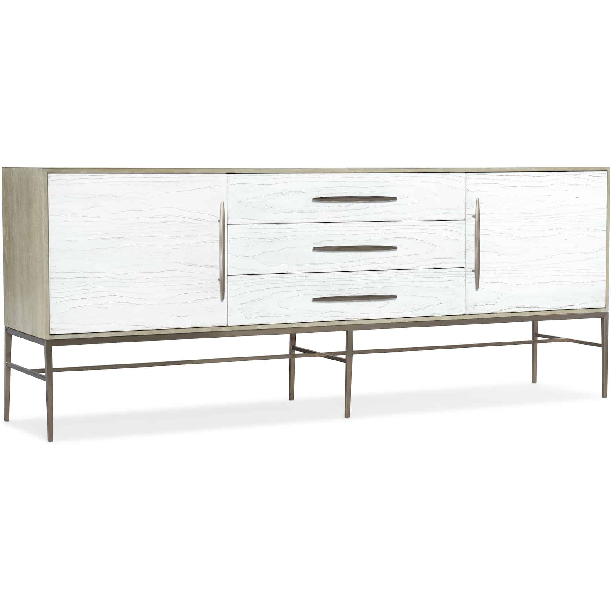 Finish: Outside of case: Terrain: a soft, taupe finish on oak veneers. Distressing includes dry brushing. Drawer and door fronts: Chalk: cast resin in a soft, white finish. Champagne colored bar pull hardware and metal base.