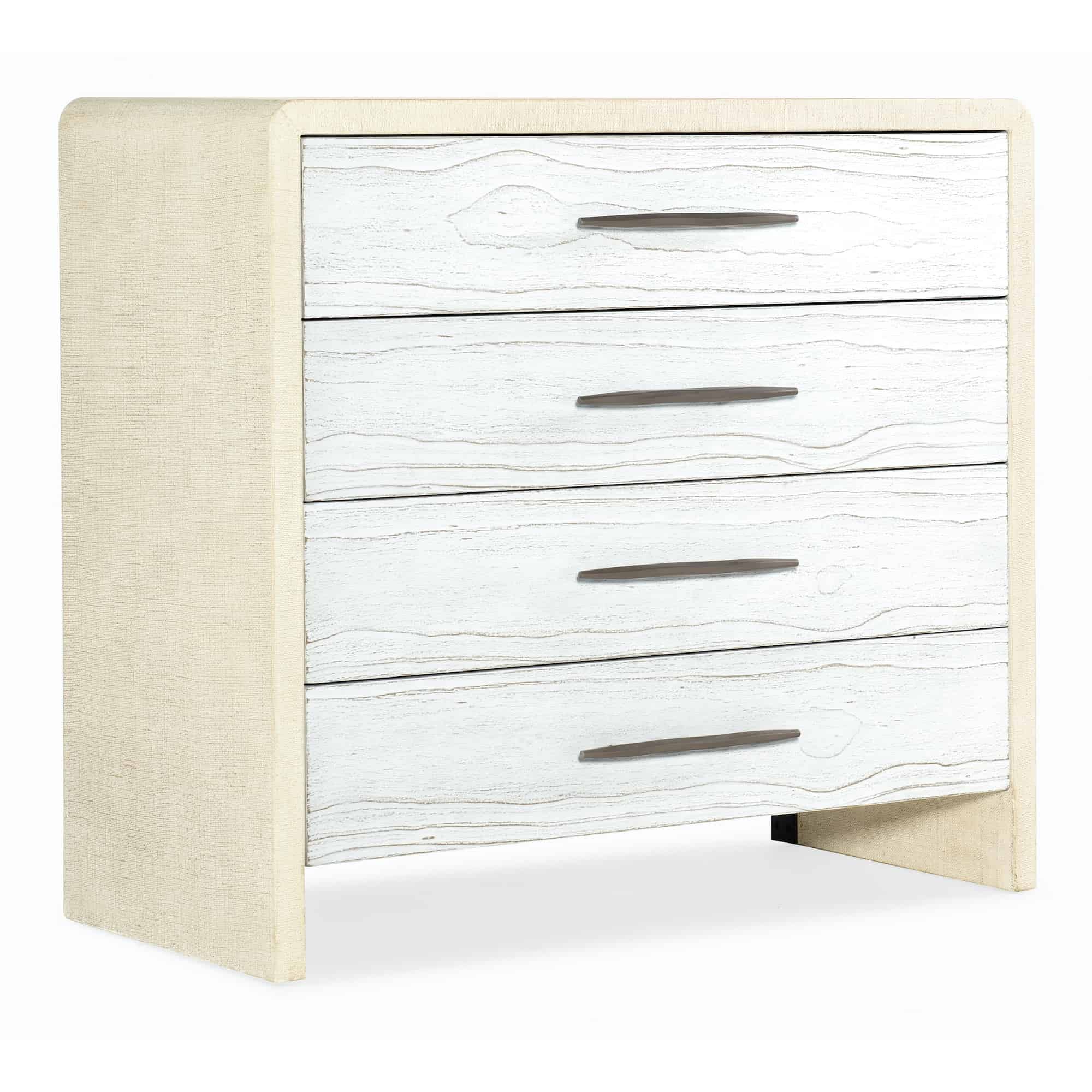 Finish: Outside of case: Pebble Beach: lacquered burlap finish. Drawer fronts: Chalk: cast resin in a soft, white finish. Champagne colored bar pull hardware.