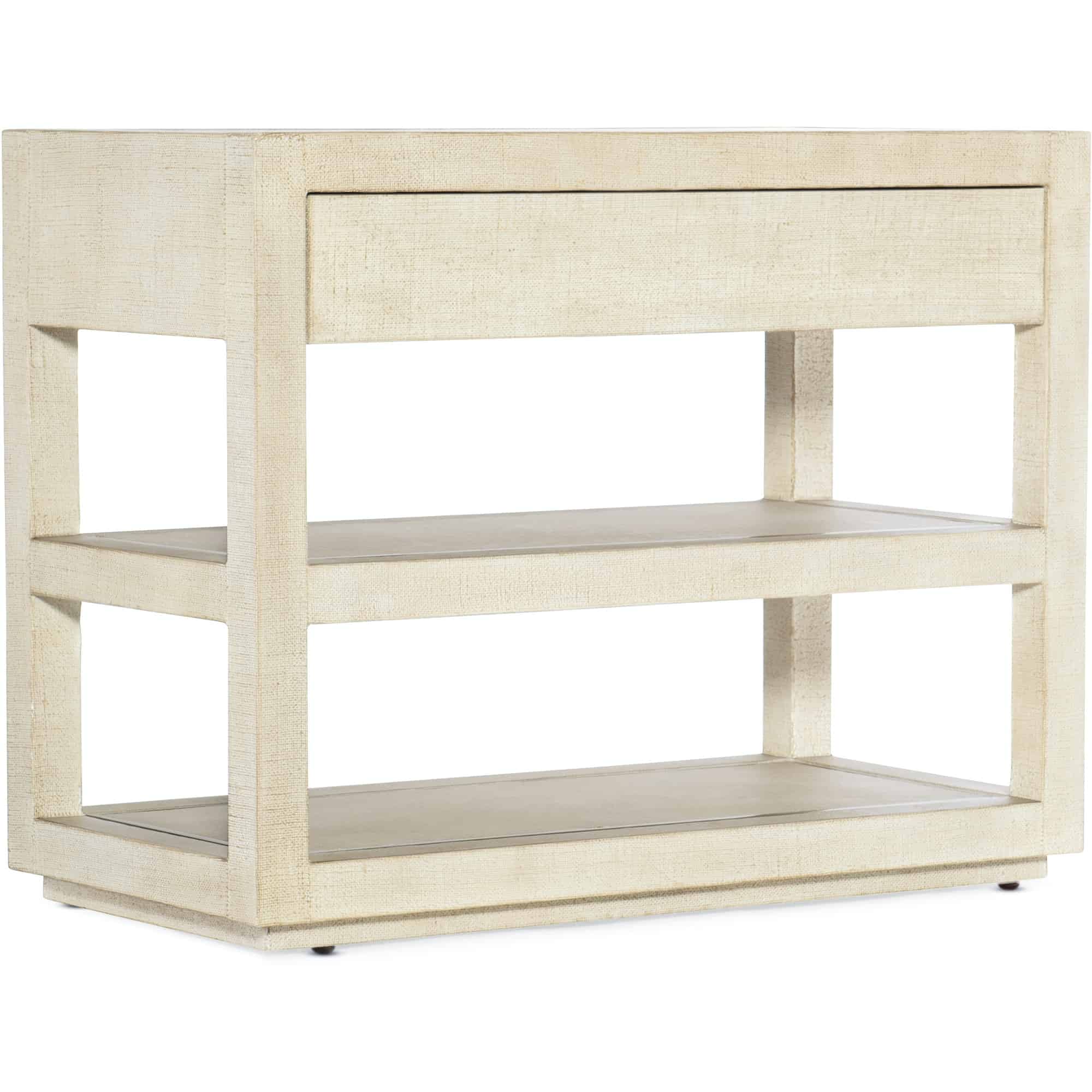 - Finish: Pebble Beach: lacquered burlap finish. Champagne colored metal inlay around top, middle shelf and bottom shelf.
